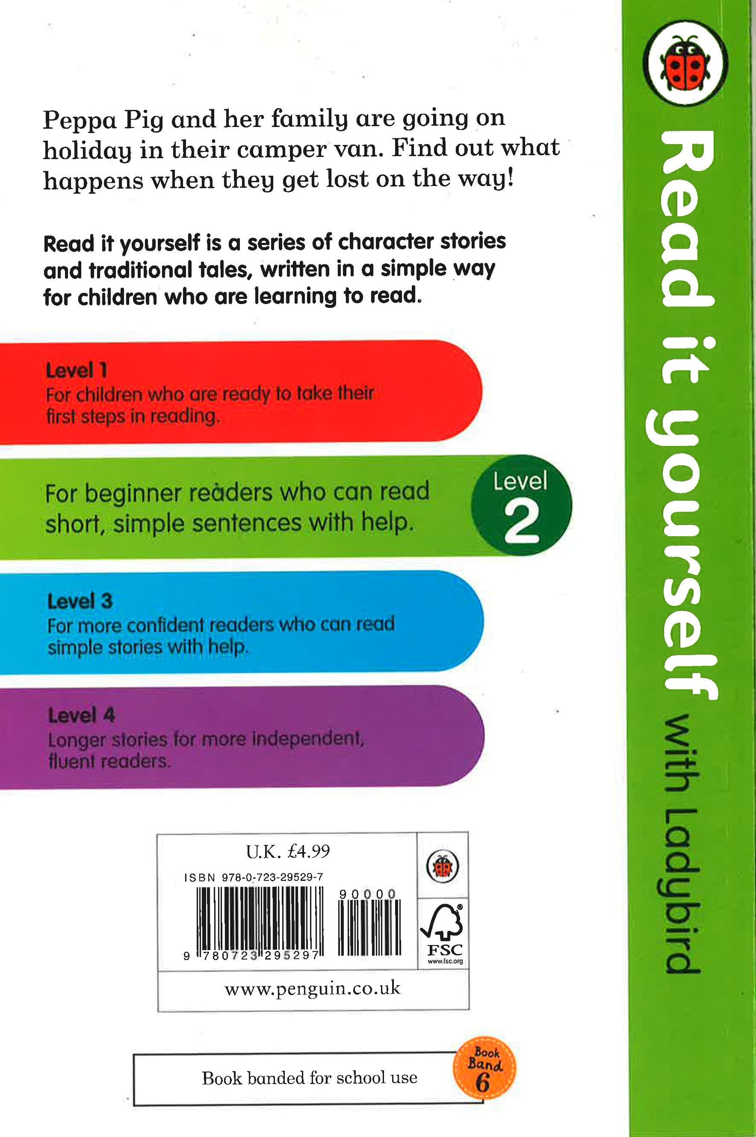 Peppa Pig and her family are going on holiday in their camper van. Find out what happens when they get lost on the way! Read it yourself with Ladybird is one of Ladybird's best-selling reading series. For over thirty-five years it has helped young children who are learning to read develop and improve their reading skills. Each Read it yourself book is very carefully written to include many key, high-frequency words that are vital for learning to read, as well as a limited number of story words that are introduced and practised throughout. Simple sentences and frequently repeated words help to build the confidence of beginner readers and the four different levels of books support children all the way from very first reading practice through to independent, fluent reading. There are more than ninety titles in the Read it yourself series, ranging from classic fairy tales and traditional world stories to favourite children's brands such as Peppa Pig, Angry Birds and Peter Rabbit. All-new, first reference titles complete the range, with information books about favourite subjects that even the most reluctant readers will enjoy. Each book has been carefully checked by educational consultants and can be read independently at home or used in a guided reading session at school. Further content includes comprehension questions or puzzles, helpful notes for parents, carers and teachers, and book band information for use in schools. Peppa Pig: Camping Trip is a Level 2 Read it yourself book, ideal for children who have received some initial reading instruction and can read short, simple sentences with help.