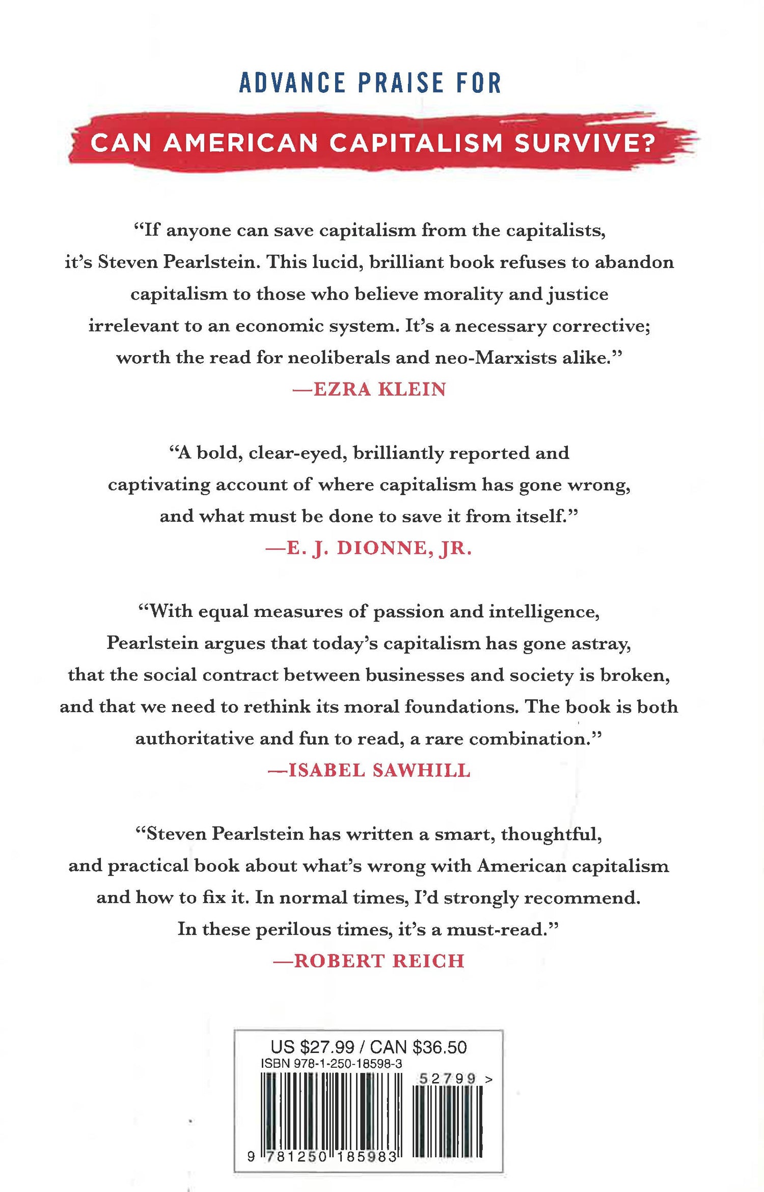 Thirty years ago, “maximising shareholder value” became the new business mantra, ushered in by Gordon Gekko and adopted over time across every layer of our economy. Since then, free market capitalism has lifted more than a billion people from poverty around the world. But in the U.S., most of the benefits have been captured by the richest 10%, along with providing justification for cheating customers, avoiding taxes, and leaving communities in the lurch. Today, Americans are losing faith that a free market economy is the best system - they're feeling it in their wallets and they're showing it in the voting booth. In Can American Capitalism Survive?, Pulitzer Prize-winning journalist Steven Pearlstein chronicles our descent and challenges the theories being taught in business schools and exercised in boardrooms around the country. We’re missing a key tenet of Adam Smith’s wealth of nations: without trust and social capital, democratic capitalism cannot survive. He challenges the blind assumptions of free market cheerleaders and puts forth an undeniable argument that equality need not come at the expense of economic growth. Pearstein lays out bold steps we can take as a country, addressing national service, tax code changes to incentivize companies to share profits with employees, educational opportunity, and more. He provides a path forward that will bring capitalism back to the people, and ultimately ensure prosperity for generations to come.