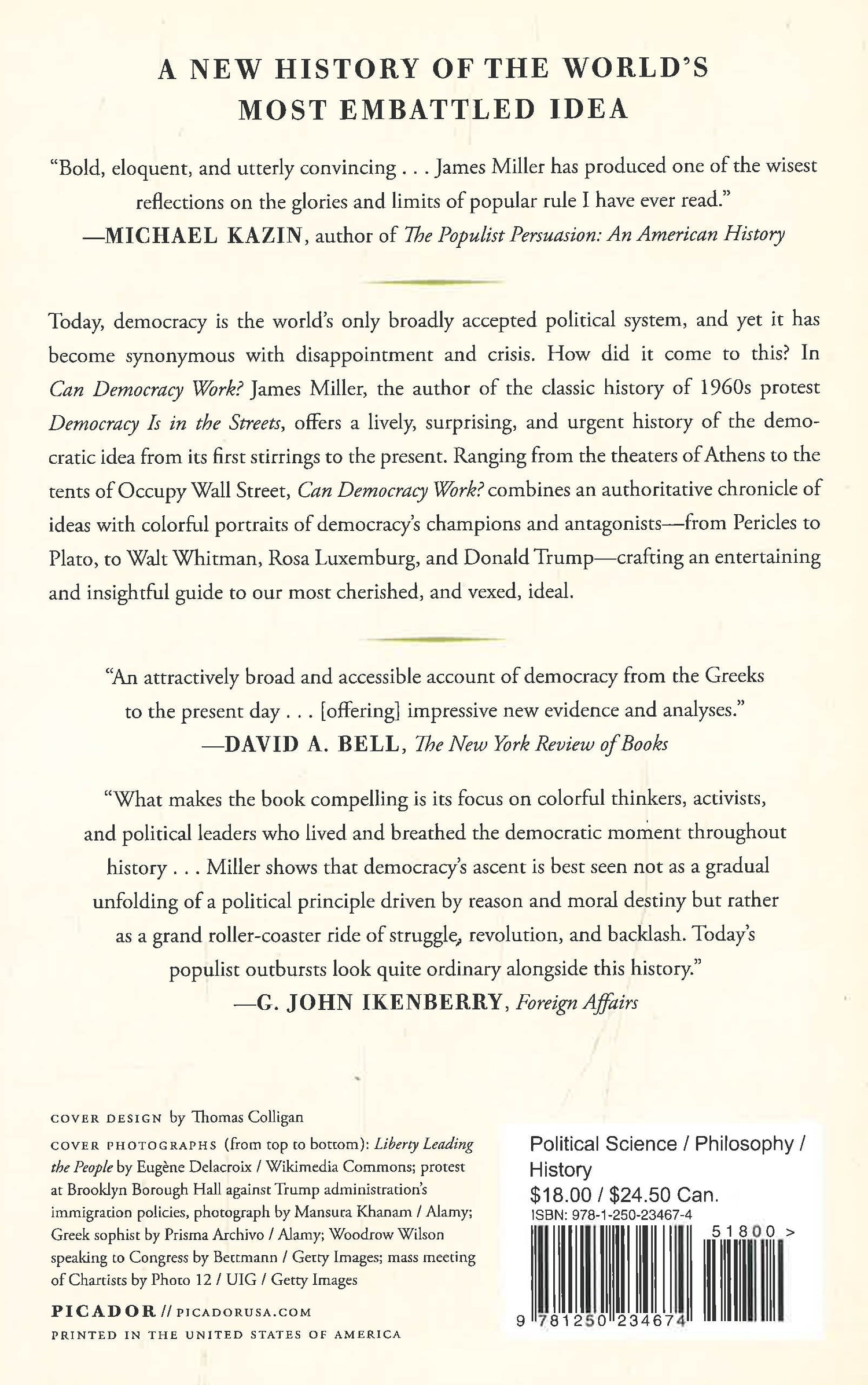 "Of all the books on democracy in recent years one of the best is James Miller's Can Democracy Work? . . . Miller provides an intelligent journey through the turbulent past of this great human experiment in whether we can actually govern ourselves." --David Blight, The Guardian