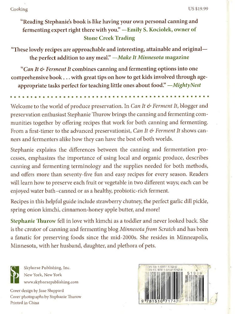 Recipes in this helpful, full color book include strawberry chutney, the perfect garlic dill pickle, spring onion kimchi, cinnamon-honey apple butter, and more!Welcome to the world of produce preservation. In Can It & Ferment It, blogger and Certified Master Food Preserver Stephanie Thurow brings the canning and fermenting communities together by offering recipes that work for both canning and fermenting. From a first-timer to the advanced preservationist, Can It & Ferment It shows canners and fermenters alike how they can have the best of both worlds. Recipes include:Strawberry Rhubarb JamSugar Snap Pea PicklesDandelion JellyPickled FennelFiddlehead Fern PicklesSpicy Spring Onion RelishNapa Cabbage KimchiAnd much much moreStephanie explains the differences between the canning and fermentation processes, emphasizes the importance of using local and organic produce, describes canning and fermenting terminology and the supplies needed for both methods, and offers more than seventy-five fun and easy recipes for every season. Readers will learn how to preserve each fruit or vegetable in two different ways; each can be enjoyed water bath-canned or as a healthy, probiotic-rich ferment.