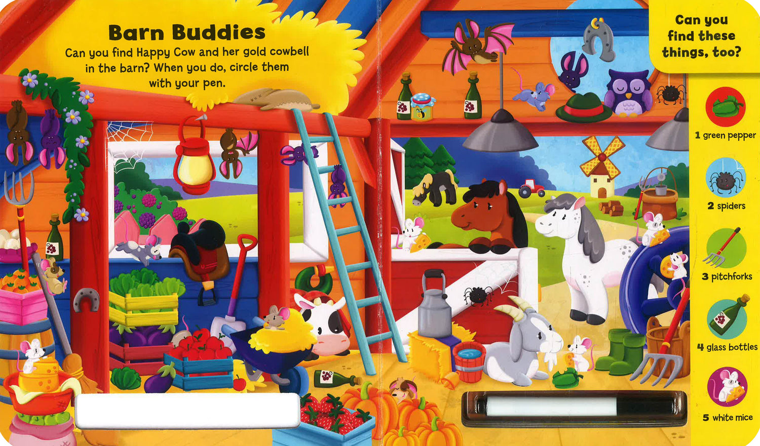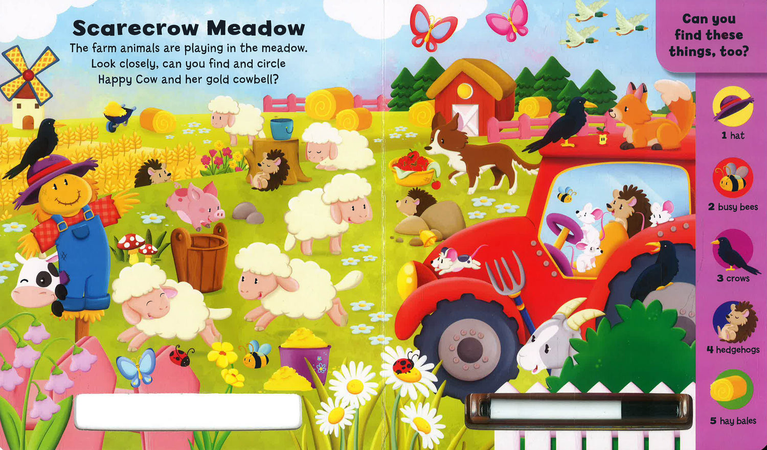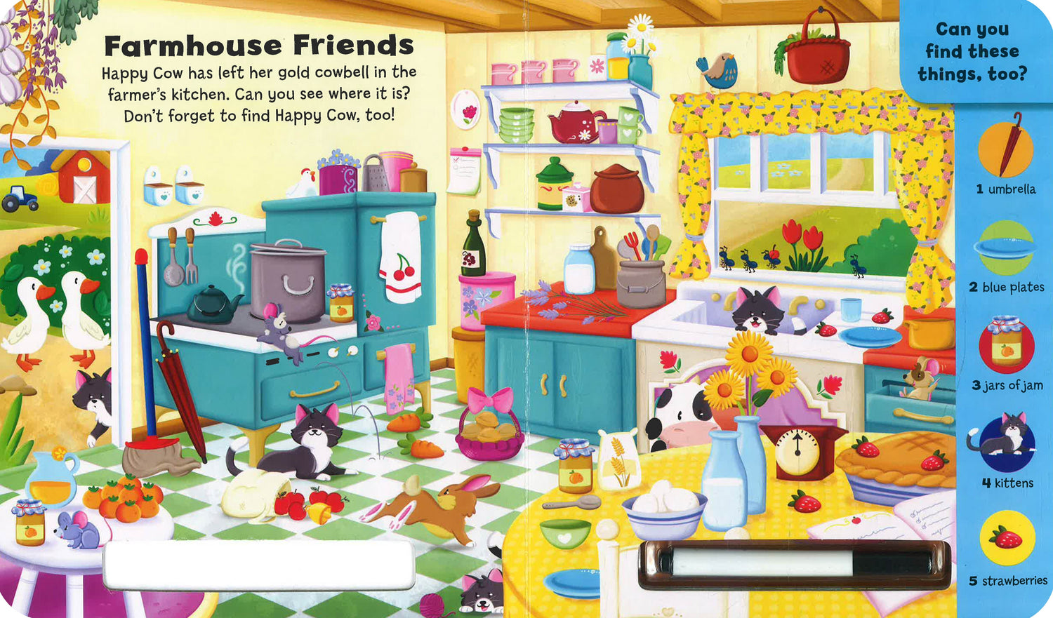 Happy Cow is playing hide-and-seek on the farm. Can you find her? There are lots of other fun things to find, too, plus numbers and colours to learn. With wipe-clean pages and a pen, children can have look-and-find fun again and again.