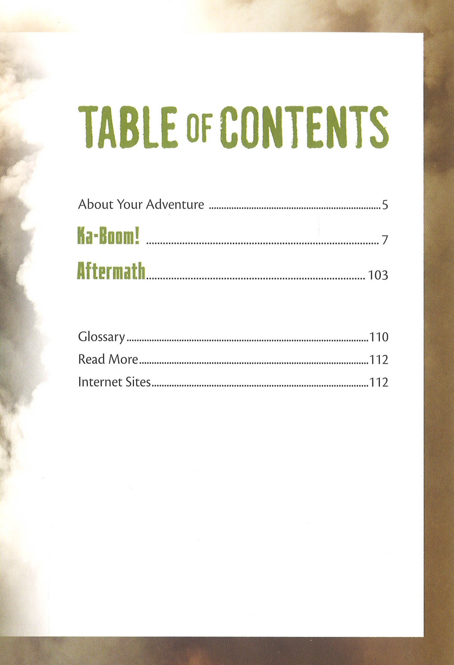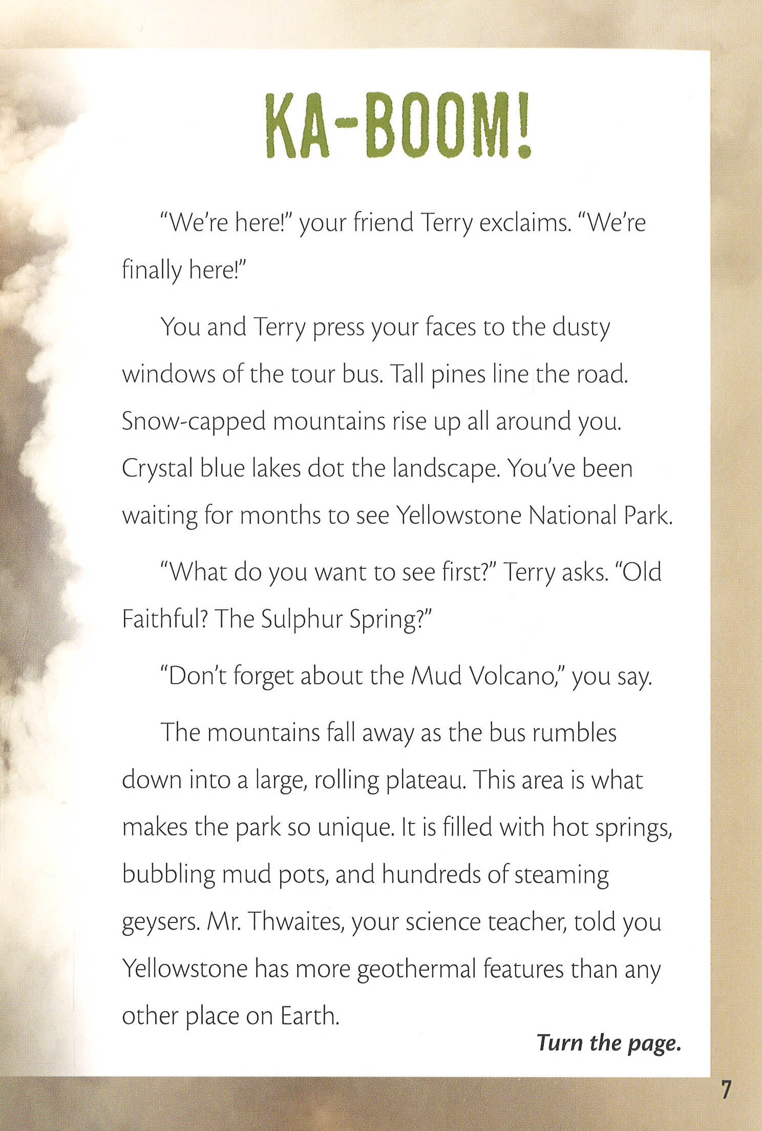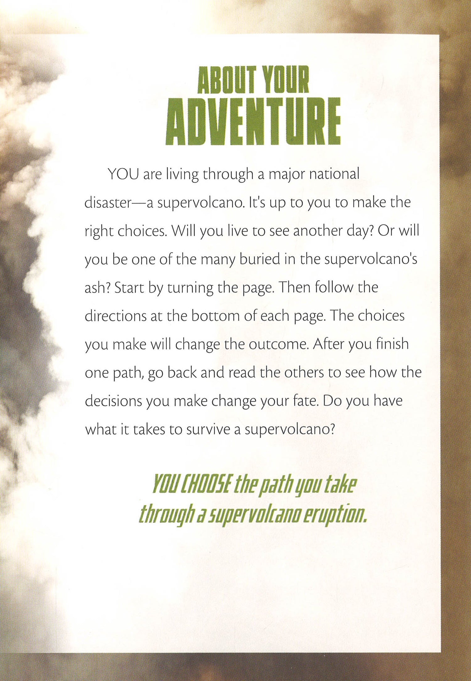 A supervolcano has erupted! Its eruption is thousands of times larger than a normal volcano. Huge amounts of lava and ash threaten all life in the area. You're a visitor to the park when the eruption occurs. Will you stay to monitor the volcano, or evacuate to safety? When YOU CHOOSE what to do next, the choices you make could mean the difference between life and death. Can you survive a supervolcano?