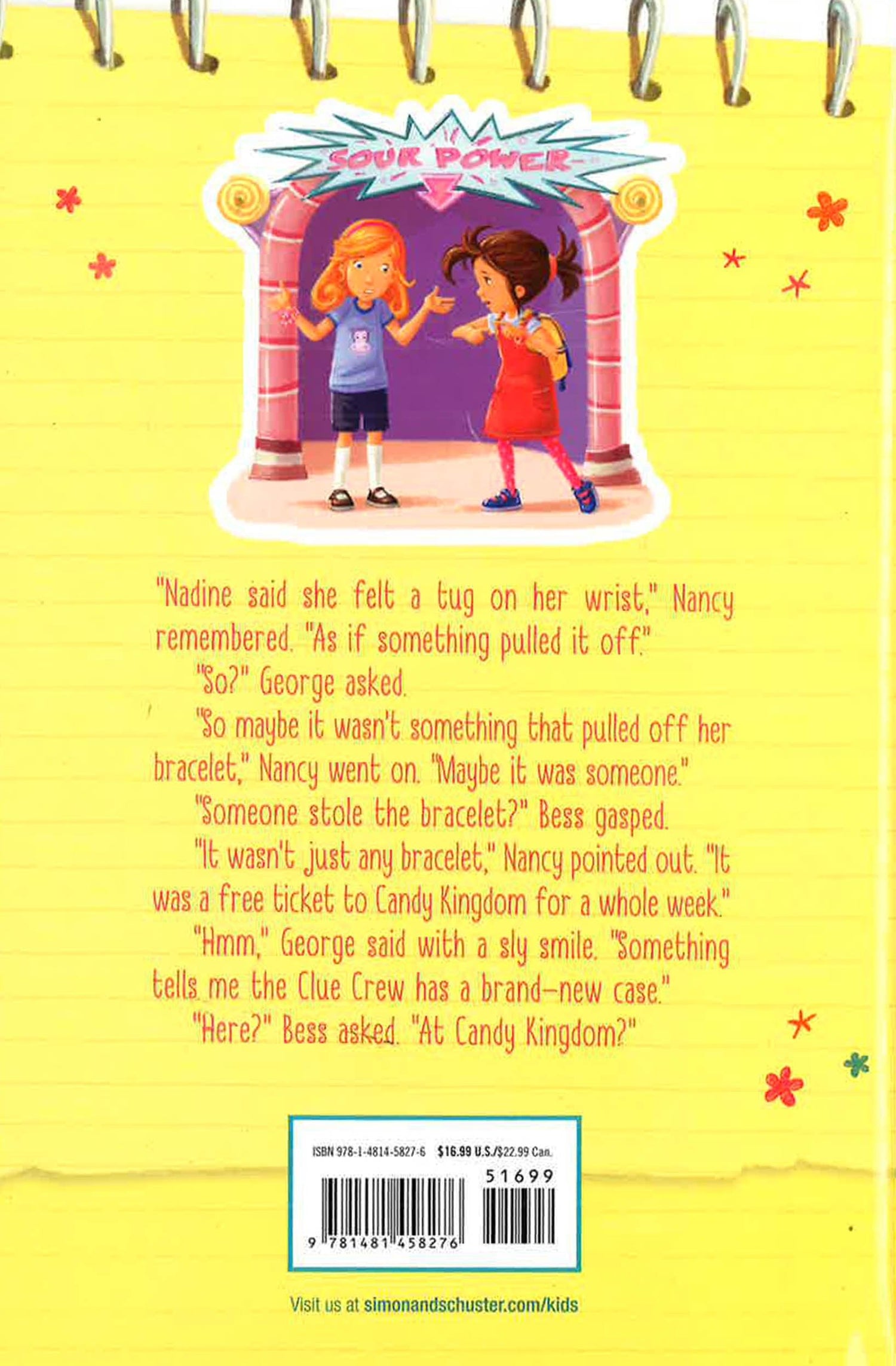 Help Nancy and her friends solve a sweet mystery at the new Candy Kingdom amusement park in the seventh book in the interactive Nancy Drew Clue Book mystery series. The new Candy Kingdom theme park is opening in River Heights and Nancy, Bess, and George can't wait! The park is supposed to have candy-themed rides, attractions, arcade games, and more, so when Bess wins four free passes to the park, she invites Nancy, George and their good friend, Nadine Nardo to check it out. But Nadine's wristband goes missing after the first ride! Nancy and her friends know that all of the wristbands were tied securely, so it couldn't have just fallen off. Can Nancy, Bess, and George track down the stolen wristband before their sweet day at Candy Kingdom turns sour?