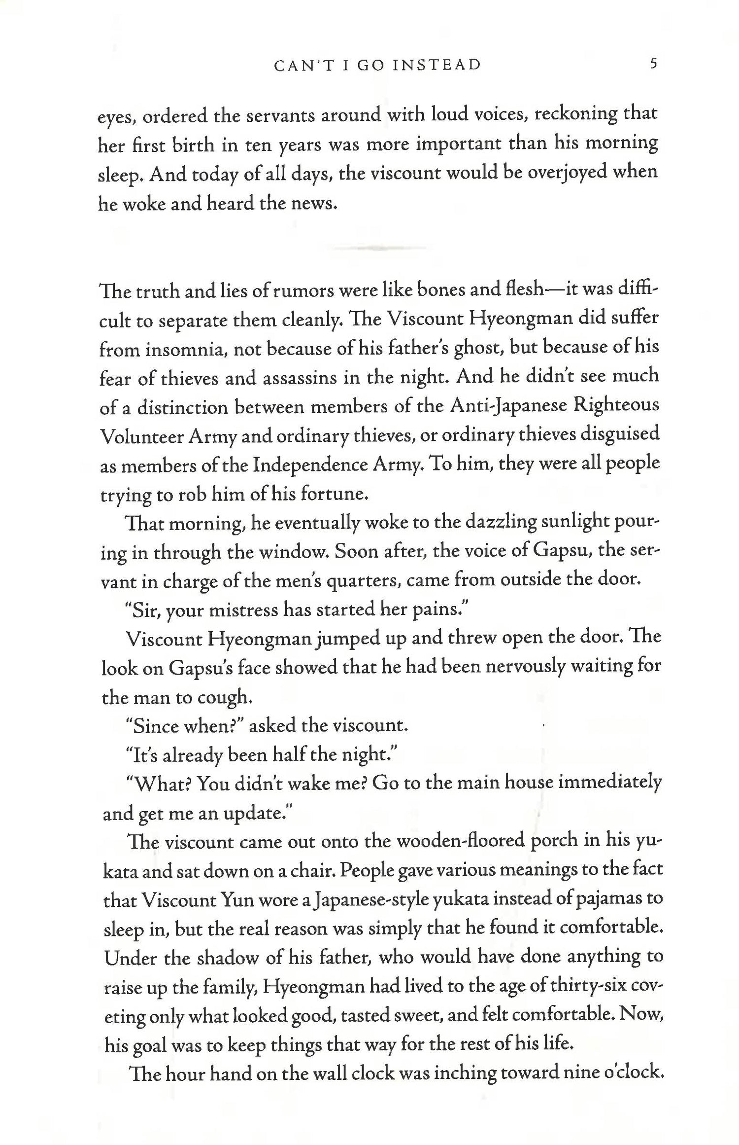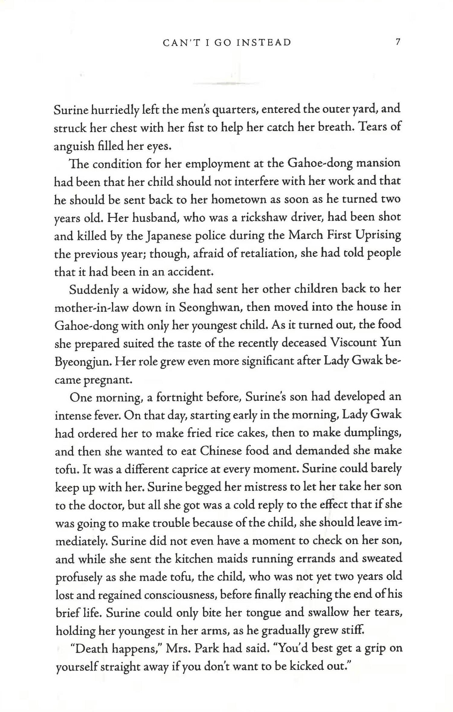 Can't I Go Instead follows the lives of the daughter of a Korean nobleman and her maidservant in the early 20th century. When the daughter's suitor is arrested as a Korean Independence activist, and she is implicated during the investigation, she is quickly forced into marriage to one of her father's Japanese employees and shipped off to the United States. At the same time, her maidservant is sent in her mistress's place to be a comfort woman to the Japanese Imperial army.