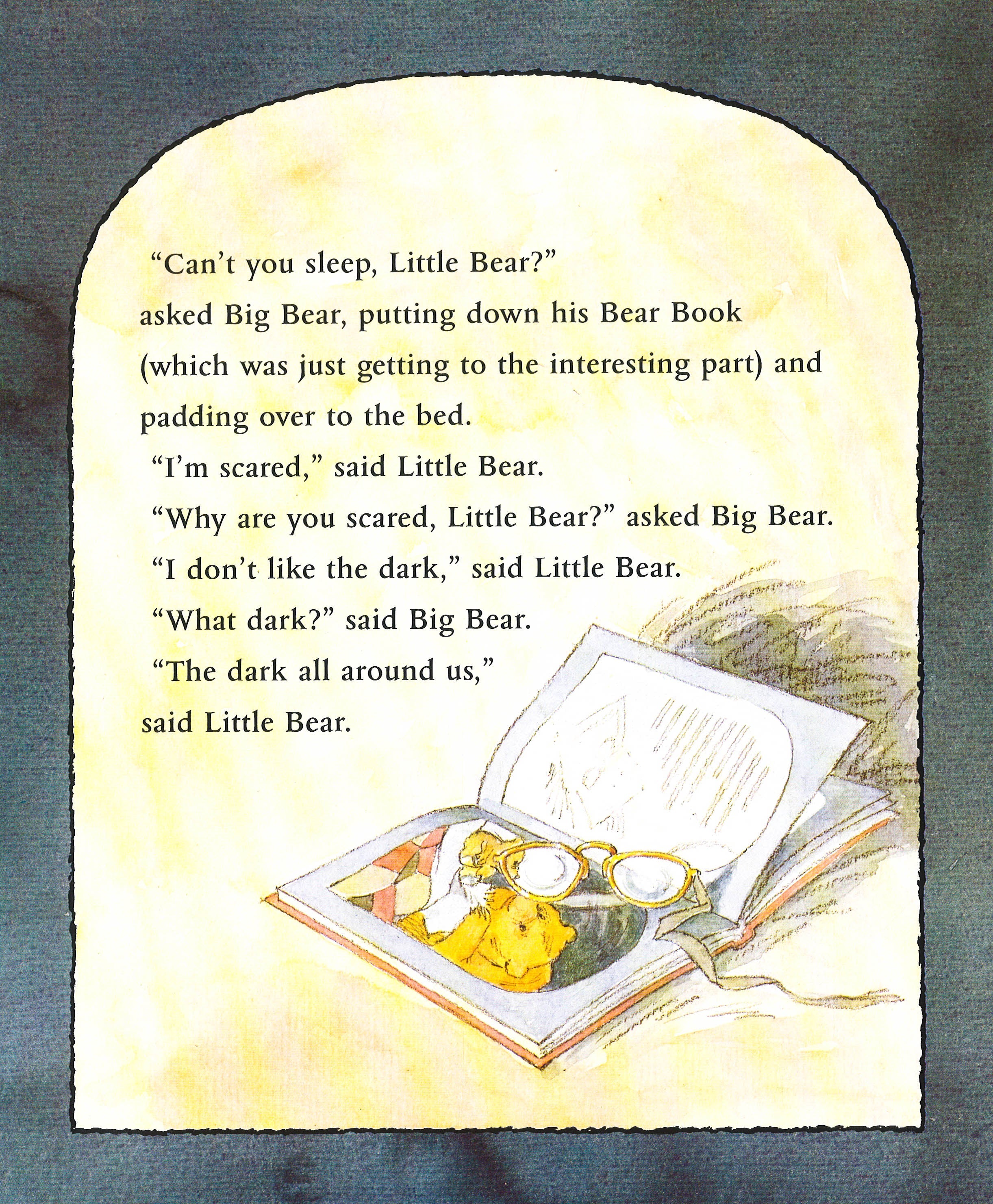 "I don't like the dark," said Little Bear."What dark?" said Big Bear."The dark all around us," said Little Bear. In this tender account of a sleepless night in the bear cave, Big Bear sets out with all his patience and understanding to show Little Bear that the dark is nothing to be afraid of. When all the lanterns in the cave aren't enough to quell Little Bear's troubled emotions, Big Bear offers--in a final loving gesture--nothing less than the bright yellow moon and the twinkling stars! More comforting than even the best of lullabies, this bedtime story is destined to become a classic. "From the Hardcover edition."