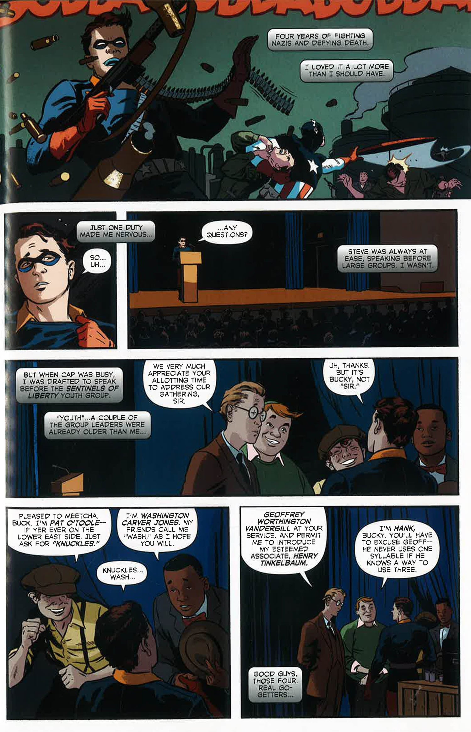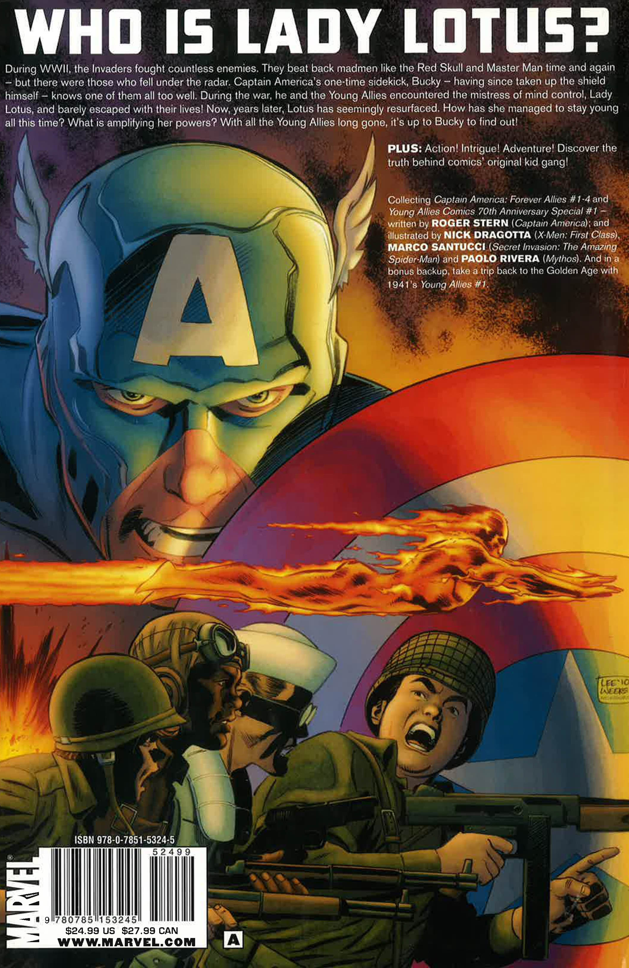 James "Bucky" Barnes has led many lives. Once he was Captain America's partner Bucky, a proud member of the Invaders, a founder of the original Young Allies. Now he is Captain America, the Sentinel of Liberty, and when an old enemy suddenly reappears, Jim must re-open the last, unsolved case of the Young Allies to stop a menace that threatens the world! Roger Stern travels from World War II with Nick Dragotta to the modern age with Marco Santucci to tell a time-tossed epic tale of high adventue!