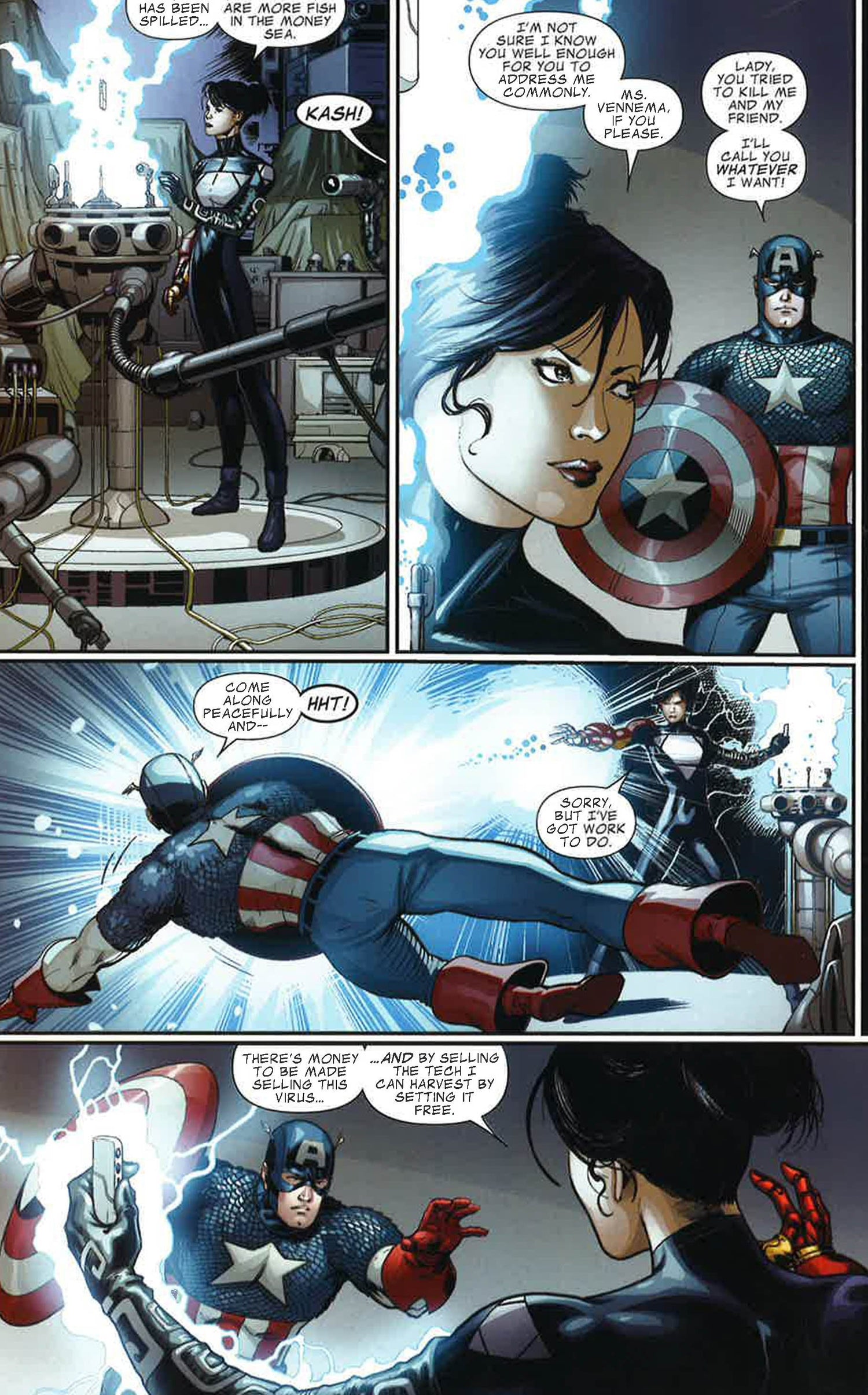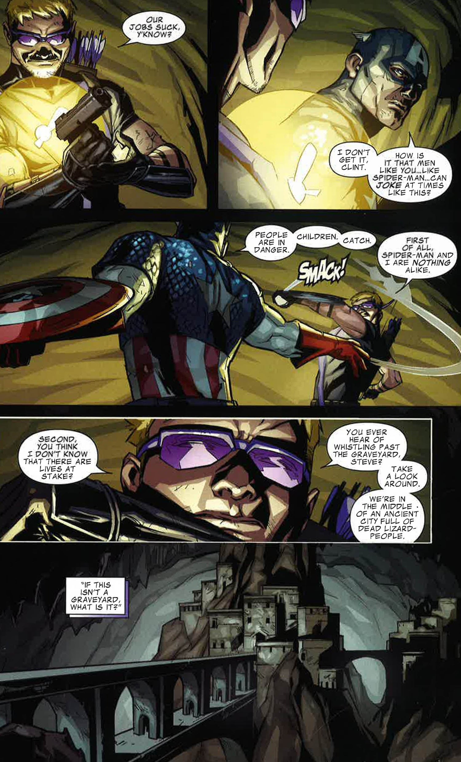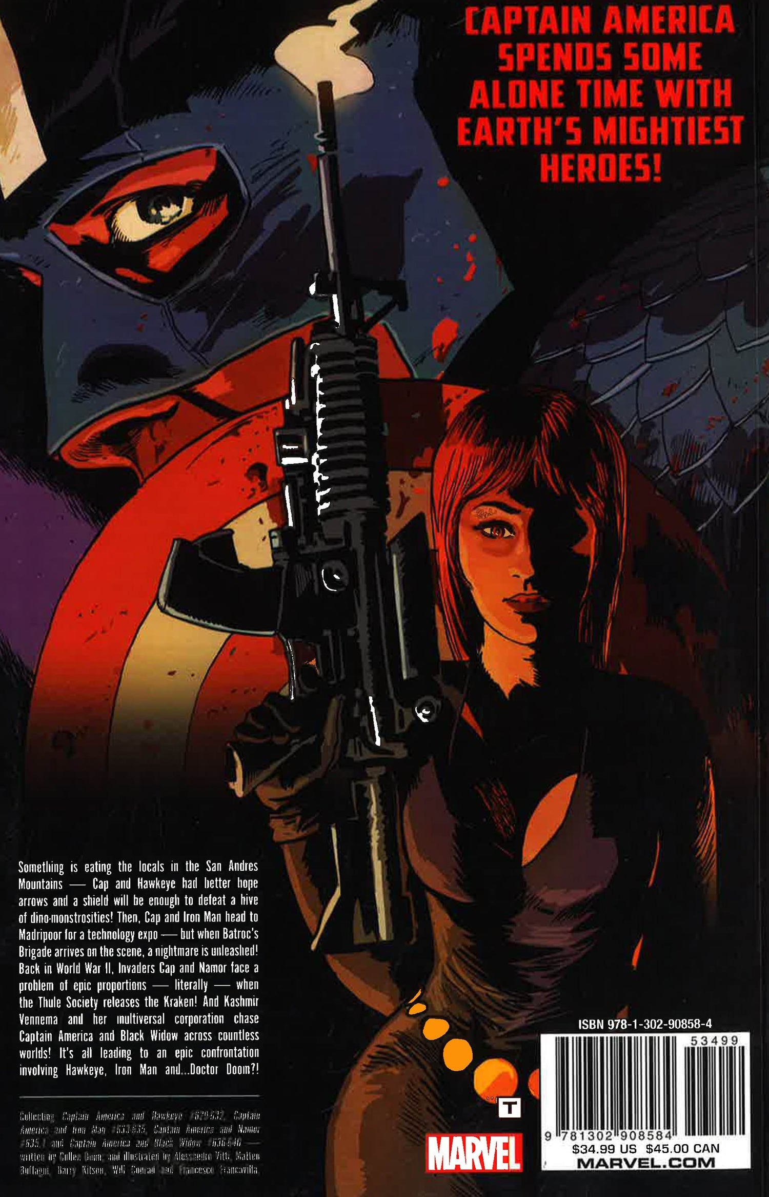 Captain America spends some one-on-one time with his Avengers buddies! Something is eating the locals in the San Andres Mountains - Cap and Hawkeye had better hope that arrows and a shield will be enough to defeat a hive of dino-monstrosities! Then, Cap and Iron Man head to Madripoor for a technology expo - but when Batroc's Brigade shows up, a nightmare is unleashed! Back in World War II, Invaders Cap and Namor face a huge problem when the Thule Society releases the Kraken! And Captain America and Black Widow are chased across countless worlds by Kashmir Vennema and her multiversal corporation! It's all leading to a huge confrontation involving Hawkeye, Iron Man and...Doctor Doom?