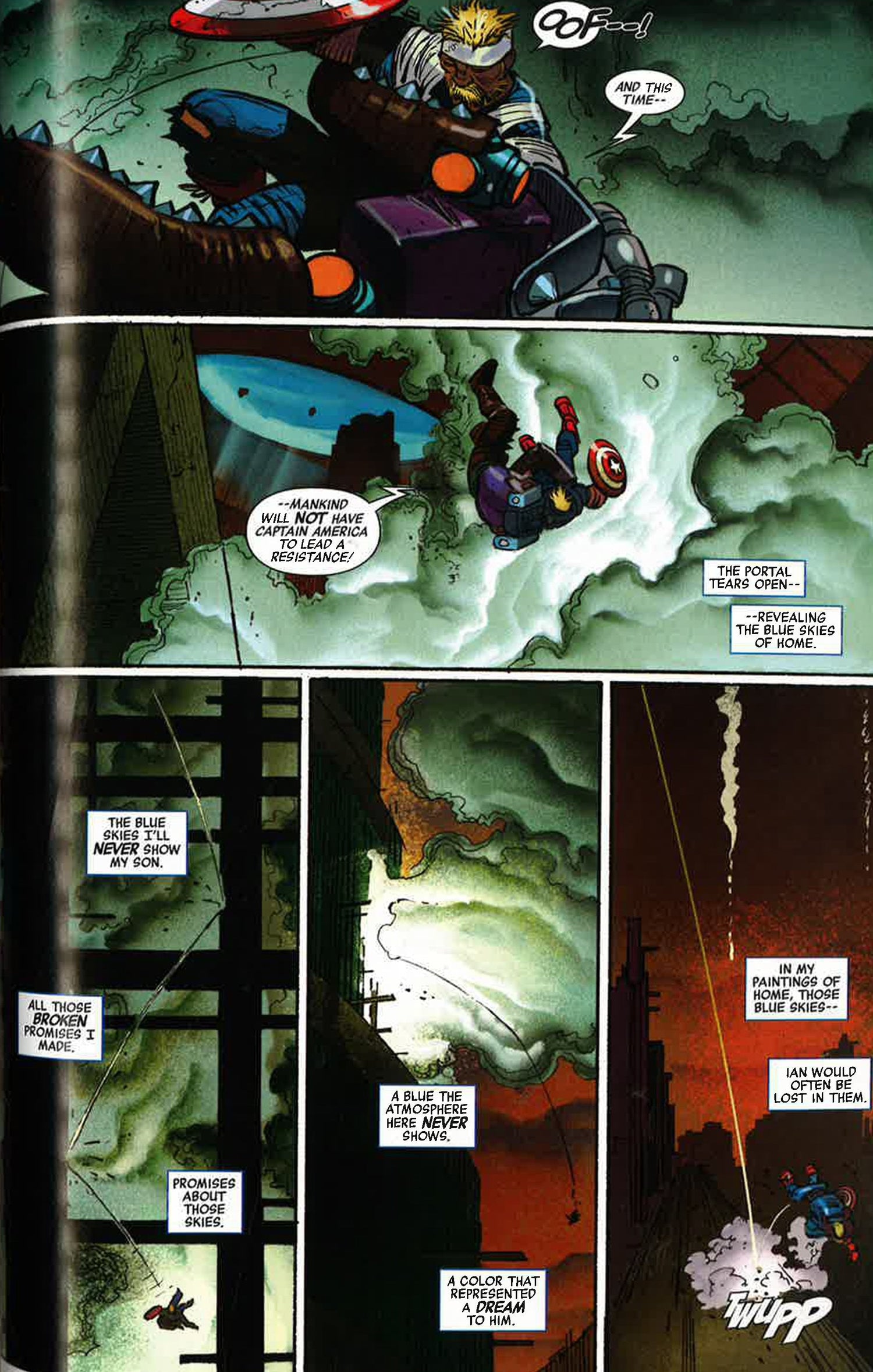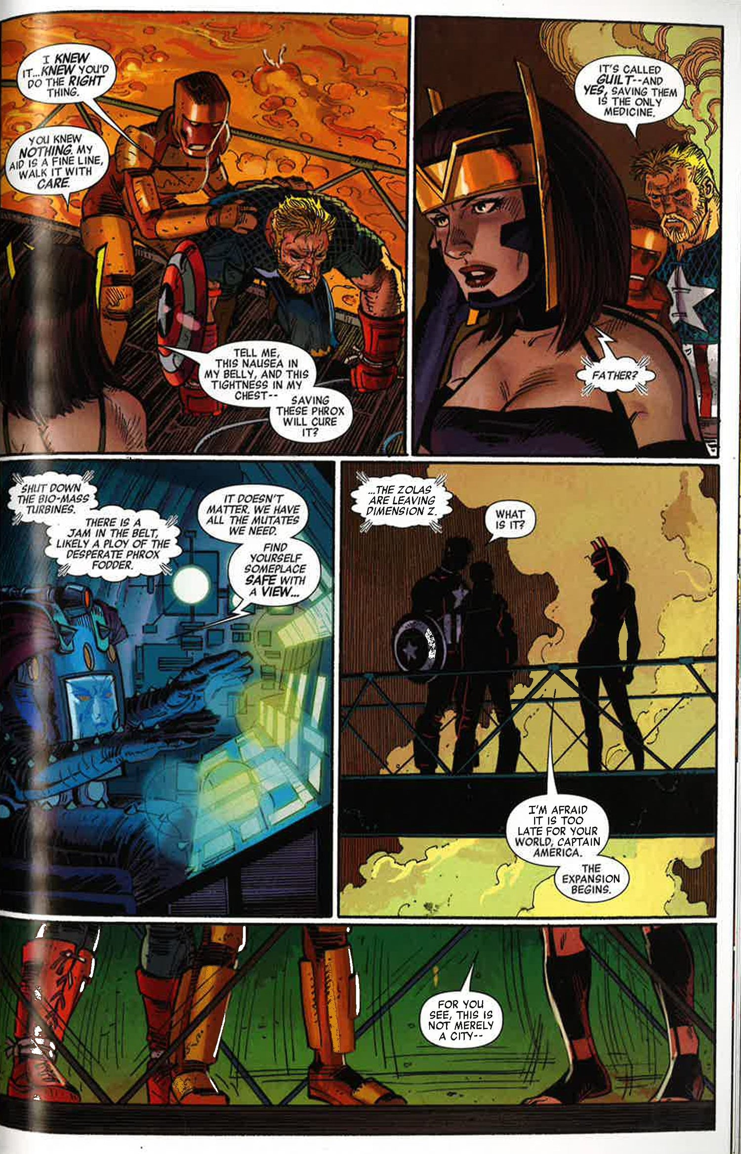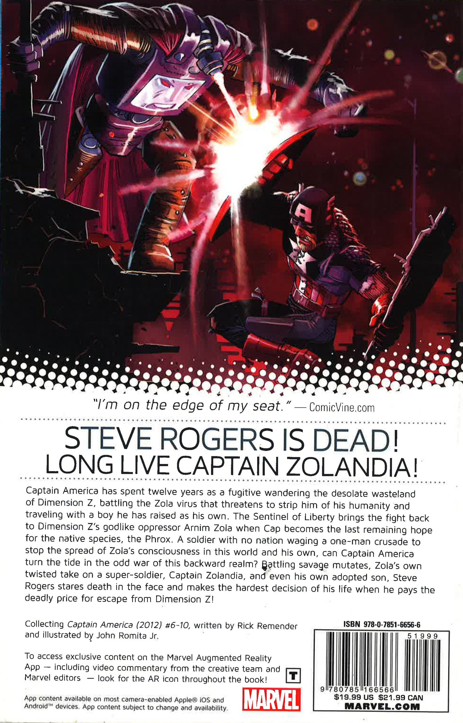 Captain America has spent twelve years as a fugitive wandering the wasteland of Dimension Z, battling the Zola virus within him and travelling with a boy he has raised as his own. Now, the Sentinel of Liberty brings the fight back to Dimension Z's godlike oppressor Arnim Zola when Cap becomes the last remaining hope for the native species, the Phrox! A lone soldier waging a one-man crusade to stop the spread of Zola's consciousness in this world and his own, can Captain America turn the ti de in the odd war of this backward realm? Battling savage mutates, Zola's twisted Captain Zolandia, and even his own adopted son, Steve Rogers stares death in the face and makes the hardest decision of his life when he pays the deadly price...to escape from Dimension Z!