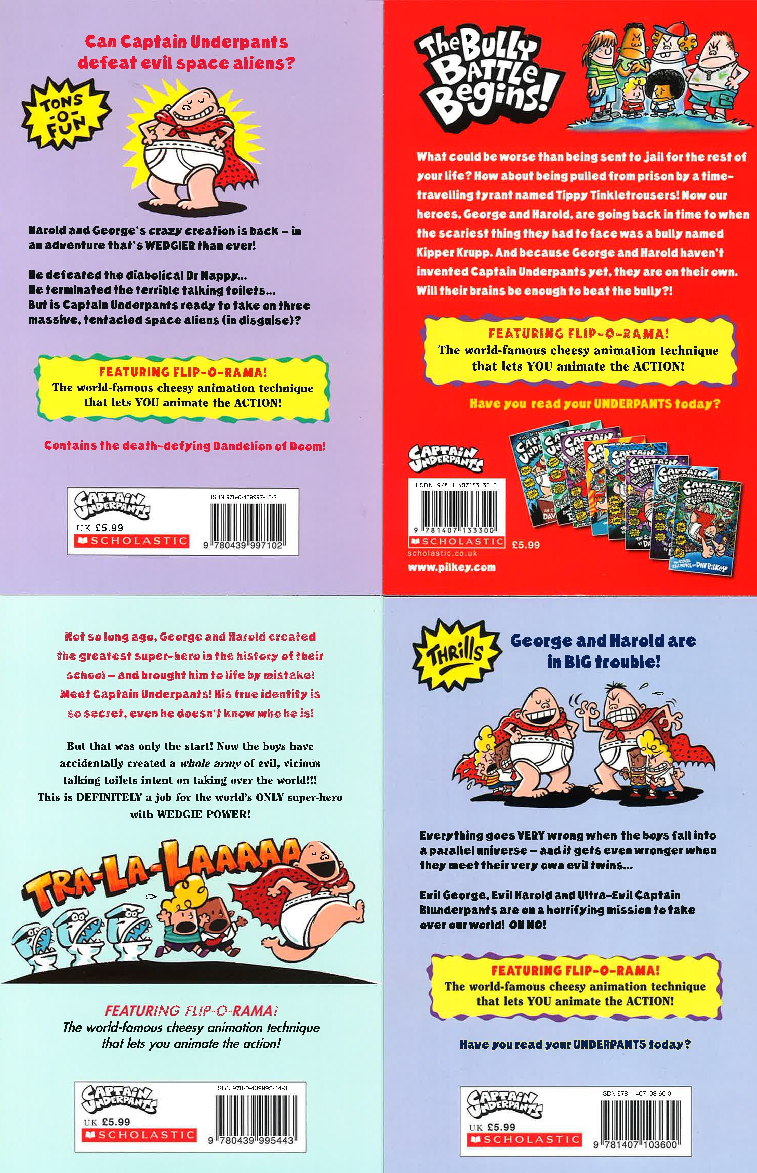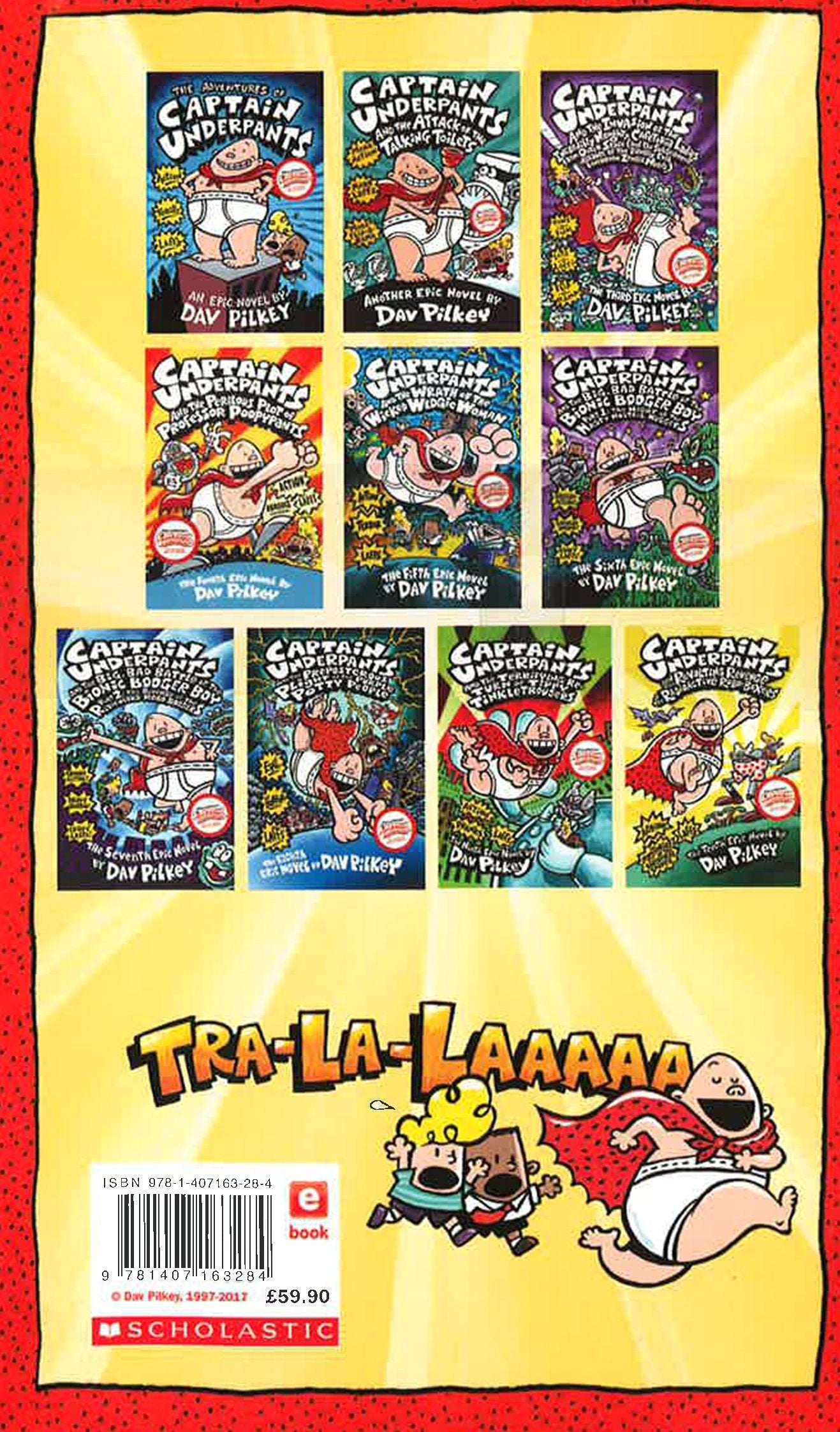 A fabulous box set with ten Captain Underpants adventures packed with wedgie-power, evil villains and flip-o-rama. When naughty schoolboys George and Harold brought Captain Underpants to life, they never dreamed that through his amazing wedgie-power, Earth would be saved time and time again. Evil villains like Professor Poopypants and the Wicked Wedgie Woman are no match for the waistband warrior. The power of pants is on hand to save humanity!