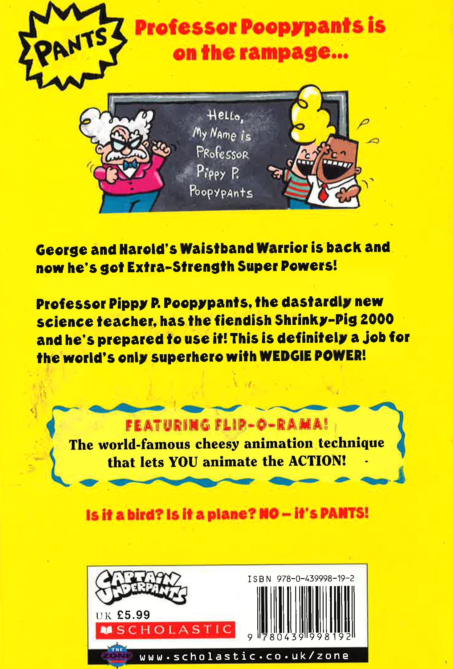 Professor Pippy P. Poopypants is a brilliant scientist, but his ridiculous name means no one takes his fantastic inventions seriously. And now he's on the rampage...He's armed with the fiendish Shrinky-Pig 2000 and he's prepared to use it! This is definitely a job for the world's only superhero with Wedgie Power.