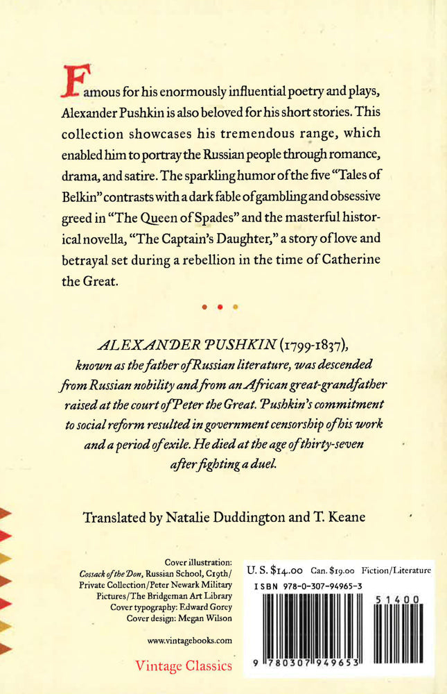 Famous for his enormously influential poetry and plays, Alexander Pushkin is also beloved for his short stories. This collection showcases his tremendous range, which enabled him to portray the Russian people through romance, drama, and satire. The sparkling humor of the five "Tales of Belkin" contrasts with a dark fable of gambling and obsessive greed in "The Queen of Spades" and the masterful historical novella, "The Captain's Daughter," a story of love and betrayal set during a rebellion in the time of Catherine the Great.