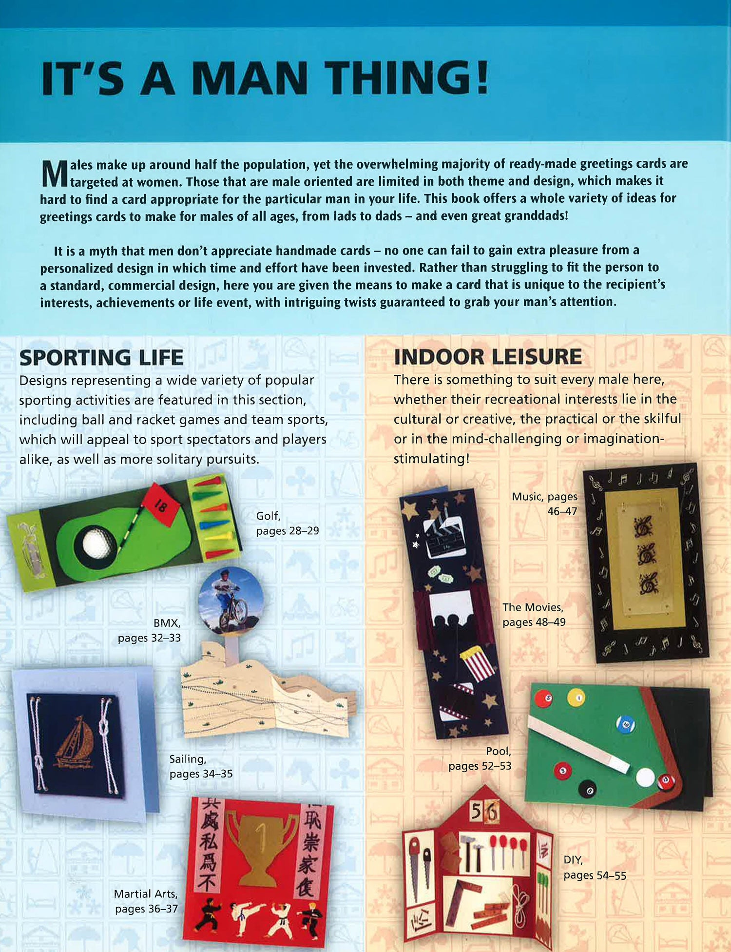 Flex your card-making muscles and create greetings guaranteed to surprise the guys. Over 70 dynamic designs ensure there's a card to impress, whether he's super sporty, hobby mad, a family man or a culture vulture. Young or old, he'll appreciate a tailor-made card to celebrate special moments such as passing exams, celebrating a birthday or becoming a father. Inspirational and practical advice reveals the design tips and tricks for making personalized greetings with a masculine twist. Clear instructions and creative techniques ensure cards that are unique, classic, stylish or simply good fun - just like the men in your life!