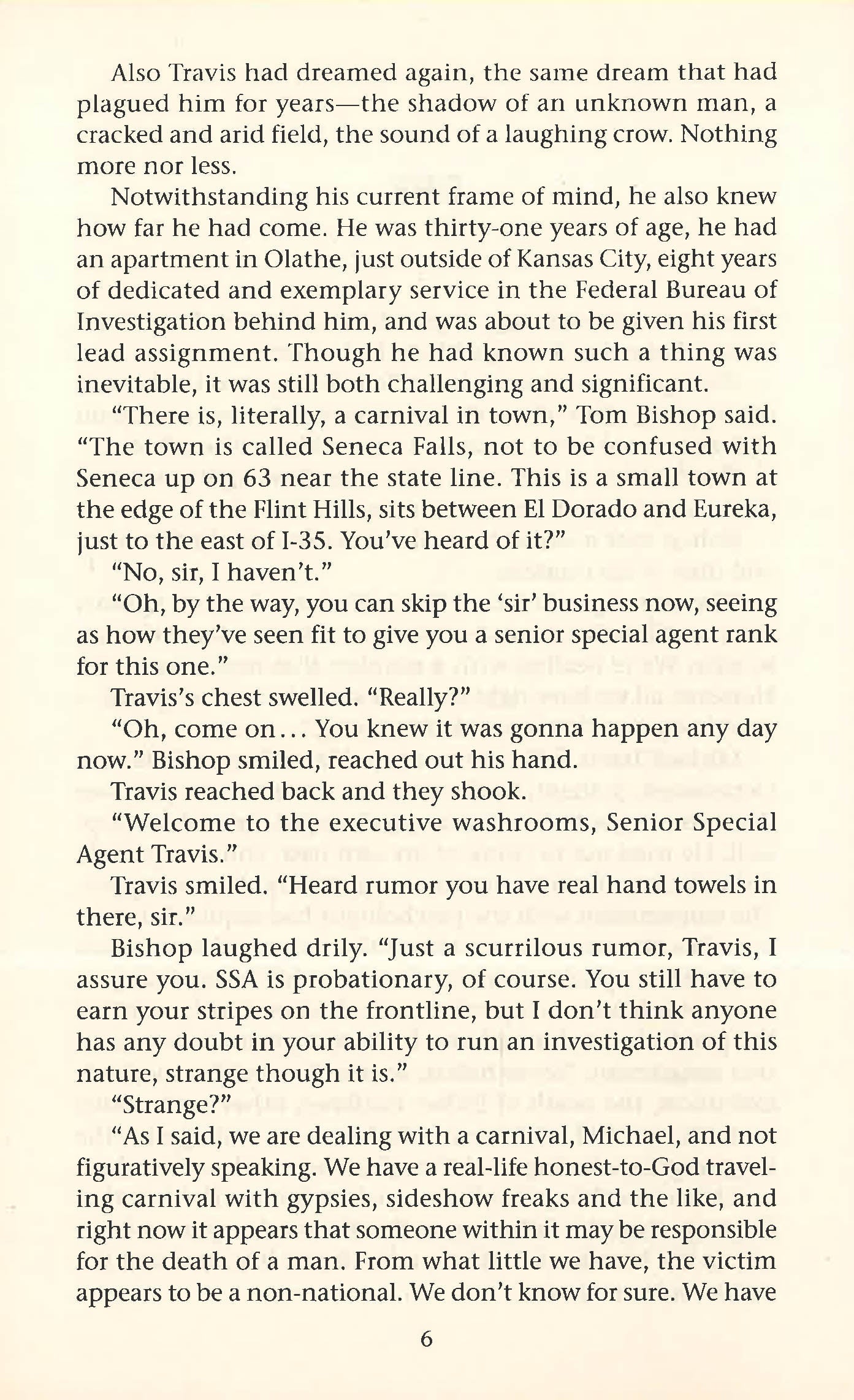 Kansas, 1959. A travelling carnival appears overnight, intriguing the townsfolk with acts of inexplicable magic and illusion. But when a man's body is discovered beneath the carousel, FBI Special Agent Michael Travis is sent to investigate. But things are not what they seem, and with each new turn of the investigation, Travis's faith is challenged as he struggles to open his mind to a truth that defies comprehension.