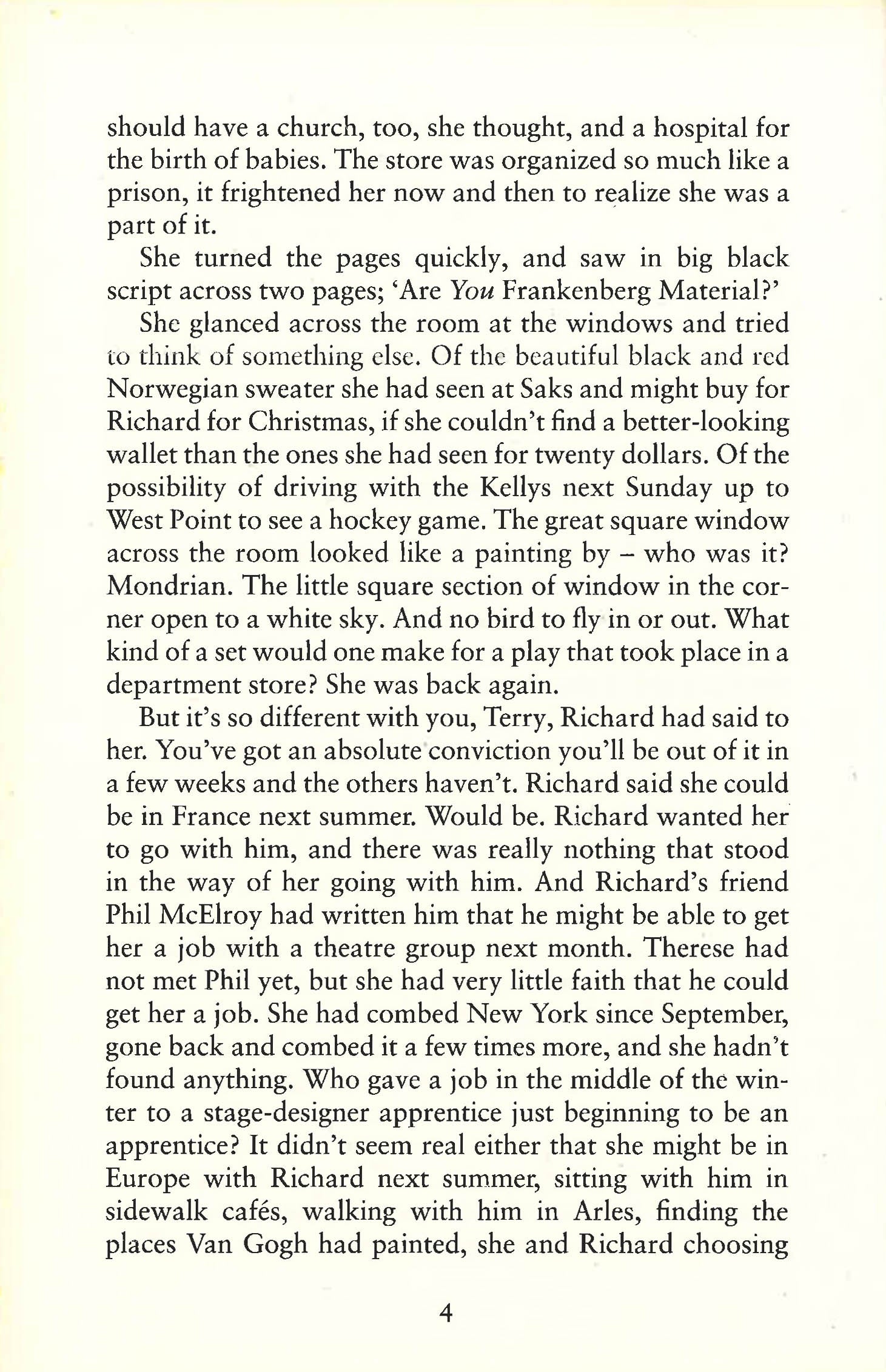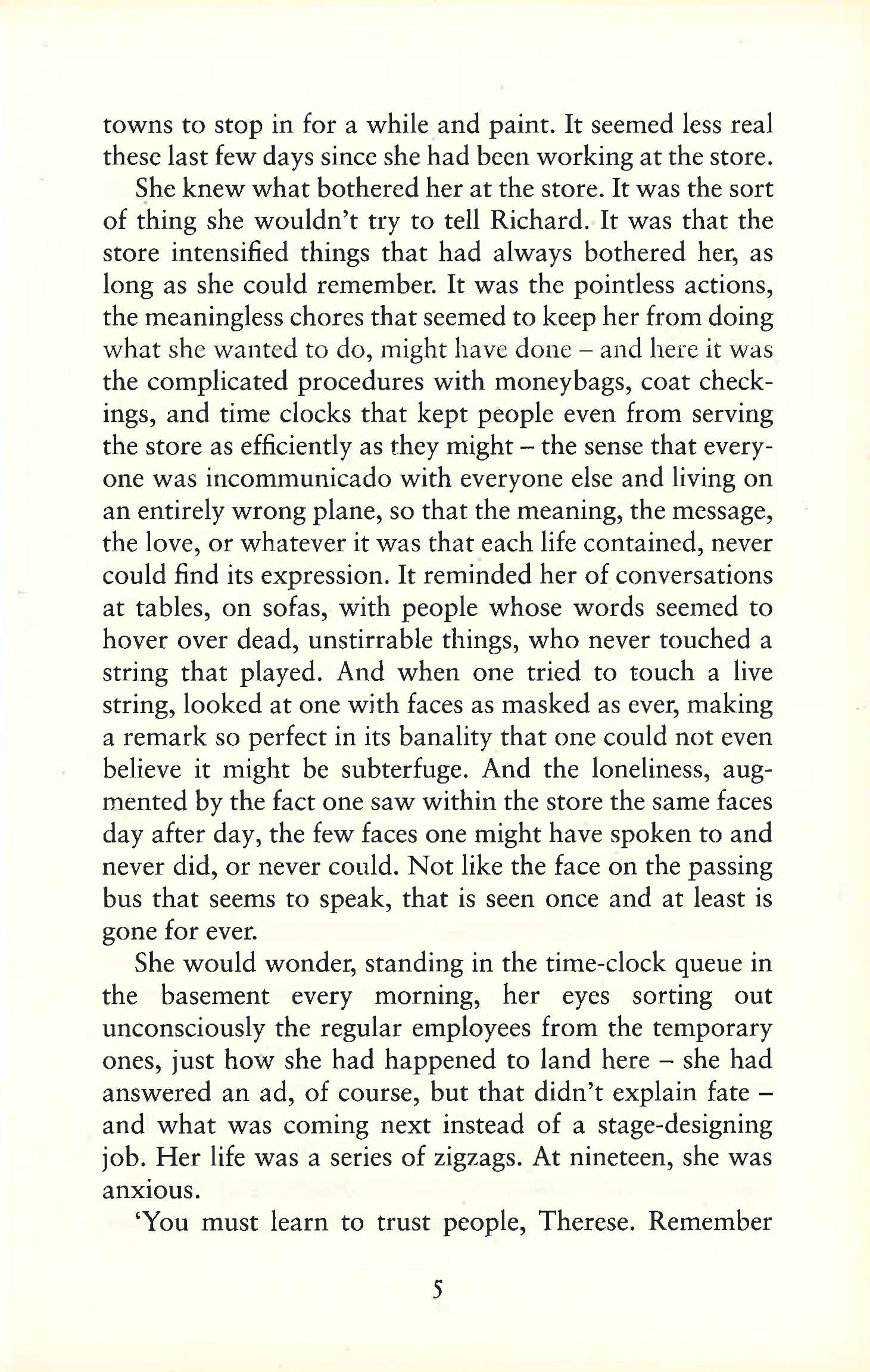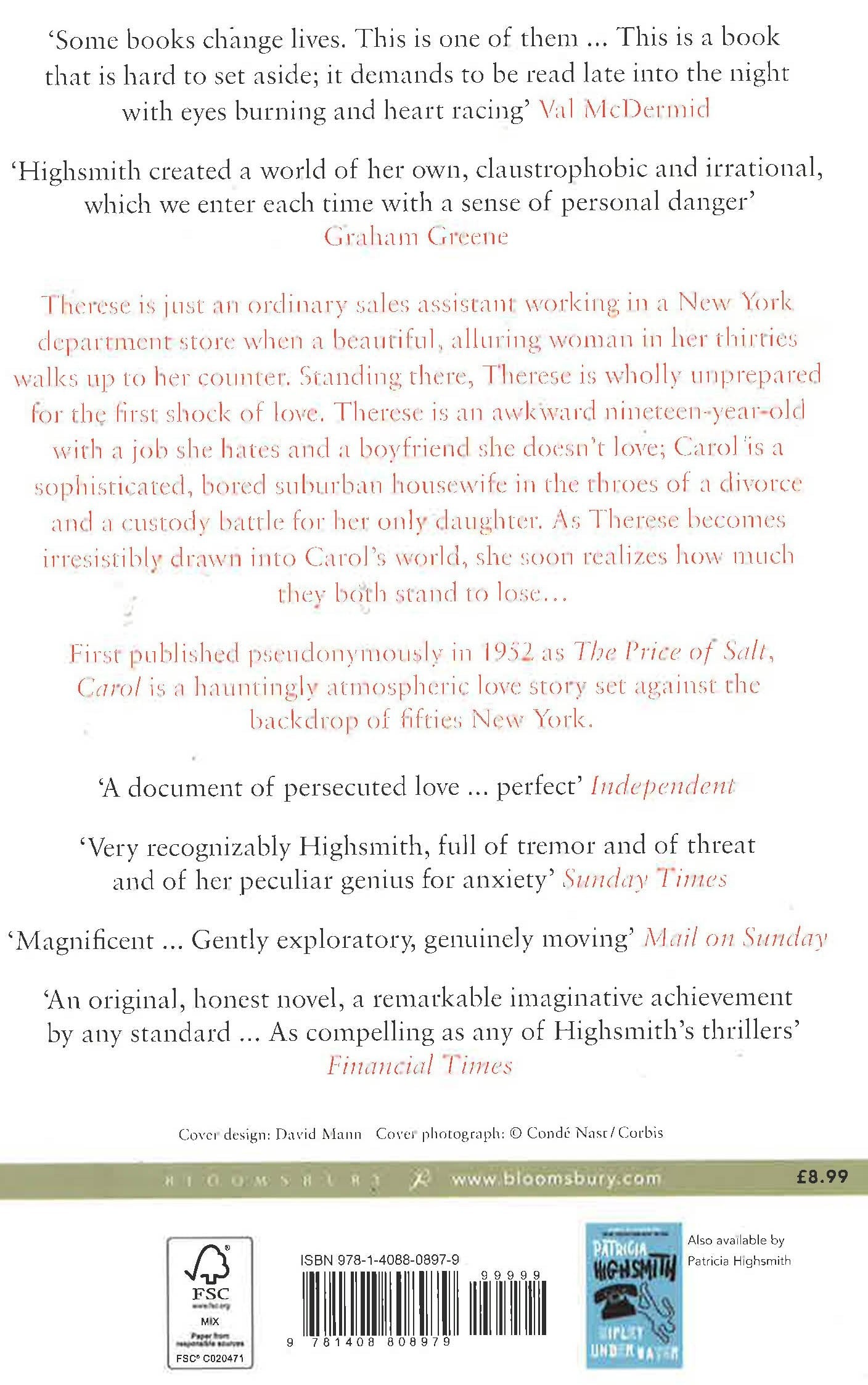 Therese is just an ordinary sales assistant working in a New York department store when a beautiful, alluring woman in her thirties walks up to her counter. Standing there, Therese is wholly unprepared for the first shock of love. Therese is an awkward nineteen-year-old with a job she hates and a boyfriend she doesn't love; Carol is a sophisticated, bored suburban housewife in the throes of a divorce and a custody battle for her only daughter. As Therese becomes irresistibly drawn into Carol's world, she soon realizes how much they both stand to lose...First published pseudonymously in 1952 as The Price of Salt, Carol is a hauntingly atmospheric love story set against the backdrop of fifties' New York.