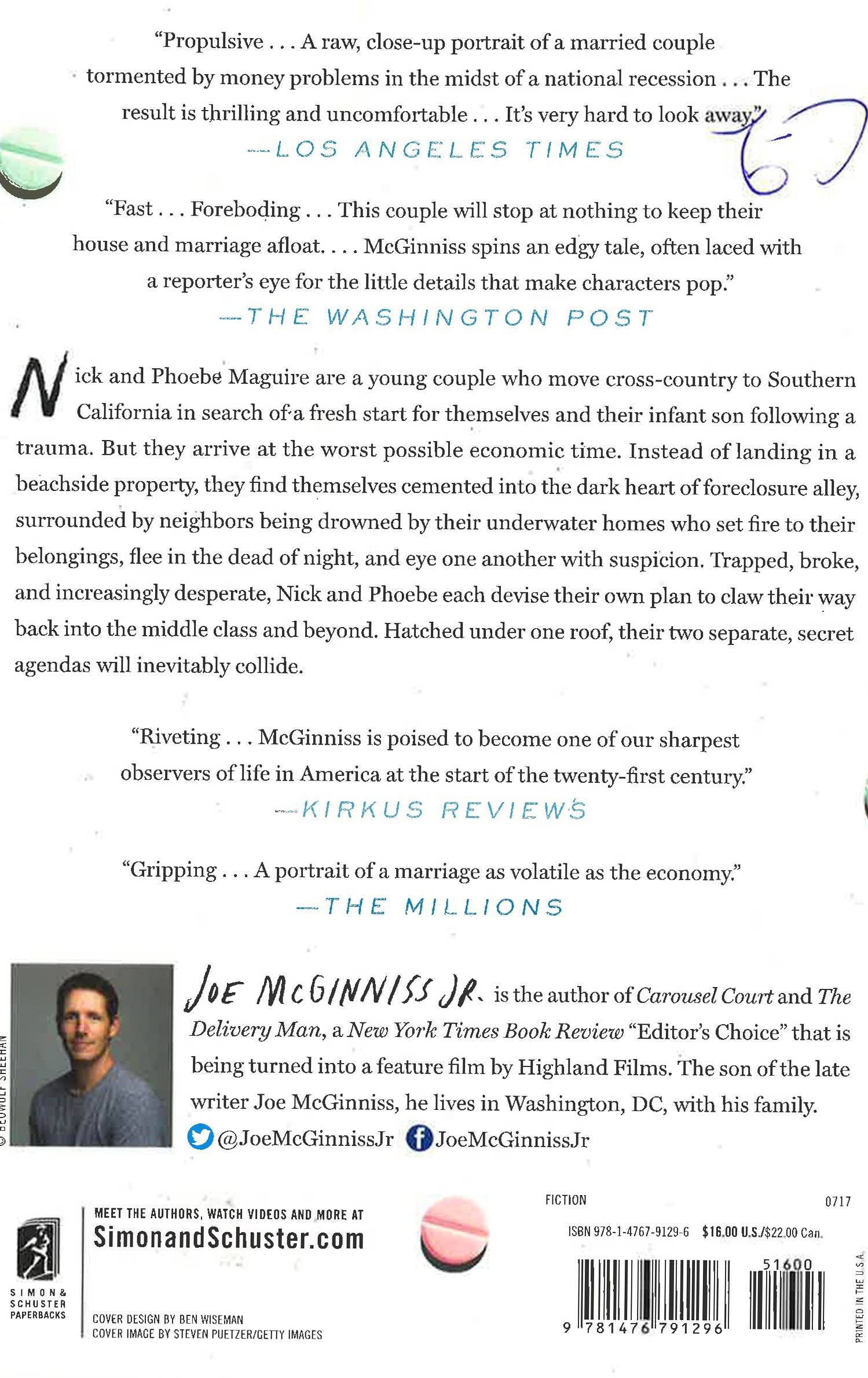 Nick and Phoebe Maguire are a young couple who move cross-country to Southern California in search of a fresh start for themselves and their infant son following a trauma. But they arrive at the worst possible economic time, cemented into the dark heart of foreclosure alley and surrounded by neighbors swamped by debt who set fire to their belongings, flee in the dead of night, and eye one another with suspicion while keeping shotguns by their beds. Trapped, broke, and increasingly desperate, Nick and Phoebe each devise their own plan to claw their way back into the middle class and beyond. Hatched under one roof, their two separate, secret agendas will inevitably collide.