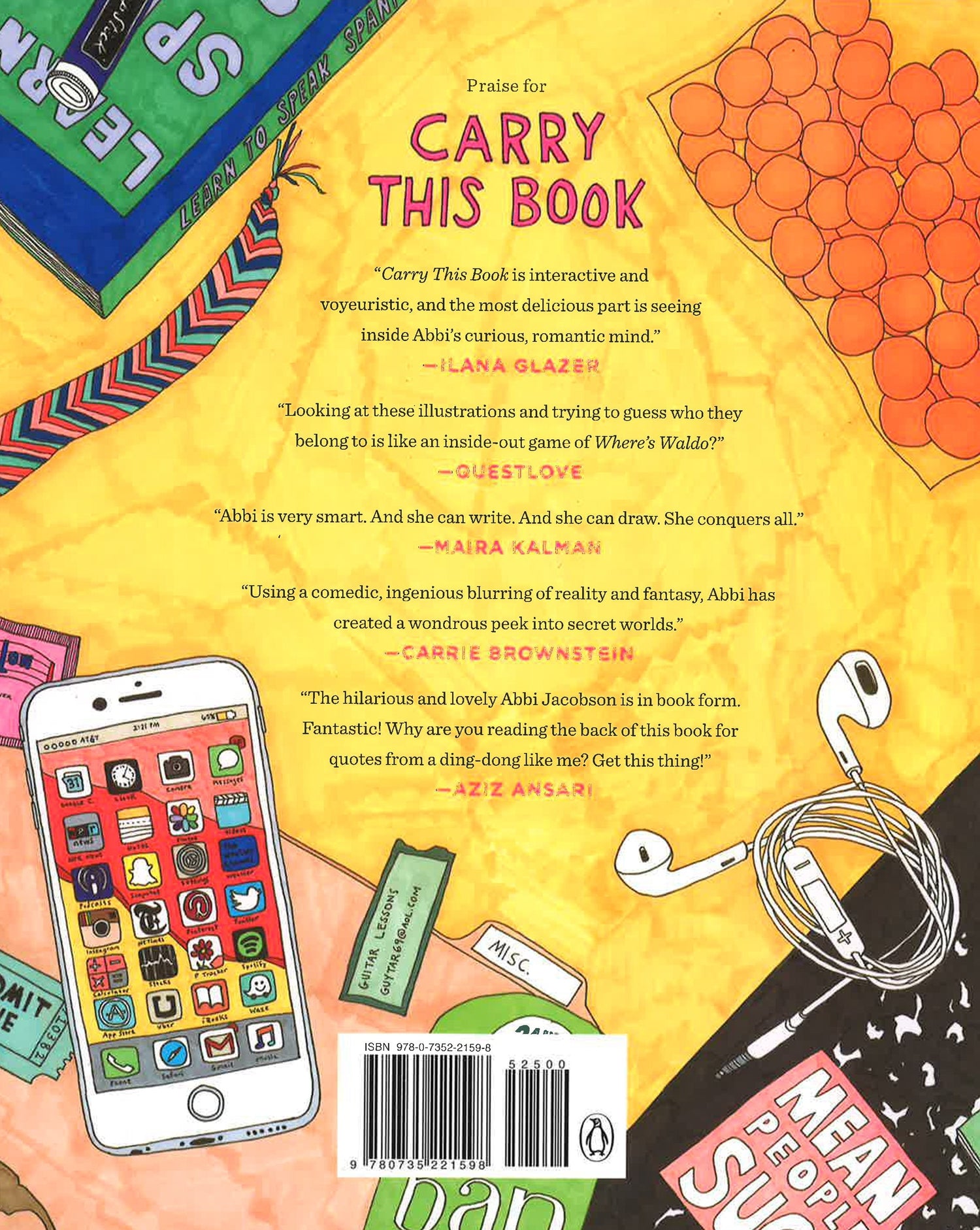 NEW YORK TIMES BESTSELLER From the mind of Broad City's Abbi Jacobson, author of I Might Regret This, a wonderfully weird and weirdly wonderful illustrated look at the world around us--all through the framework of what we carry. "Jacobson's art is warm, textured, and carefully composed, a little bit Maira Kalman and a little bit Roz Chast. It's also genuinely funny." --Vox With bright, quirky, and colorful line drawings, Jacobson brings to life actual and imagined items found in the pockets and purses, bags and glove compartments of real and fantastical people--whether it's the contents of Oprah's favorite purse, Amelia Earhart's pencil case, or Bernie Madoff's suitcase. How many self-tanning lotions are in Donald Trump's weekender? What's inside Martha Stewart's hand-knit fanny pack? What kind of protein bars does Michelle Obama hide in her tiny clutch at the White House Correspondents' Dinner? An instant New York Times bestseller, Carry This Book provides a humorous and insightful look into how the things we carry around every day make up who we are.