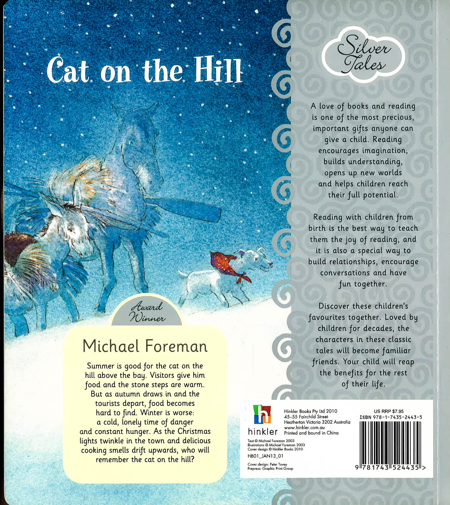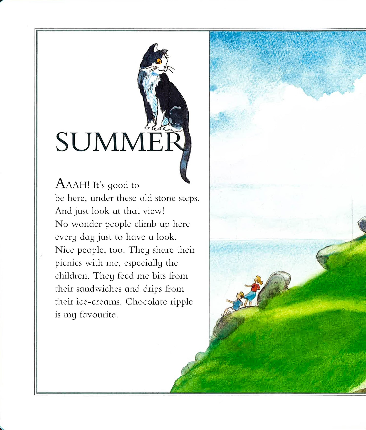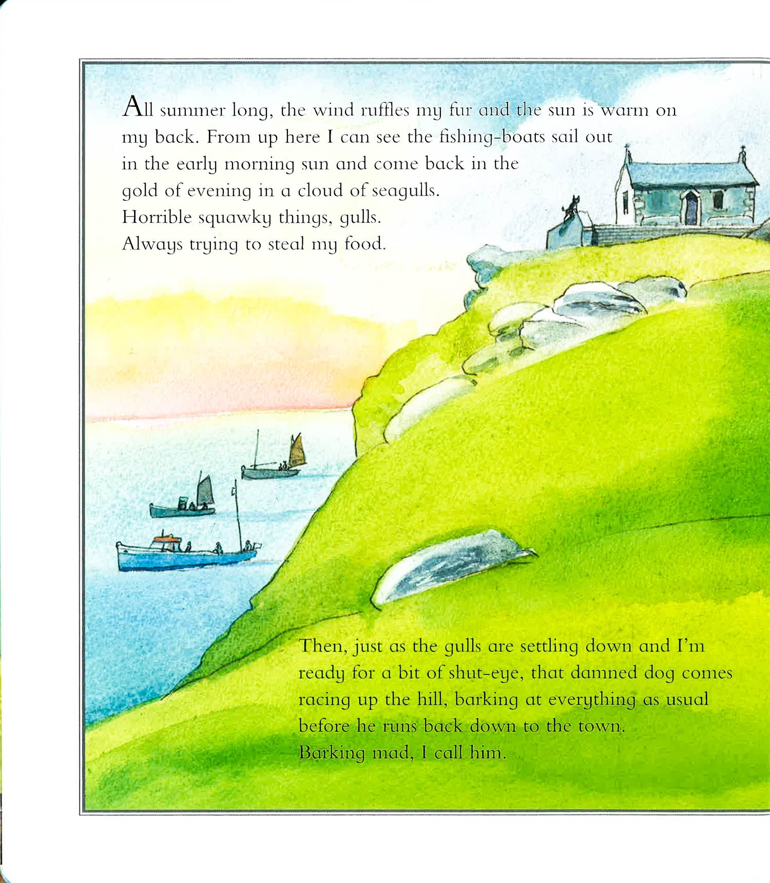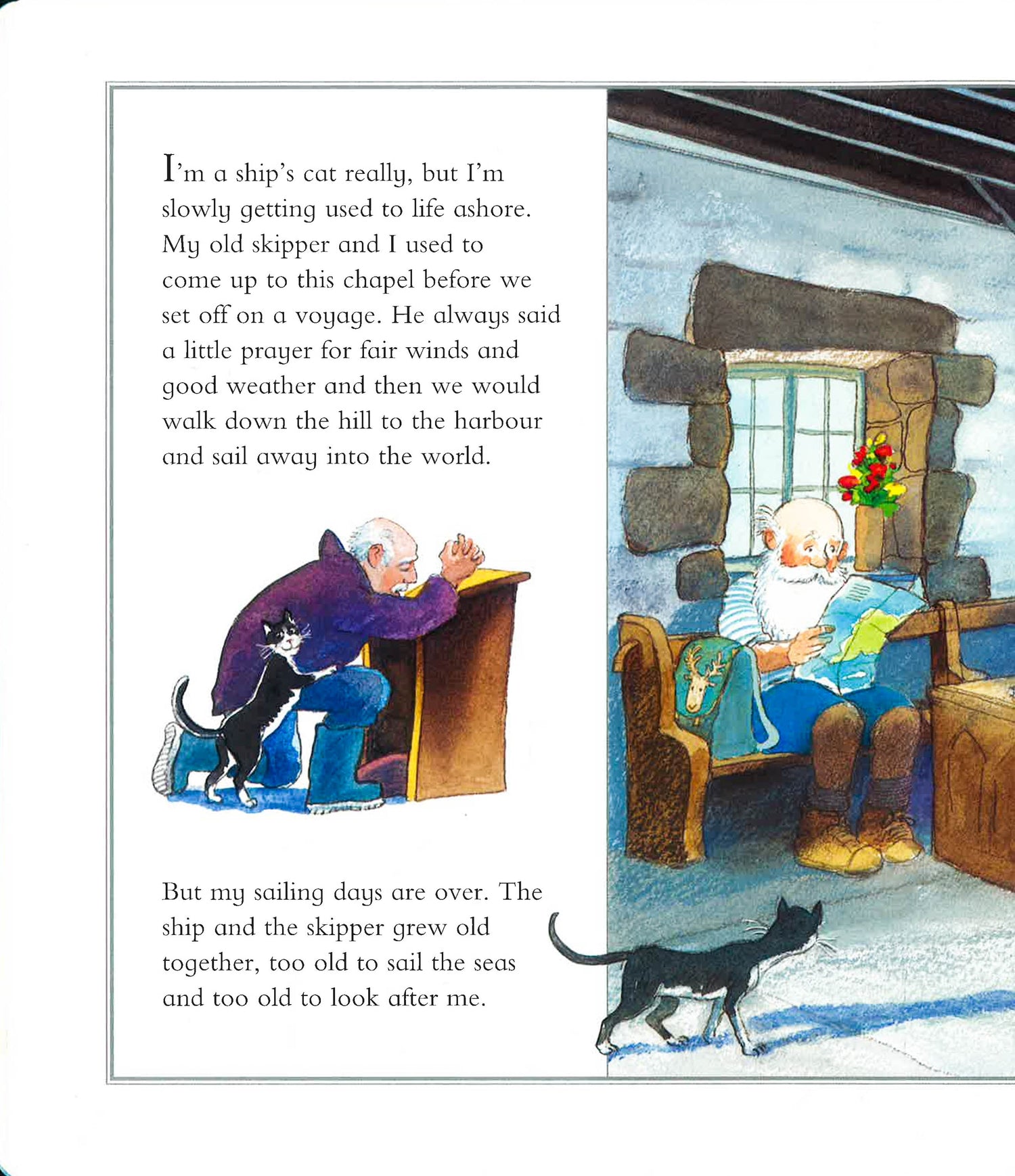 Autumn is a cold, lonely time for a stray cat in St. Ives, and winter is worse still. Most of all, it is a hungry time. Even for an ex-ship’s cat, life is a struggle, with fierce harbor cats and a yappy dog, all of whom chase him out of the village, away from its stores of tasty fish. The chapel on the hill becomes a safe haven for a while, but then, in the harshest depths of winter, comes a friendly village contingent bearing a gift of sausages! One would almost think it was Christmas. This is an absorbing, heartwarming tale.