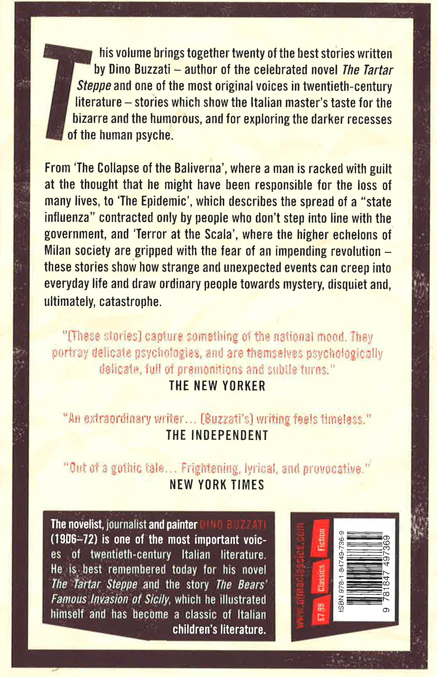 This volume brings together twenty of the best stories written by Dino Buzzati - author of the celebrated novel The Tartar Steppe and one of the most original voices in twentieth-century literature - stories which show the Italian master's taste for the bizarre and the humorous, and for exploring the darker recesses of the human psyche. From `The Collapse of the Baliverna', where a man is racked with guilt at the thought that he might have been responsible for the loss of many lives, to `The Epidemic', which describes the spread of a "state influenza" contracted only by people who don't step into line with the government, and `Terror at the Scala', where the higher echelons of Milan society are gripped with the fear of an impending revolution - these stories show how strange and unexpected events can creep into everyday life and draw ordinary people towards mystery, disquiet and, ultimately, catastrophe.
