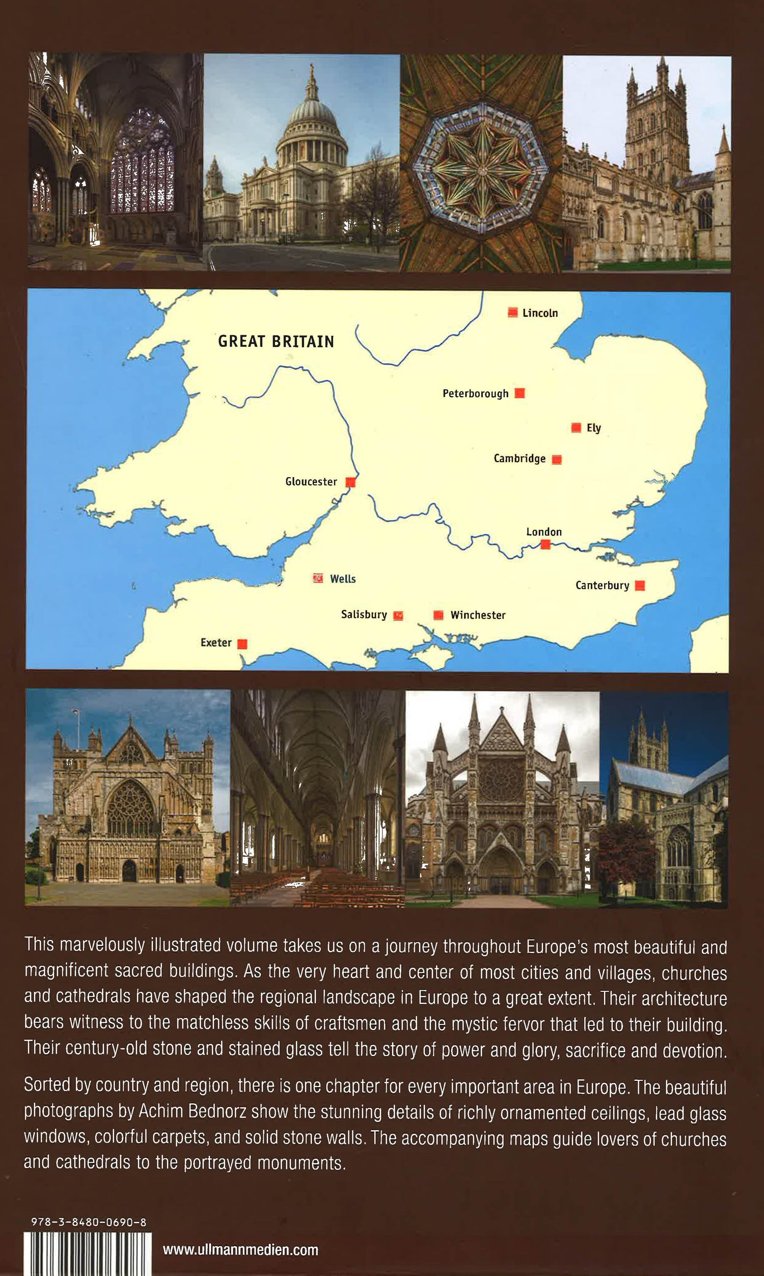 This marvelously illustrated volume takes us to a journey throughout Europe's most beautiful and magnificent sacred buildings. As the very heart and centre of most cities and villages, churches, cathedrals and basilicas have shaped the regional landscape in Europe to a great extent. Their architecture bears witness to the matchless skills of craftsmen and the mystic fervor that led to their building. Their century-old stone and stained glass tell the story of power and glory, sacrifice and devotion. Sorted by country and region, there is one chapter for every important area in Europe. The beautiful photographs by Achim Bednorz show the stunning details of richly ornamented ceilings, lead glass windows, colorful carpets and solid stone walls. The accompanying maps guide lovers of churches and cathedrals to the portrayed monuments. Throughout its 12 fascinating chapters, this book reveals some interesting details about the buildings, their architecture, the interior, their artful embellishments and their sacral and historical meaning. This book is a must-have for people interested in Christian sacral monuments, their history, architecture and interior.