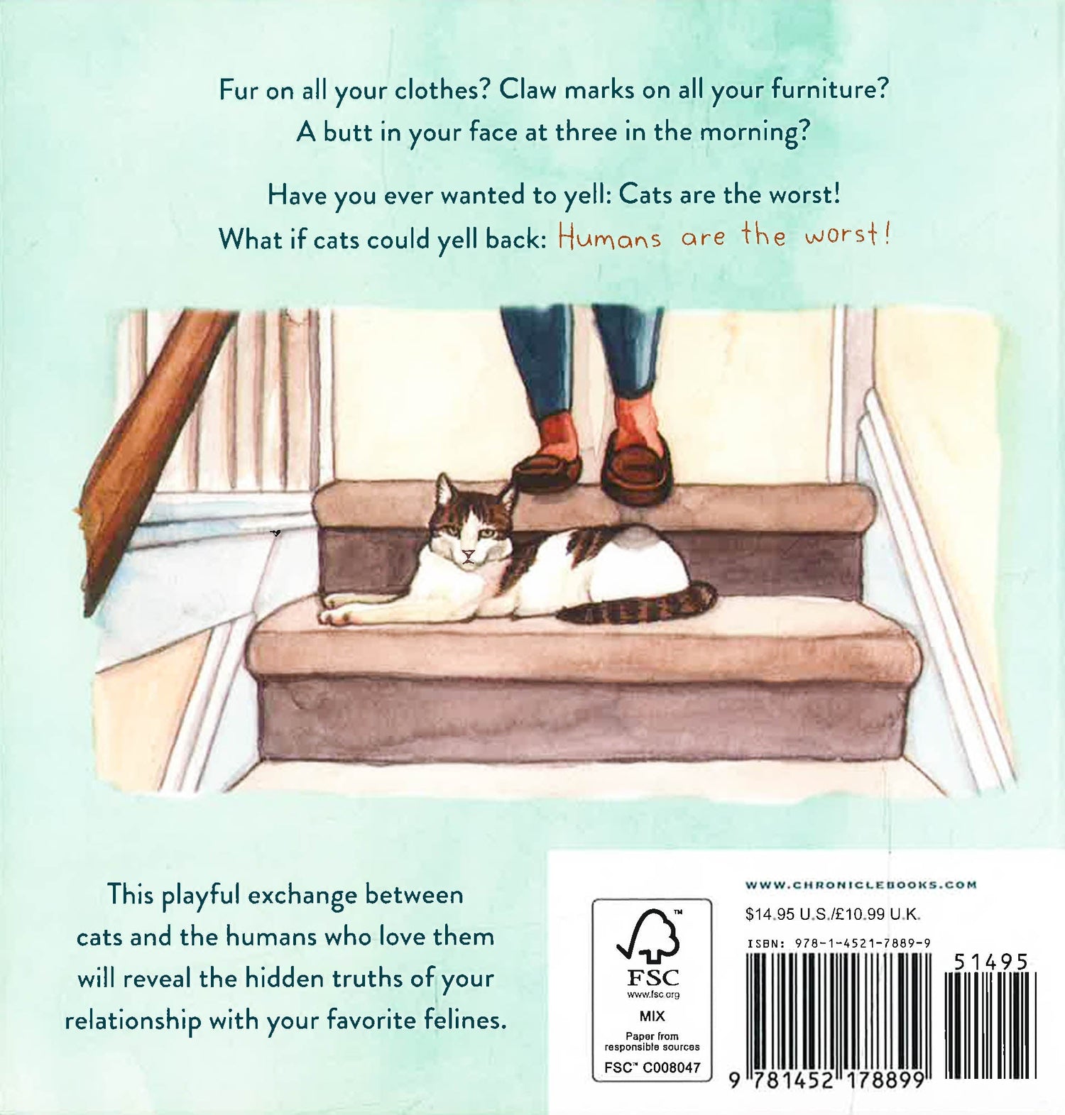 From shredded furniture to messy litter boxes to fur on everything, there are times when every cat owner wants to shout, "Cats are the worst!" This playful book shows what it looks like if cats could shout back, "No, humans are the worst!" For every grievance humans have about their feline friends (knocked over glasses!), cats have one about their humans (unprovoked vacuuming!)-and each is explored in a lively exchange that is as funny as it is familiar. Filled with watercolor illustrations that perfectly capture every moment of cat-titude and packaged in a lovingly clawed case, Cats Are the Worst is a relatable laugh for anyone who might agree that cats are the worst-but also, maybe, a little bit the best.