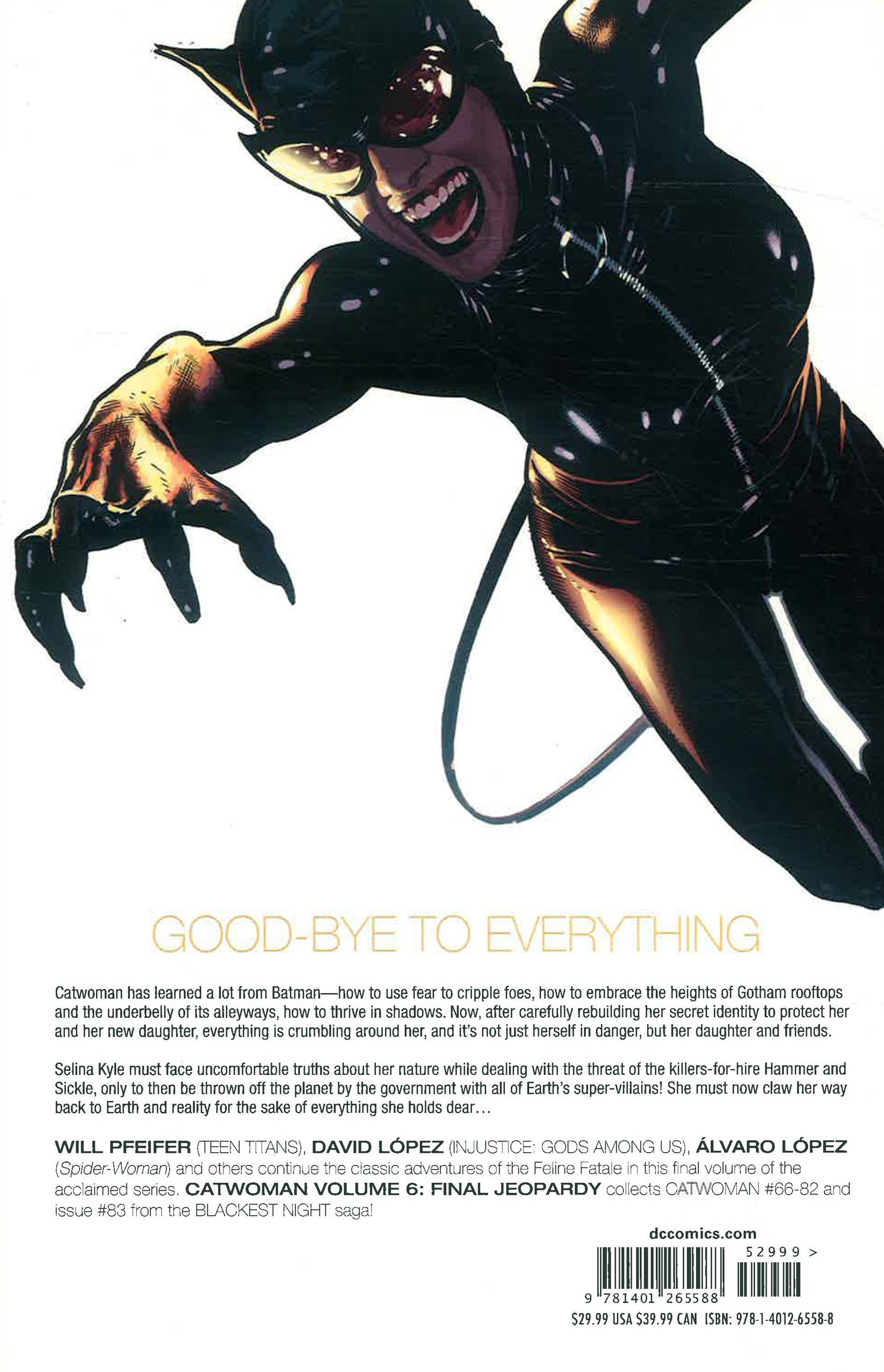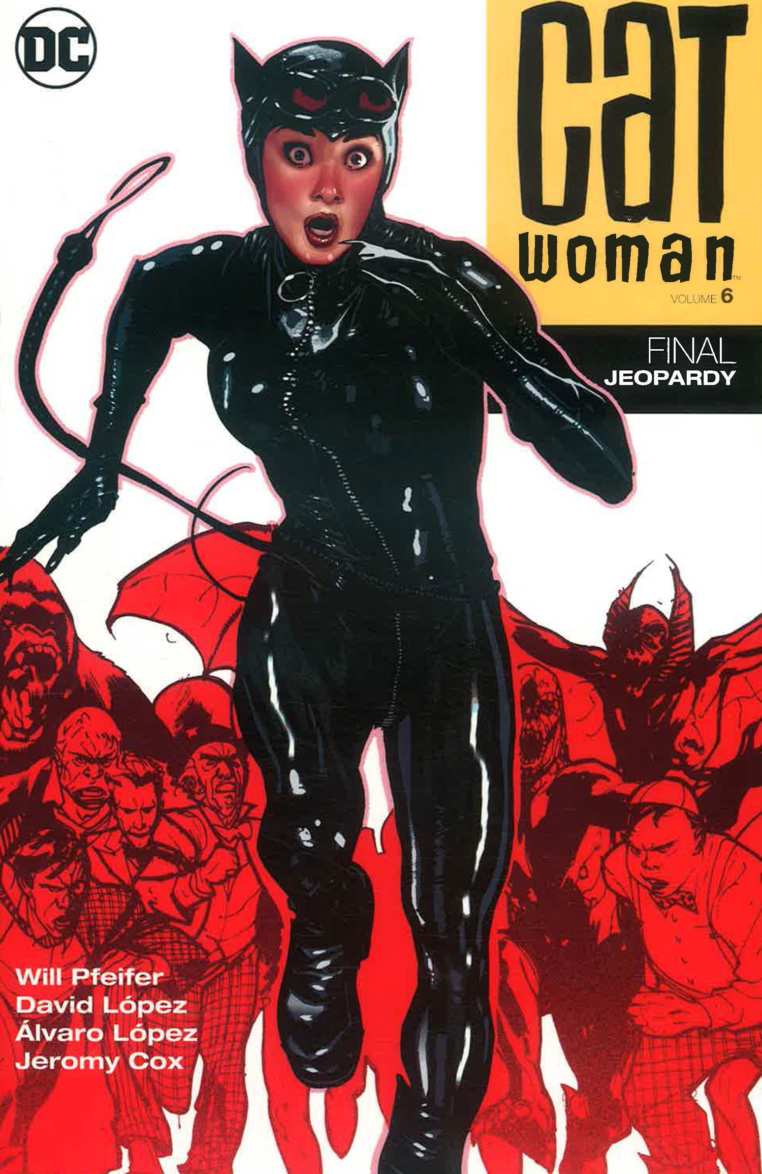 Will Pfeifer (TEEN TITANS), David López (INJUSTICE: GODS AMONG US), Álvaro López (Spider-Woman) and others continue the classic adventures of the Feline Fatale in this final volume of the acclaimed series. CATWOMAN VOLUME 6: FINAL JEOPARDY collects CATWOMAN #66-82 and issue #83 from the BLACKEST NIGHT saga!