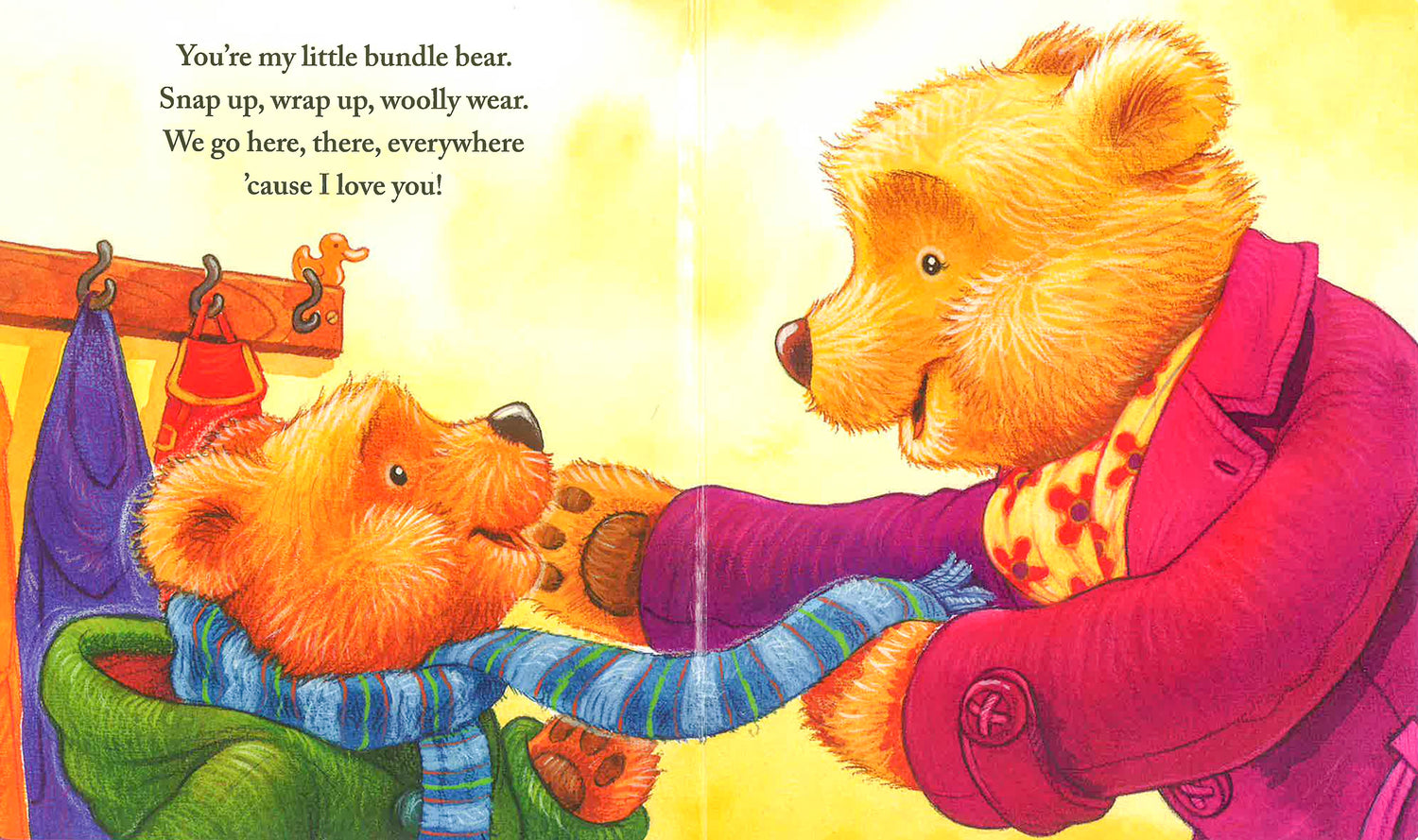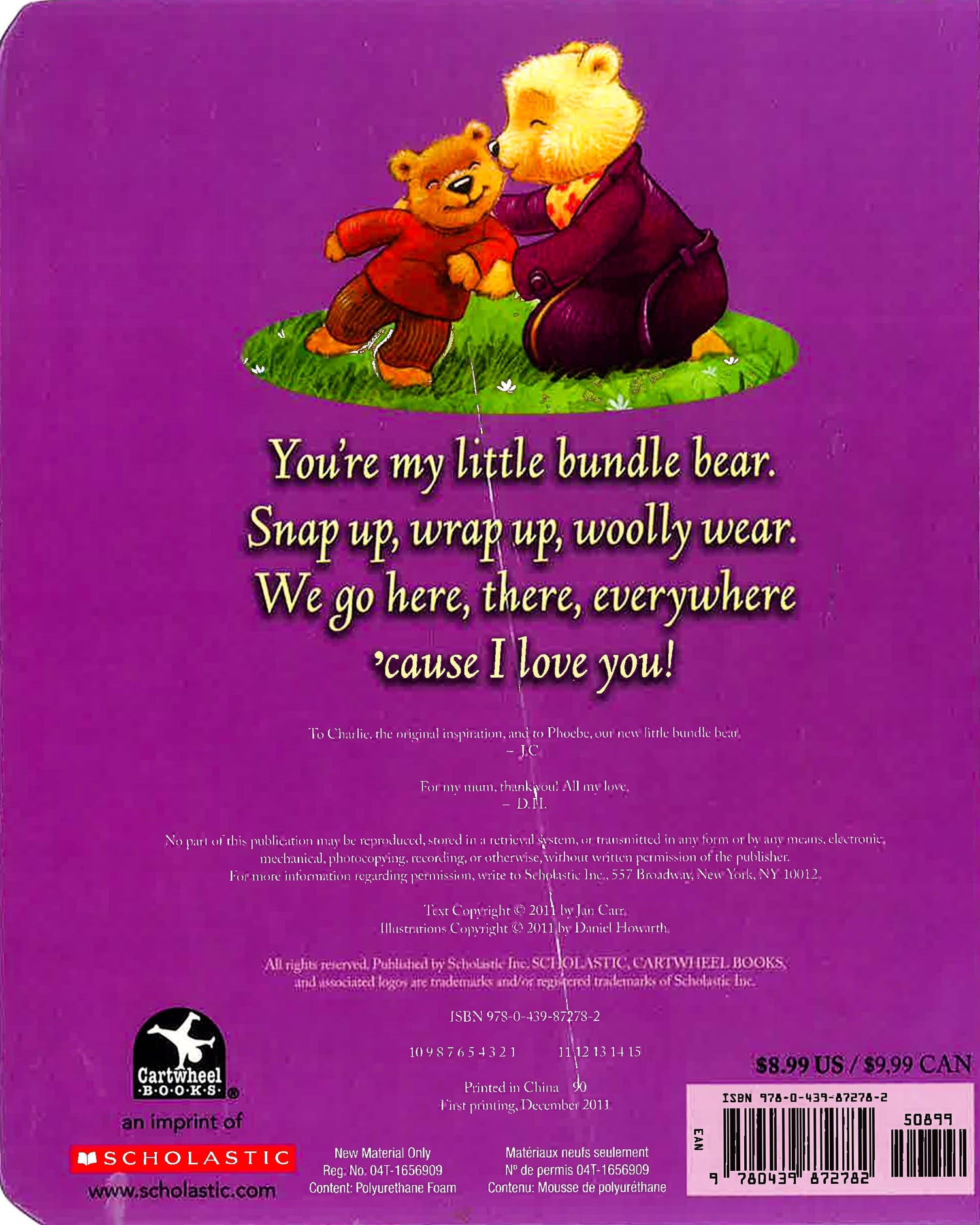 A snuggle-through-the-afternoon and time-for-goodnight padded board book! "You're my little bundle bear Snap up, wrap up, woolly wear We go here, there, everywhere 'Cause I love you!" Mama and her cub share a tizzy-busy afternoon, and seal the day with a kiss. With Jan Carr's rhythmic text and Daniel Howarth's sweet-as-sun illustrations, this is a truly joyful ode to a parent's love for their child.