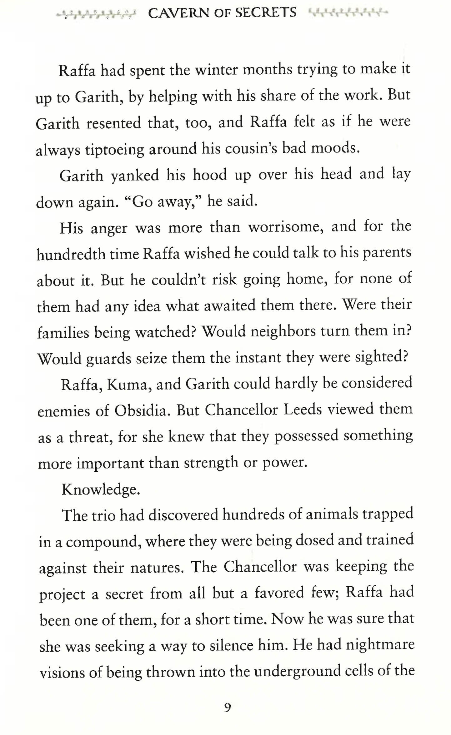 In the second installment of the spellbinding Wing & Claw series, Newbery Medal-winning author Linda Sue Park takes a young apothecary hero to new heights of danger, exciting adventure, and intriguing botanical magic.Raffa Santana has spent all winter hiding in the harsh wilderness of the Sudden Mountains, and now it?s time to return home. Home, where his parents will help him fight back against the vile Chancellor who has captured and altered the wild creatures of the Forest of Wonders. Home, where Raffa?s beloved companion, Echo the bat, will recover from his mysterious sickness.To get there, Raffa must make a treacherous journey across Obsidia. Along the way, he will discover a luminous plant that might be the key to saving the creatures stuck in the Chancellor?s grasp . . . if only Raffa can unlock the plant?s secrets and deliver the cure to the captive animals.Cavern of Secrets masterfully explores one boy?s responsibility to his friends, family, and the wider world.