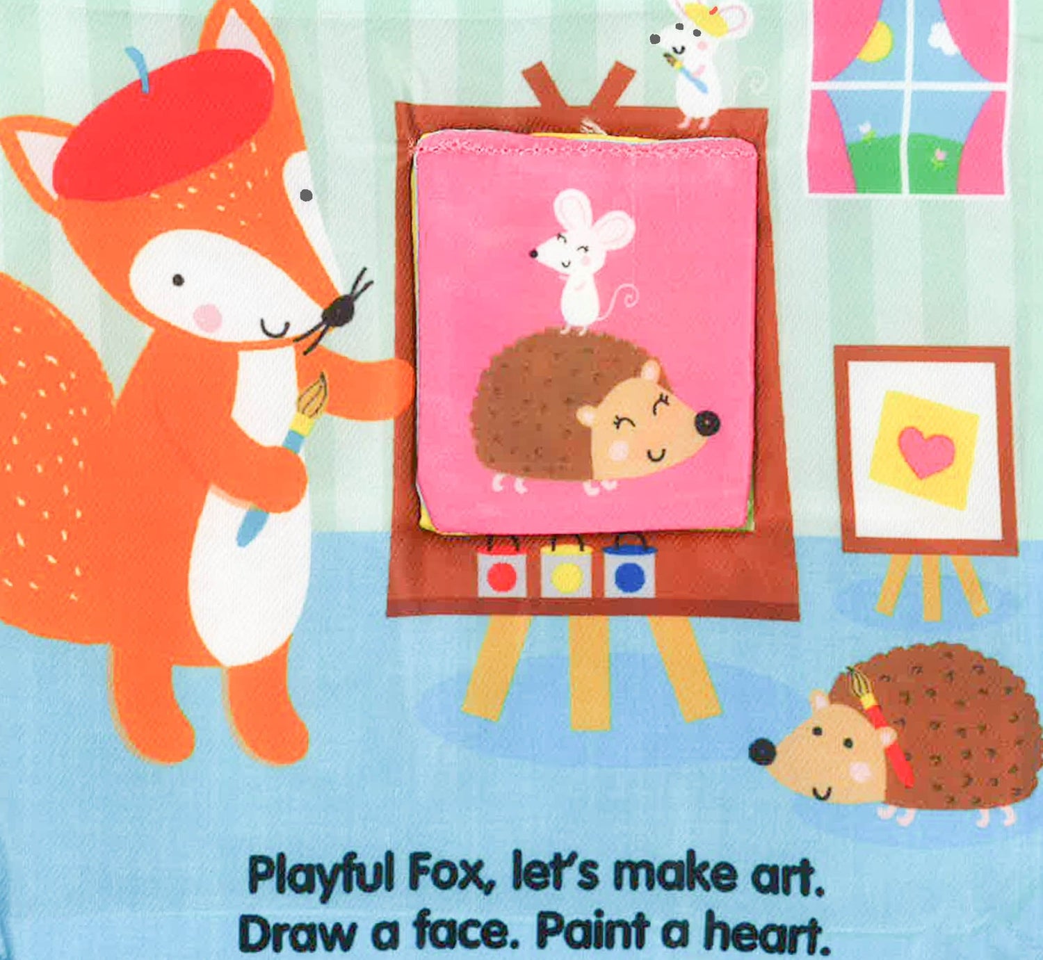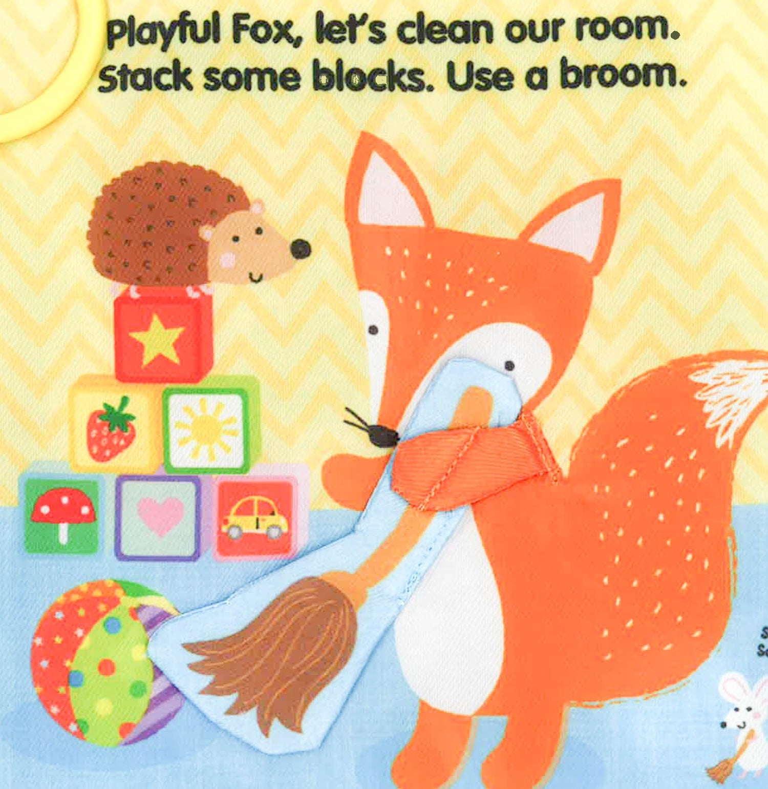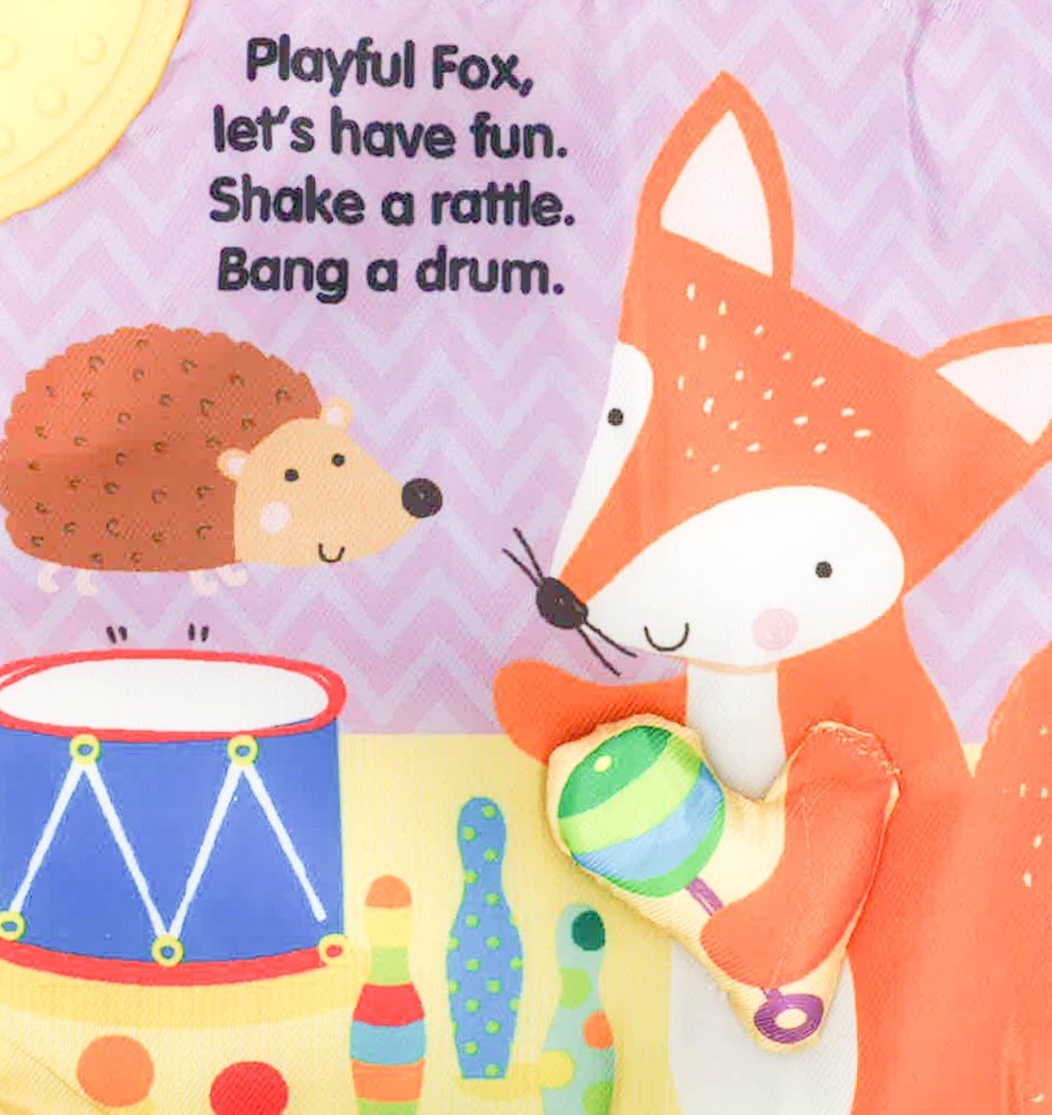 Children will love to follow playful Fox and Hedgehog throughout their busy day as they slide, paint, and more in this adorable Deluxe Cloth Book with whimsical rhymes! Interacting with soft pages helps develop fine motor skills, and crinkle sounds and peek-a-boo flaps throughout encourage learning. The attached stroller ring helps you take this delightful and entertaining storybook with you wherever you go!