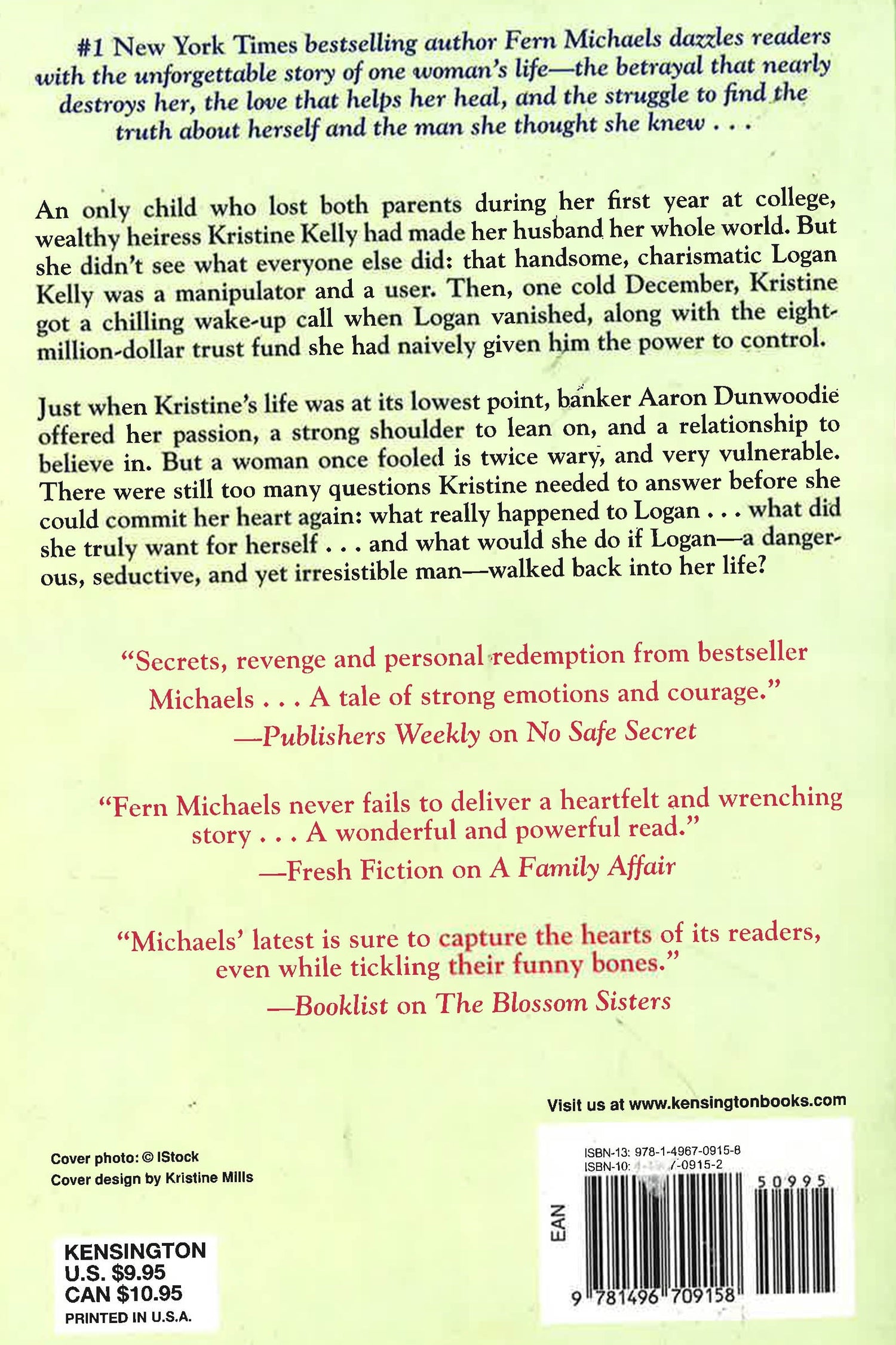 Just when Kristine’s life was at its lowest point, banker Aaron Dunwoodie offered her passion, a strong shoulder to lean on, and a relationship to believe in. But a woman once fooled is twice wary, and very vulnerable. There were still too many questions Kristine needed to answer before she could commit her heart again: what really happened to Logan . . . what did she truly want for herself . . . and what would she do if Logan—a dangerous, seductive, and yet irresistible man—walked back into her life?