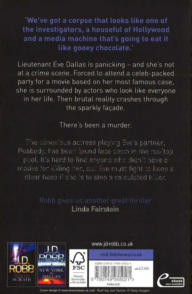 The latest novel in J.D. Robb's addictive 'In Death' series, where Eve Dallas specialises in tracking down those who break the law - including the ones sworn to uphold it. We've got a corpse that looks like one of the investigators, a houseful of Hollywood and a media machine that's going to eat it like gooey chocolate.'Lieutenant Eve Dallas is panicking - and she's not at a crime scene. Forced to attend a celeb-packed party for a new movie based on her most famous case, she is surrounded by actors who look like everyone in her life. Then brutal reality crashes through the sparkly facade.There's been a murder.The obnoxious actress playing Eve's partner, Peabody, has been found face down in the rooftop pool. It's hard to find anyone who didn't have a motive for killing her, but Eve must fight to keep a clear head and stop a calculated killer.'Robb gives us another great thriller' Linda Fairstein