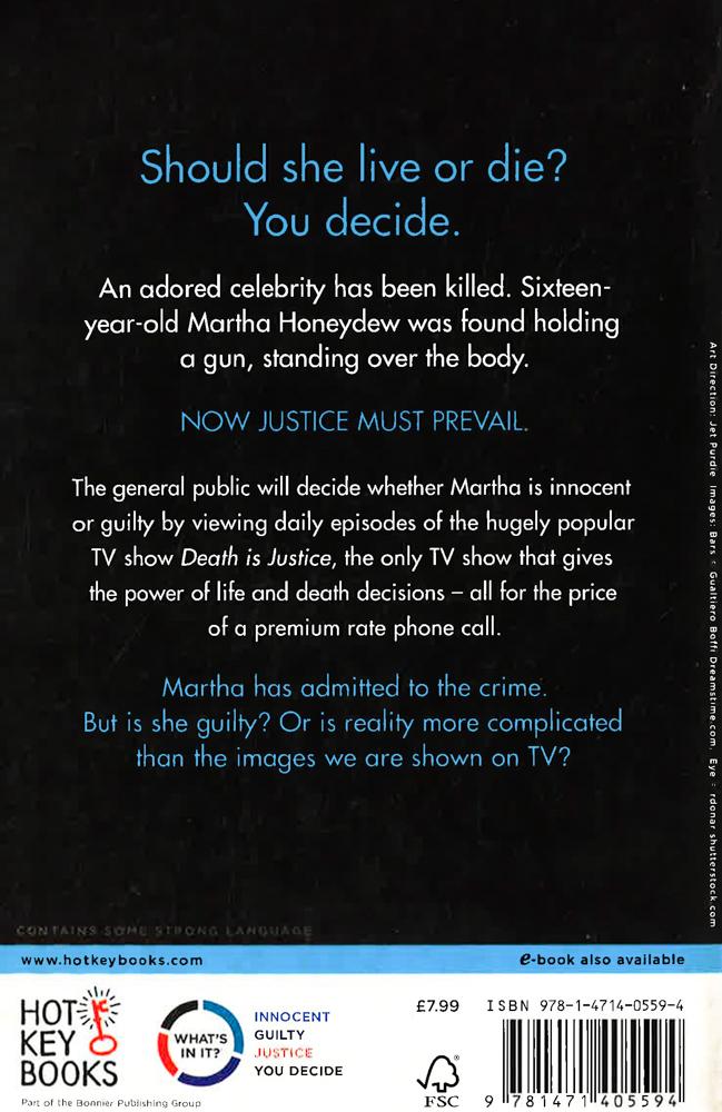 Should she live or should she die? You decide. A heart-stopping thriller. Shortlisted for the Lancashire Libraries Book of the Year 2018. An adored celebrity has been killed. Sixteen-year-old Martha Honeydew was found holding a gun, standing over the body. NOW JUSTICE MUST PREVAIL. The general public will decide whether Martha is innocent or guilty by viewing daily episodes of the hugely popular TV show Death is Justice, the only TV show that gives the power of life and death decisions - all for the price of a premium rate phone call. Martha has admitted to the crime. But is she guilty? Or is reality more complicated than the images we are shown on TV? Should she live or should she die? You decide. A heart-stopping thriller. Shortlisted for the Lancashire Libraries Book of the Year 2018. An adored celebrity has been killed. Sixteen-year-old Martha Honeydew was found holding a gun, standing over the body. NOW JUSTICE MUST PREVAIL. The general public will decide whether Martha is innocent or guilty by viewing daily episodes of the hugely popular TV show Death is Justice, the only TV show that gives the power of life and death decisions - all for the price of a premium rate phone call. Martha has admitted to the crime. But is she guilty? Or is reality more complicated than the images we are shown on TV?