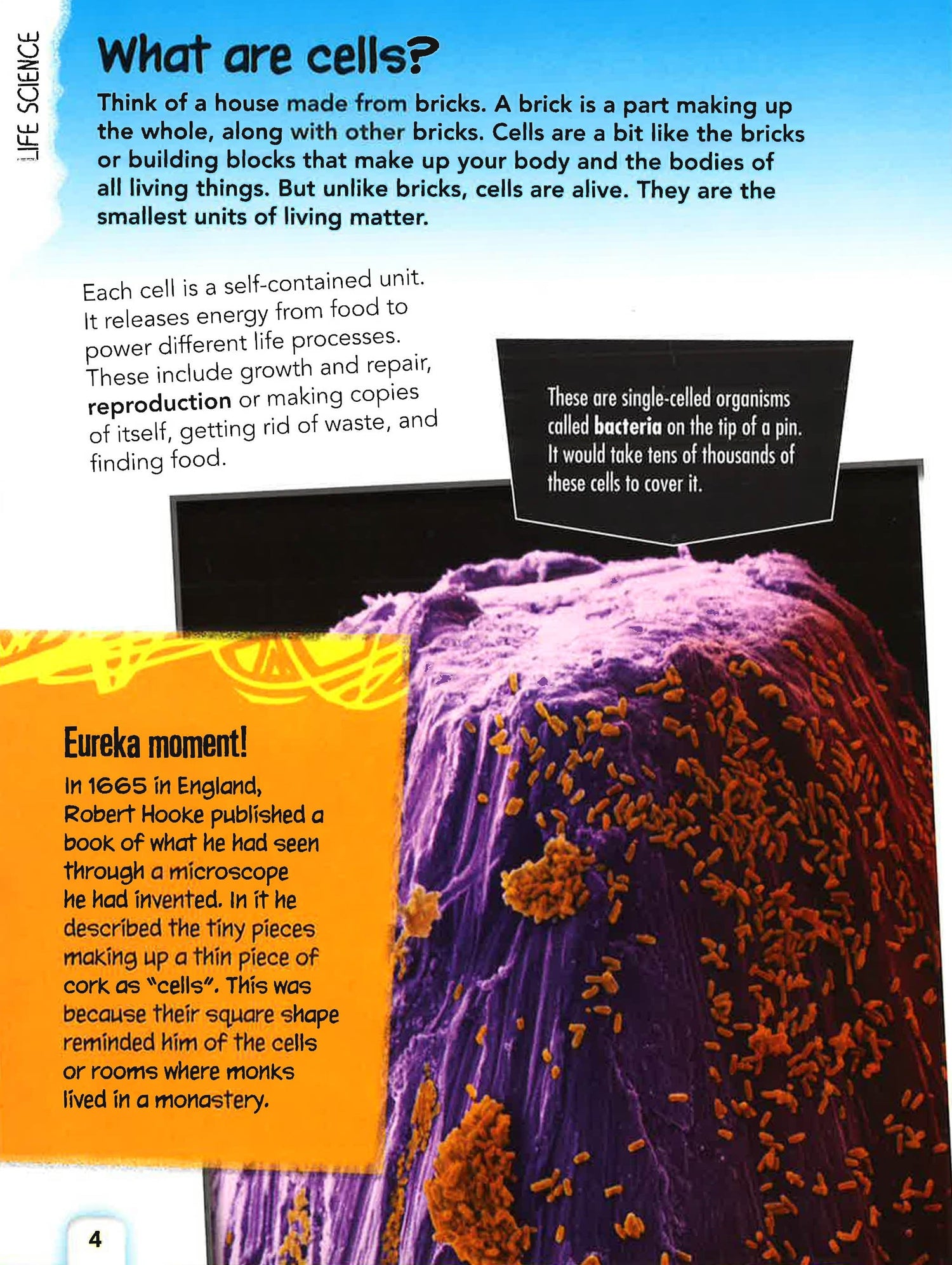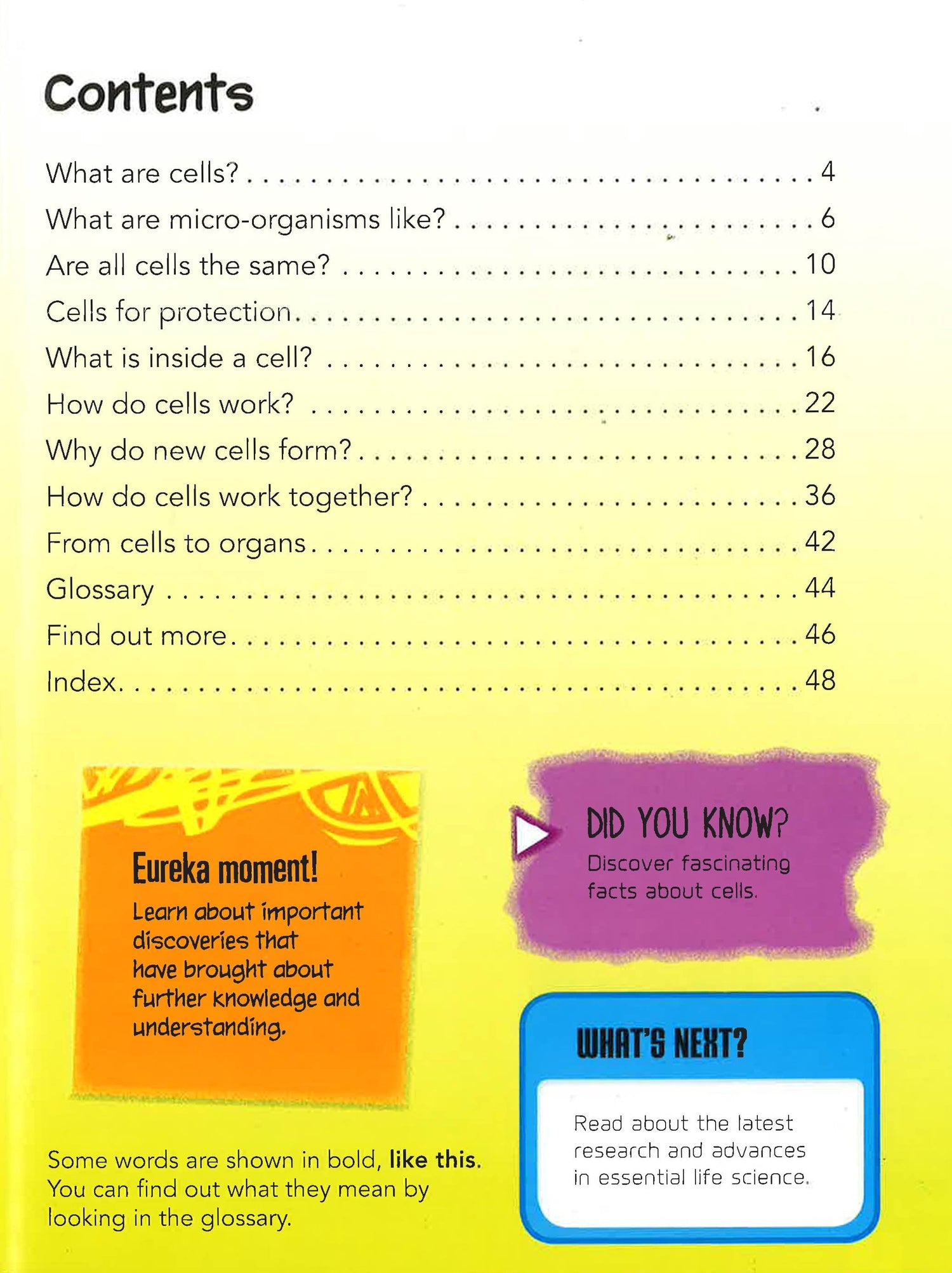 Tiny cells are the building blocks of plant and animal life. Some cells make up simple body parts, such as tissues; others complete complex tasks such as transporting oxygen or carrying messages. This book will explore the many different types of cells and the roles they play.