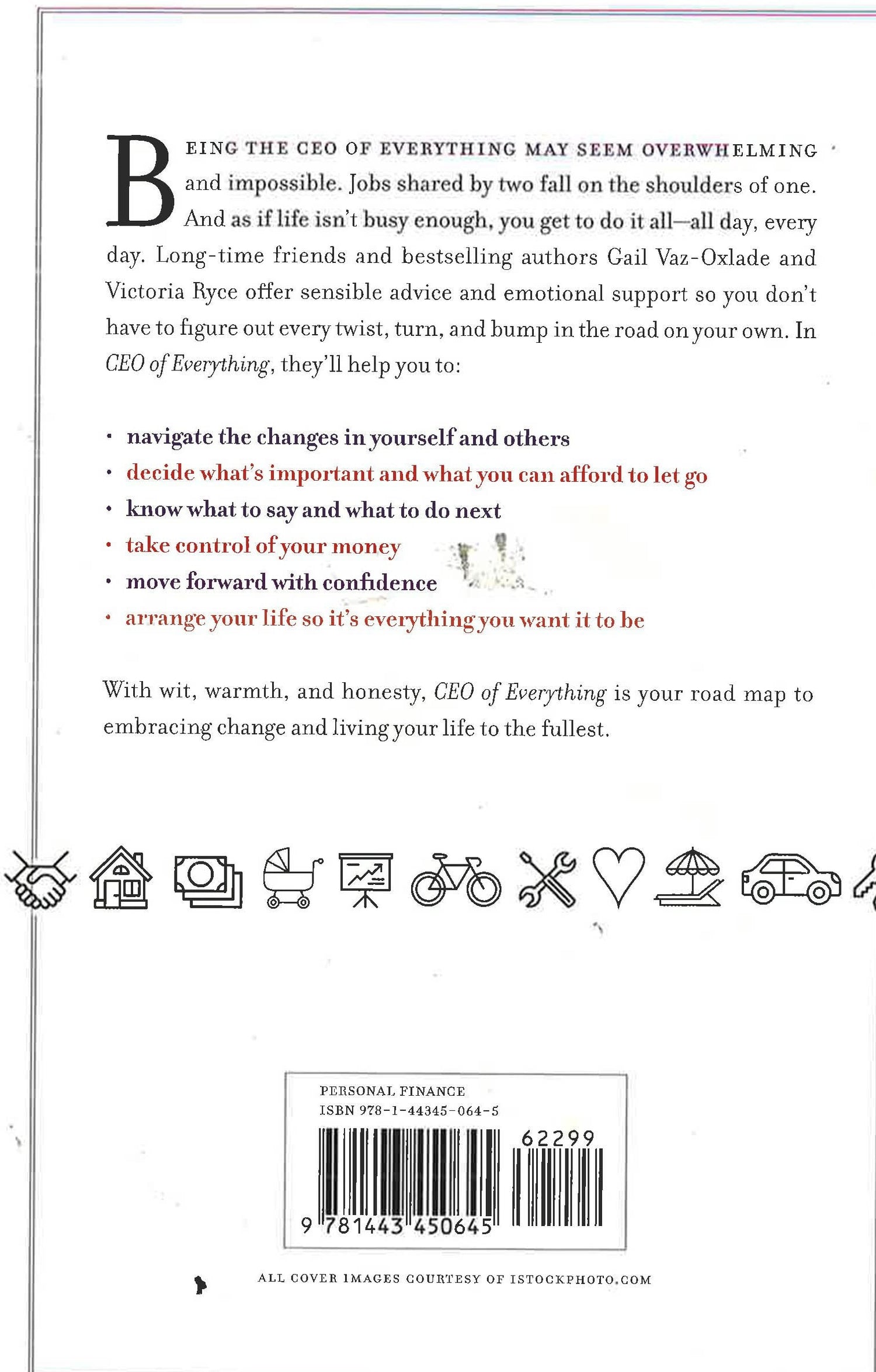 For over a decade, millions of Canadians have counted on Gail Vaz-Oxlade to tell them the truth about managing their money. Now, Gail and her great friend and co-author, Victoria Ryce, share their no-nonsense secrets for taking control when you suddenly become CEO of Everything. From paying the bills to developing new friendships to changing the battery in the smoke detector, Gail and Victoria cover it all.Between them, Gail and Victoria have experienced divorce and widowhood, and have had to deal with the resulting "single" that attends when life just doesn't work out as you imagined it would. They have friends who have never remarried, never cohabited, never felt the need to join up. In CEO of Everything, Gail and Victoria share what they've learned over the years: how to survive loss, what works and what doesn't, how to deal with it all, and how to embrace the fact that you are in charge.