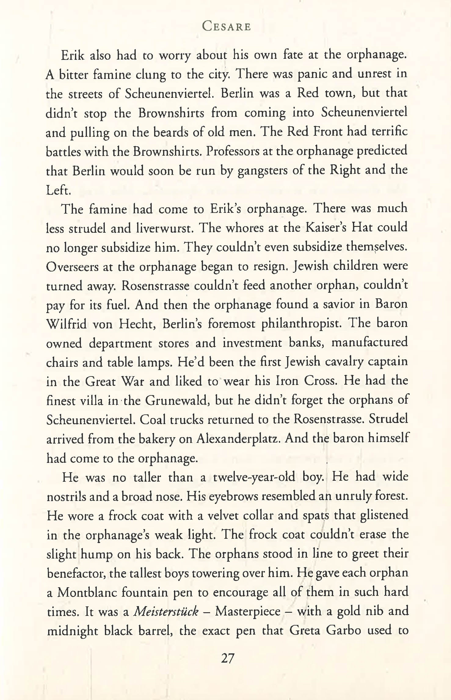 Canaris is a man of contradictions who, while serving the regime, seeks to undermine the Nazis and helps Cesare hide Berlin's Jews from the Gestapo. But the Nazis will lure many to Theresienstadt, a phony paradise in Czechoslovakia with sham restaurants, novelty shops, and bakeries, a cruel ghetto and way station to Auschwitz. When the woman Cesare loves, a member of the Jewish underground, is captured and sent there, Cesare must find a way to rescue her.