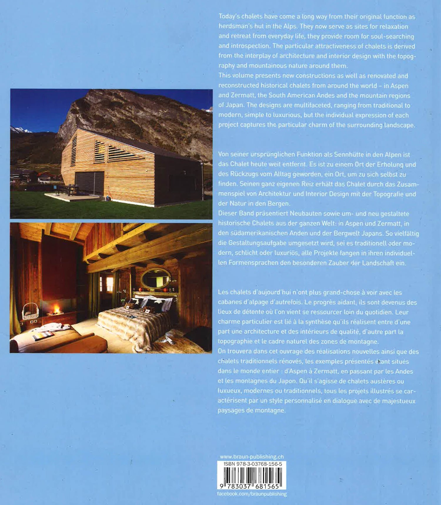 The chalet of today is a far cry from the original herds - man's hut. Its triumphant ascent to elegant mountain mansion, frequently used as a holiday getaway by the societal elite, began in the 19th century. Its allure today is unbroken. As a place of relaxation and retreat from the day-to-day, chalets are being built in mountainous regions around the world. The chalet derives its charm from the combination of the architectural and the surrounding nature. Instead of sim - ply fitting into the landscape by necessity, the dwellings draw it in. In this way a unique formal language emerges. This volume displays the charm of nature, while winning over the viewer with contemporary designs, which range from the classical wooden house with flat gabled roof, to the high-tech mountain hut.