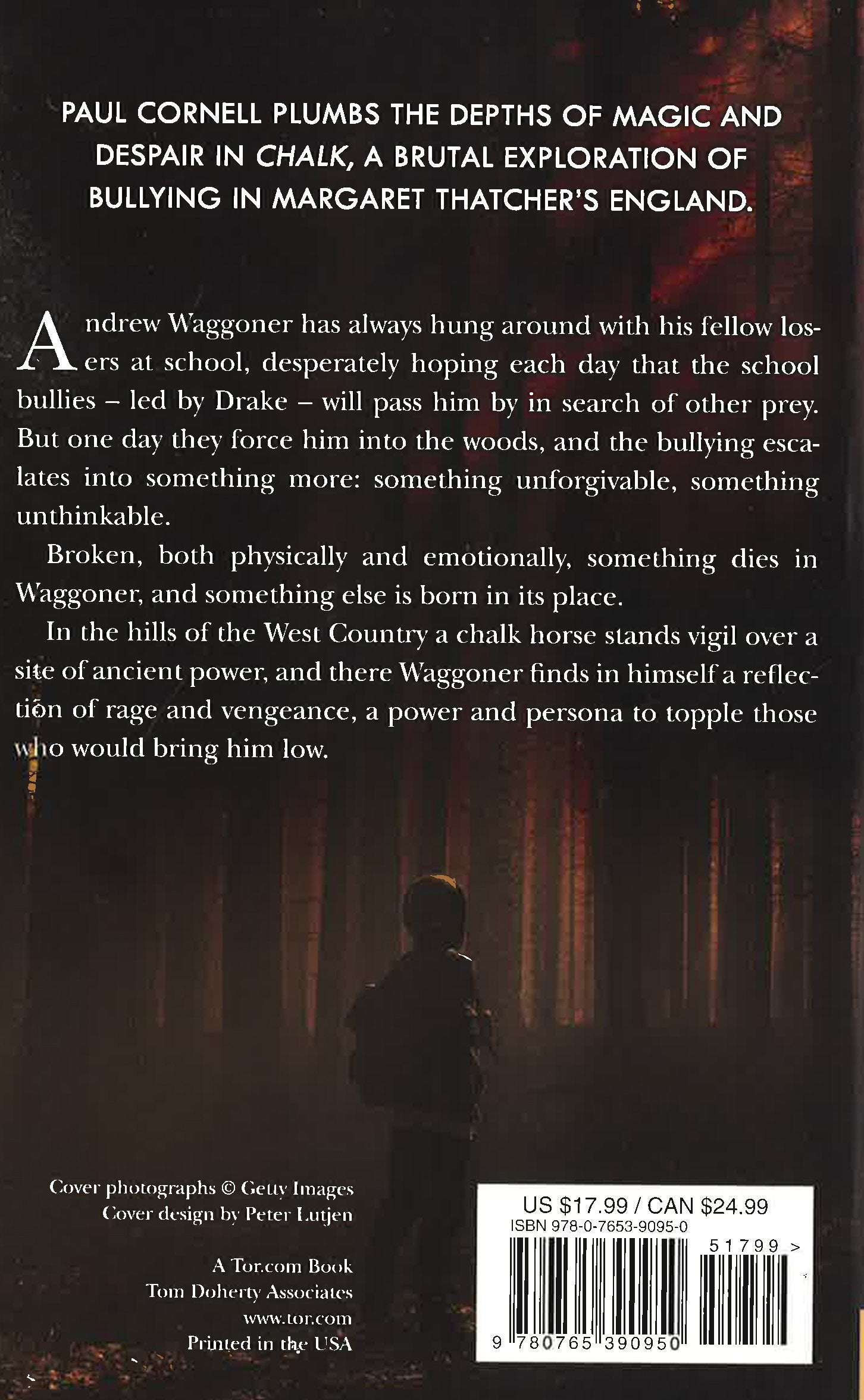 Paul Cornell plumbs the depths of magic and despair in Chalk, a brutal exploration of bullying in Margaret Thatcher's England.Andrew Waggoner has always hung around with his fellow losers at school, desperately hoping each day that the school bullies — led by Drake — will pass by him in search of other prey. But one day they force him into the woods, and the bullying escalates into something more; something unforgivable; something unthinkable.Broken, both physically and emotionally, something dies in Waggoner, and something else is born in its place.In the hills of the West Country a chalk horse stands vigil over a site of ancient power, and there Waggoner finds in himself a reflection of rage and vengeance, a power and persona to topple those who would bring him low.
