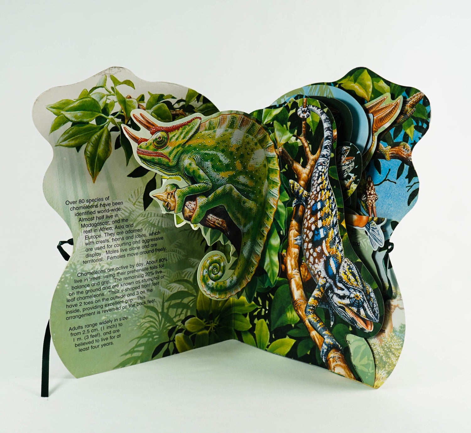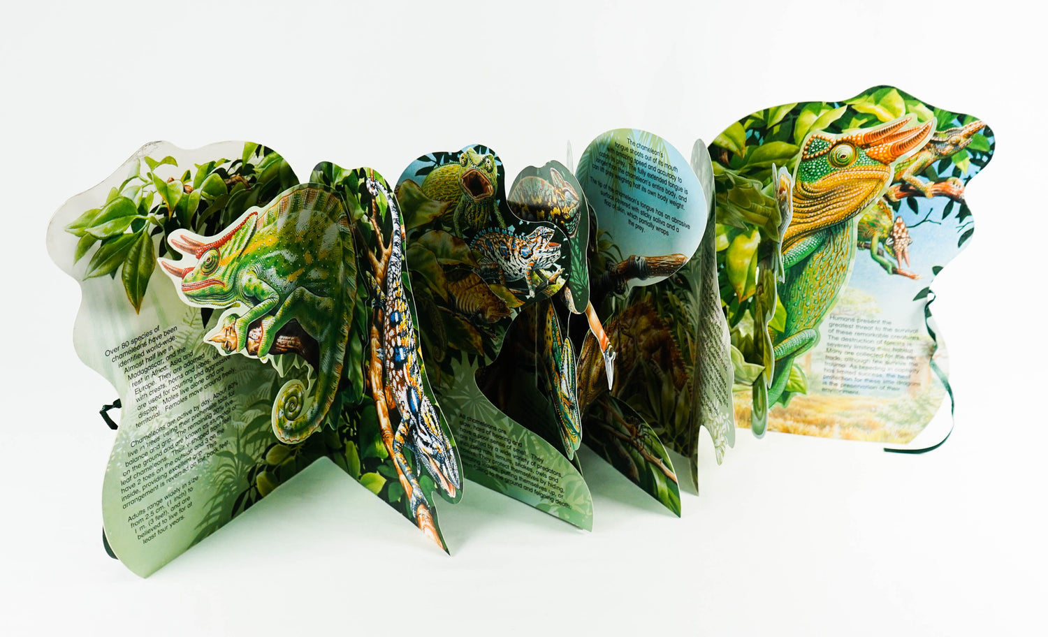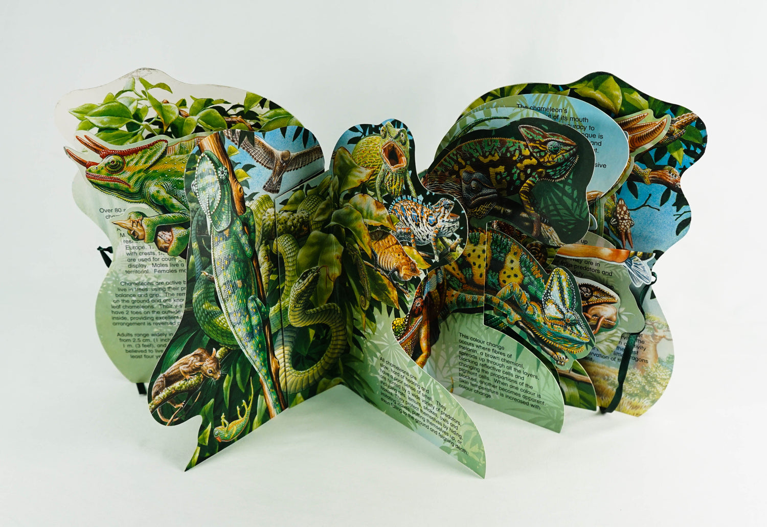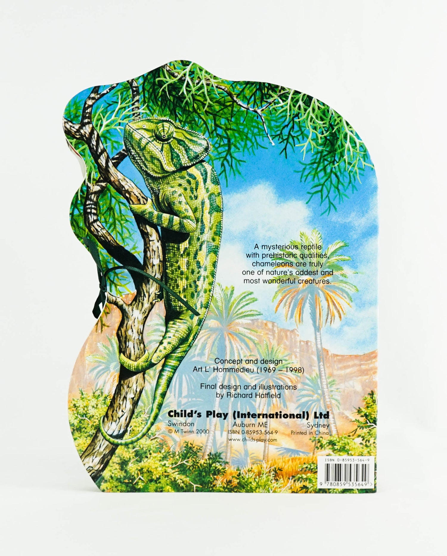 An information book focusing on the often misunderstood chameleon.The shy chameleon still remains a mystery for many of us. This book, packed with information, shows that if we come close to these little animals, we are more likely to understand and protect them. Full of amazing facts, the vibrant and detailed illustrations bring information to 3-D life and lead the reader through the amazing world of this creature in these beautifully engineered cardboard books.This giant format version should be suitable for either the primary classroom or a child's bedroom.