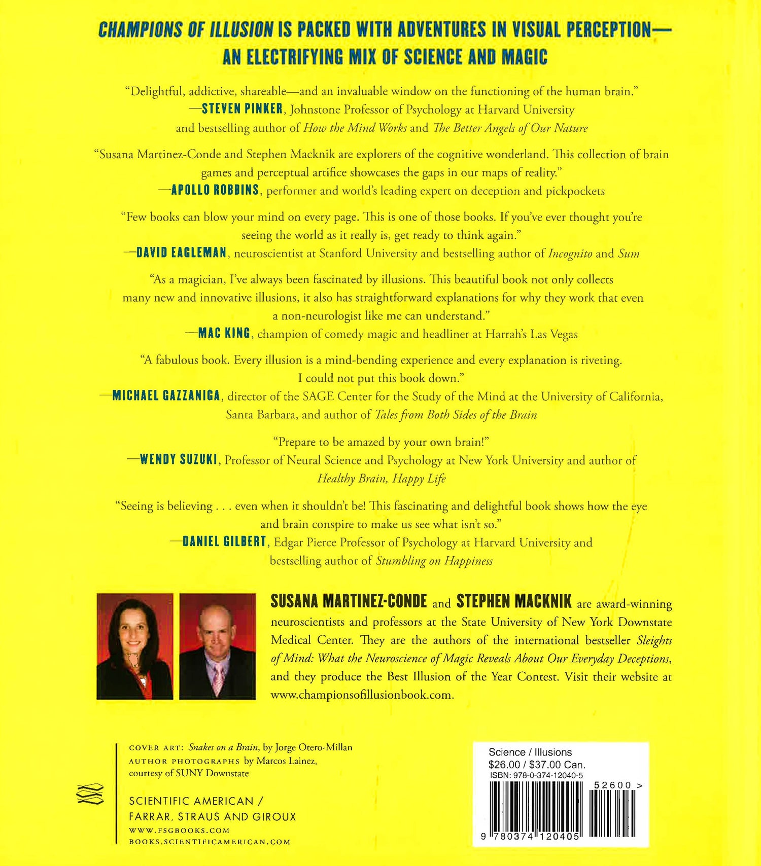 In Champions of Illusion, Susana Martinez-Conde and Stephen Macknik present a smorgasbord of mystifying images, many selected from their Best Illusion of the Year Contest. Whether it's false motion, tricks of perspective, or shifting colors, Champions of Illusion is packed with adventures in visual perception. If you have ever found yourself face-to-face with an utterly bewildering illusion, you know the powerful effect such images have on the mind. The question we often ask ourselves is, How is that possible? Martinez-Conde and Macknik, who study the intersection of neuroscience, illusions, and stage magic, explain just why we think we see the things we see.
