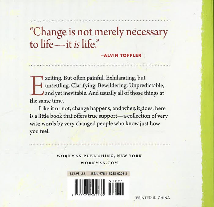 A COMPENDIUM OF WISDOM "Just when I discovered the meaning of life, they changed it." - GEORGE CARLIN When change comes we have two options: Resist it, and lose. Or go with the flow, and grow. Which means there's really just one option--embracing change is the only path to living your true life. So laugh at it, with George Carlin. Celebrate it, like Patti Smith and David Bowie. Above all, grow with it, like Maya Angelou, Stephen Hawking, Rebecca Solnit, Rumi, and so many others. Arranged alphabetically by subject--including Adapting, Control, Faith, Letting Go, New Beginnings, Surprises--CHANGE HAPPENS is the book that says: You can do this...as often as you need to hear it. "Change is not merely necessary to life--it is life." - ALVIN TOFFLER Exciting. But often painful. Exhilarating, but unsettling. Clarifying. Bewildering. Unpredictable, and yet inevitable. And usually all of those things at the same time. Like it or not, change happens, and when it does, here is a little book that offers true support--a collection of very wise words by very changed people who know just how you feel.