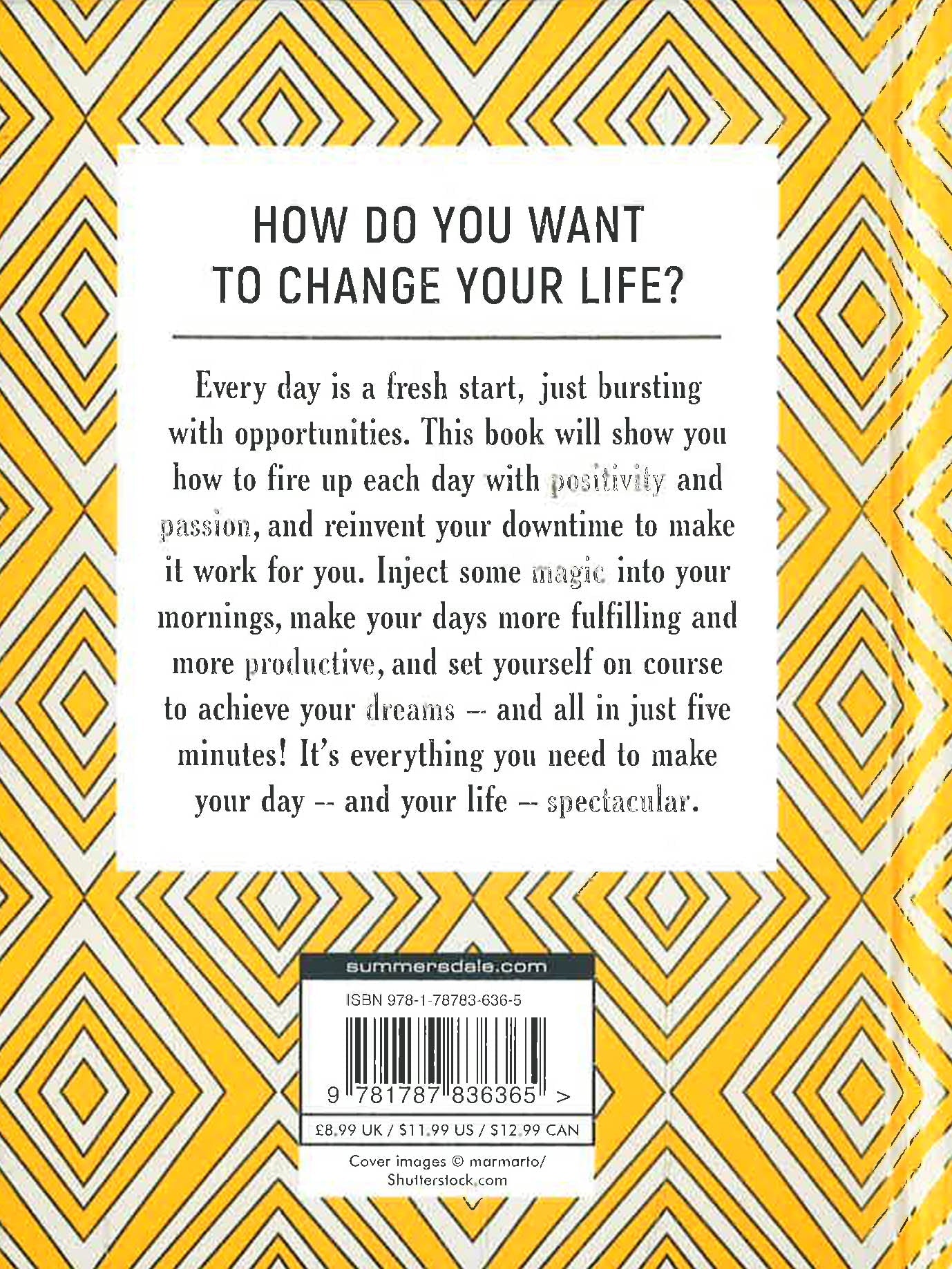 Every day is a fresh start, just bursting with opportunities. This book will show you how to fire up each day with positivity and passion, and reinvent your downtime to make it work for you. Inject some magic into your mornings, make your days more fulfilling and more productive, and set yourself on course to achieve your dreams – and all in just five minutes! It’s everything you need to make your day – and your life – spectacular.