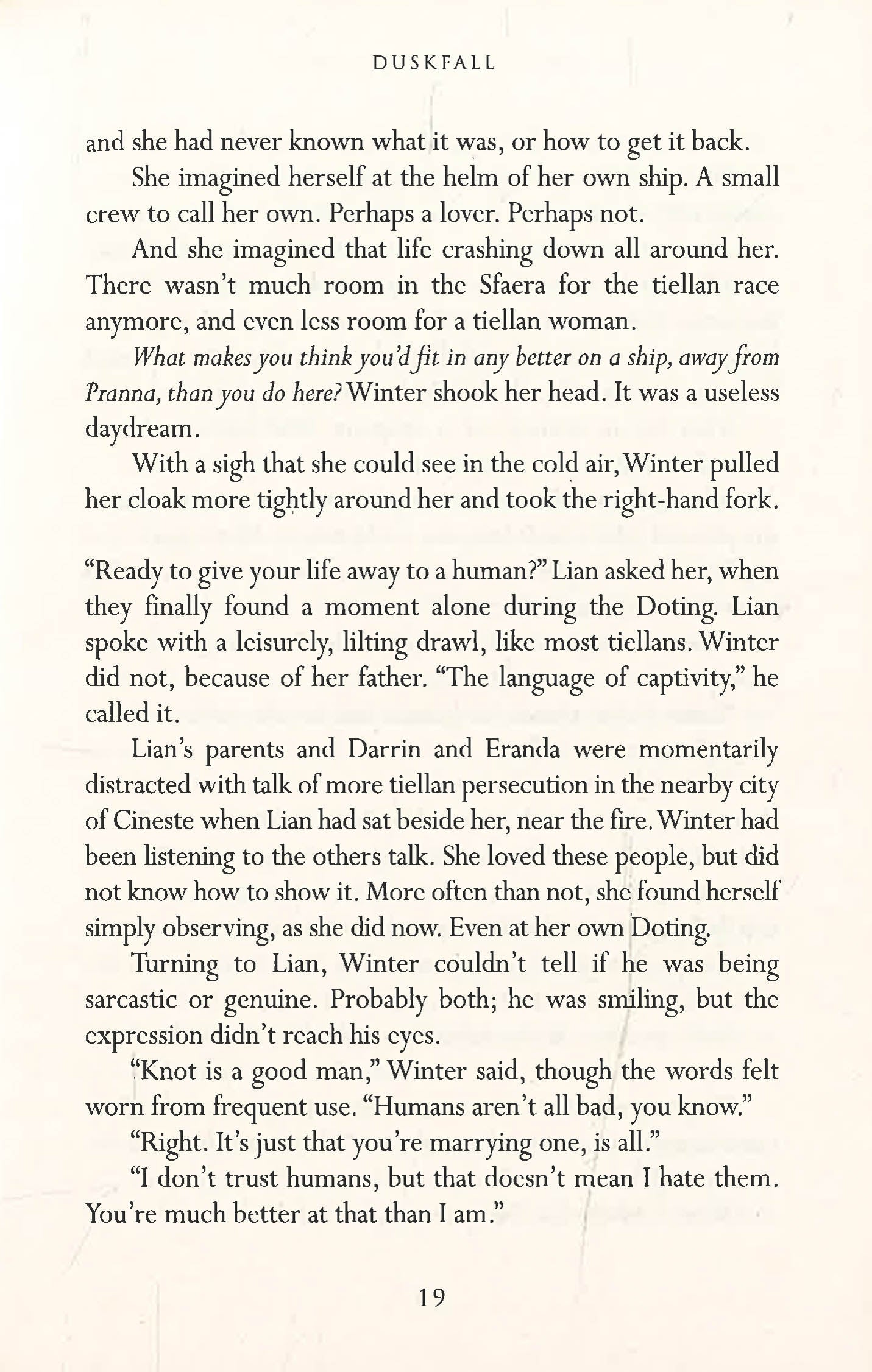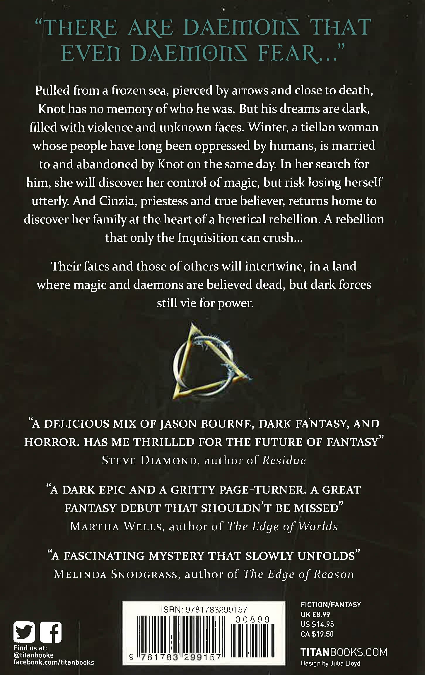 Pulled from a frozen sea, pierced by arrows and close to death, Knot has no memory of who he was. But his dreams are dark, filled with violence and unknown faces. Winter, a tiellan woman whose people have long been oppressed by humans, is married to and abandoned by Knot on the same day. In her search for him, she will discover her control of magic, but risk losing herself utterly. And Cinzia, priestess and true believer, returns home to discover her family at the heart of a heretical rebellion. A rebellion that only the Inquisition can crush... Their fates and those of others will intertwine, in a land where magic and daemons are believed dead, but dark forces still vie for power.