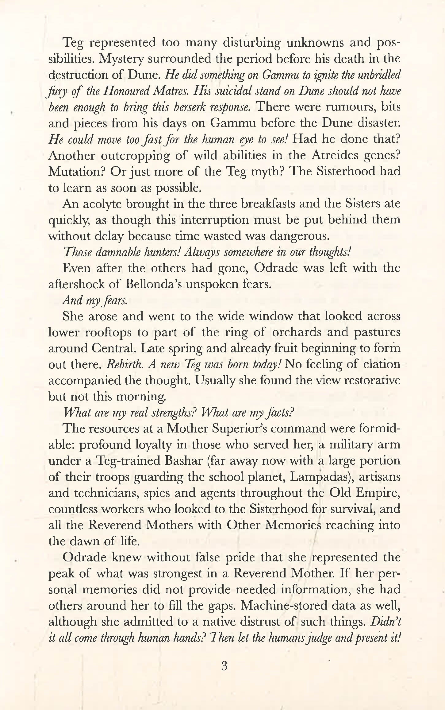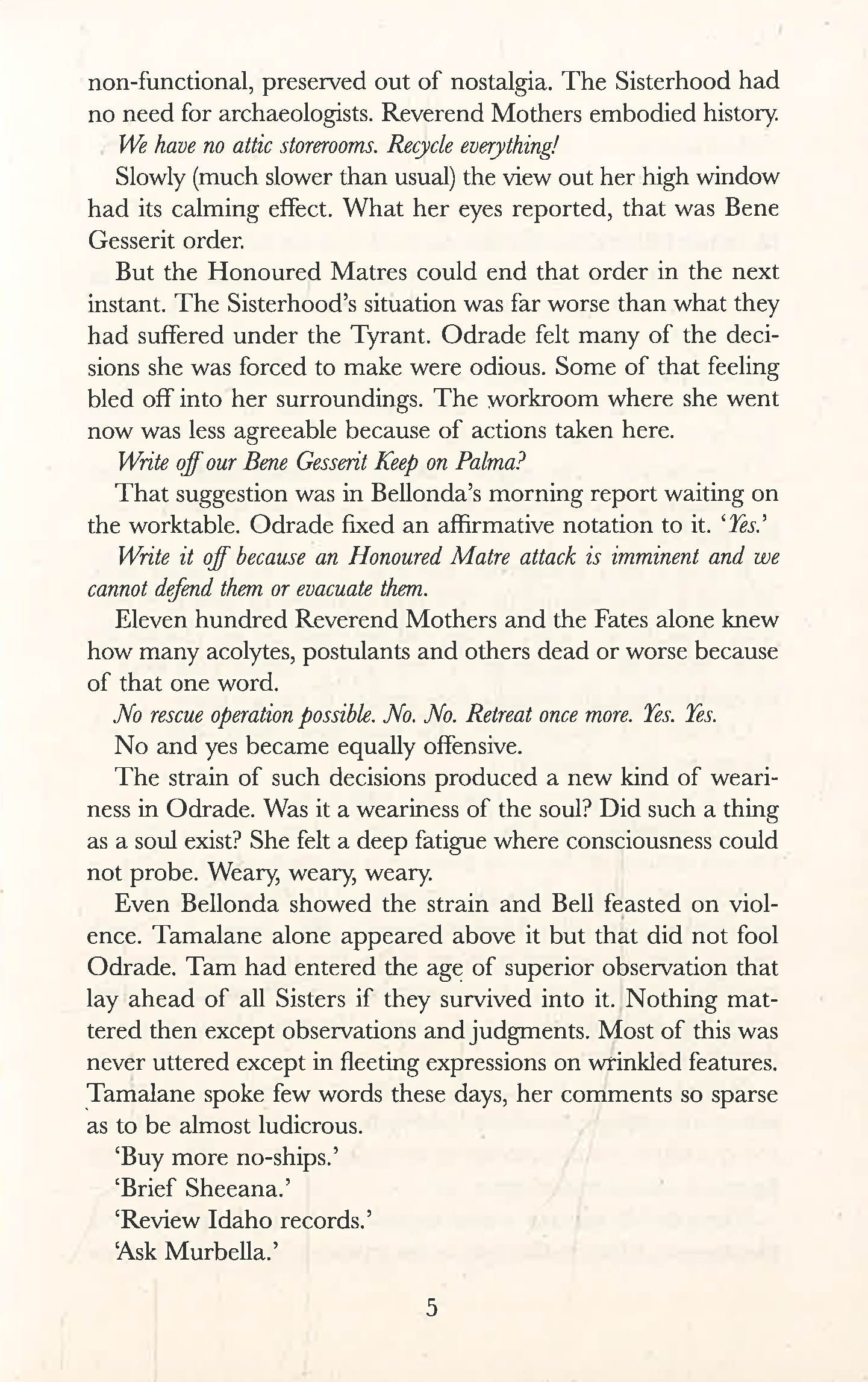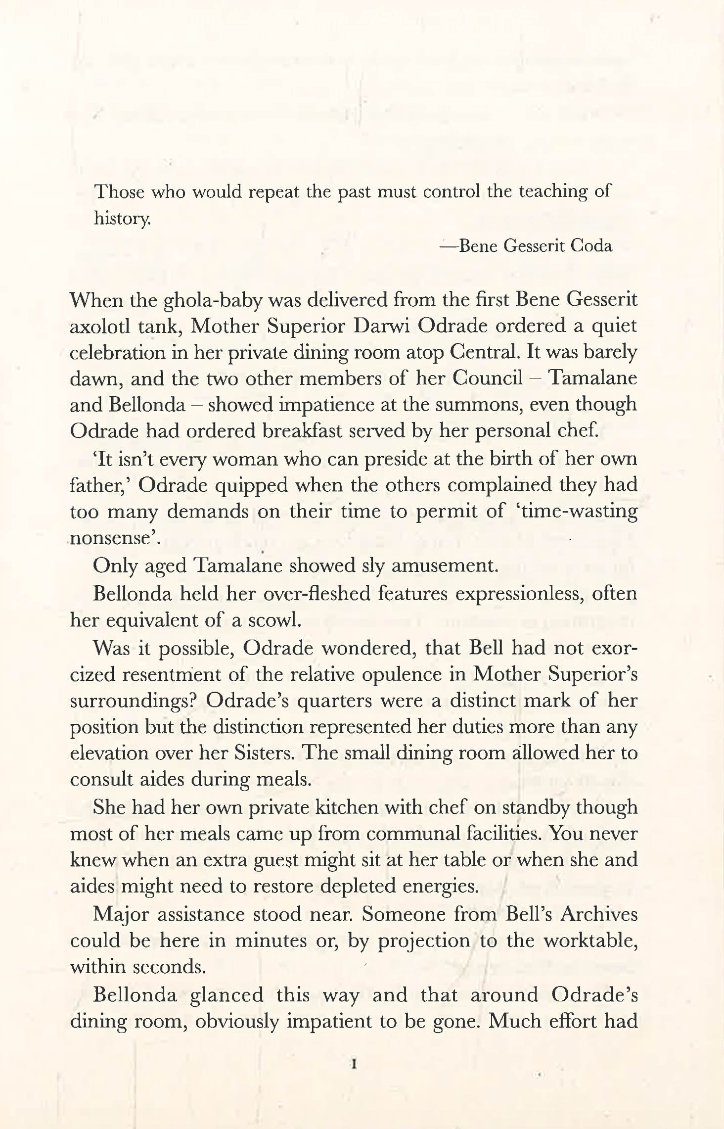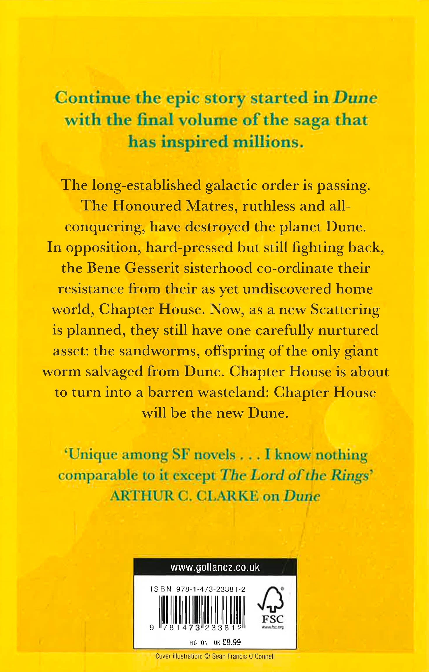 The long-established galactic order is passing. The Honoured Matres, ruthless and all-conquering, have destroyed the planet Dune. In opposition, hard-pressed but still fighting back, the Bene Gesserit sisterhood co-ordinate their resistance from their as-yet undiscovered home world, Chapter House.