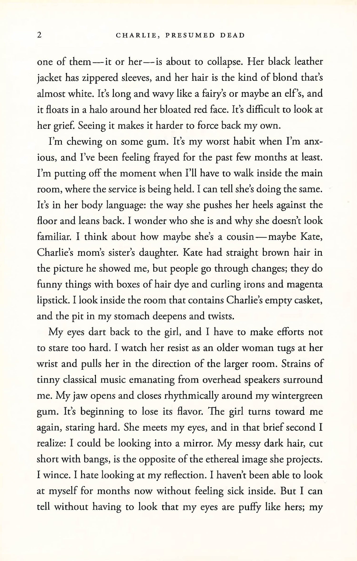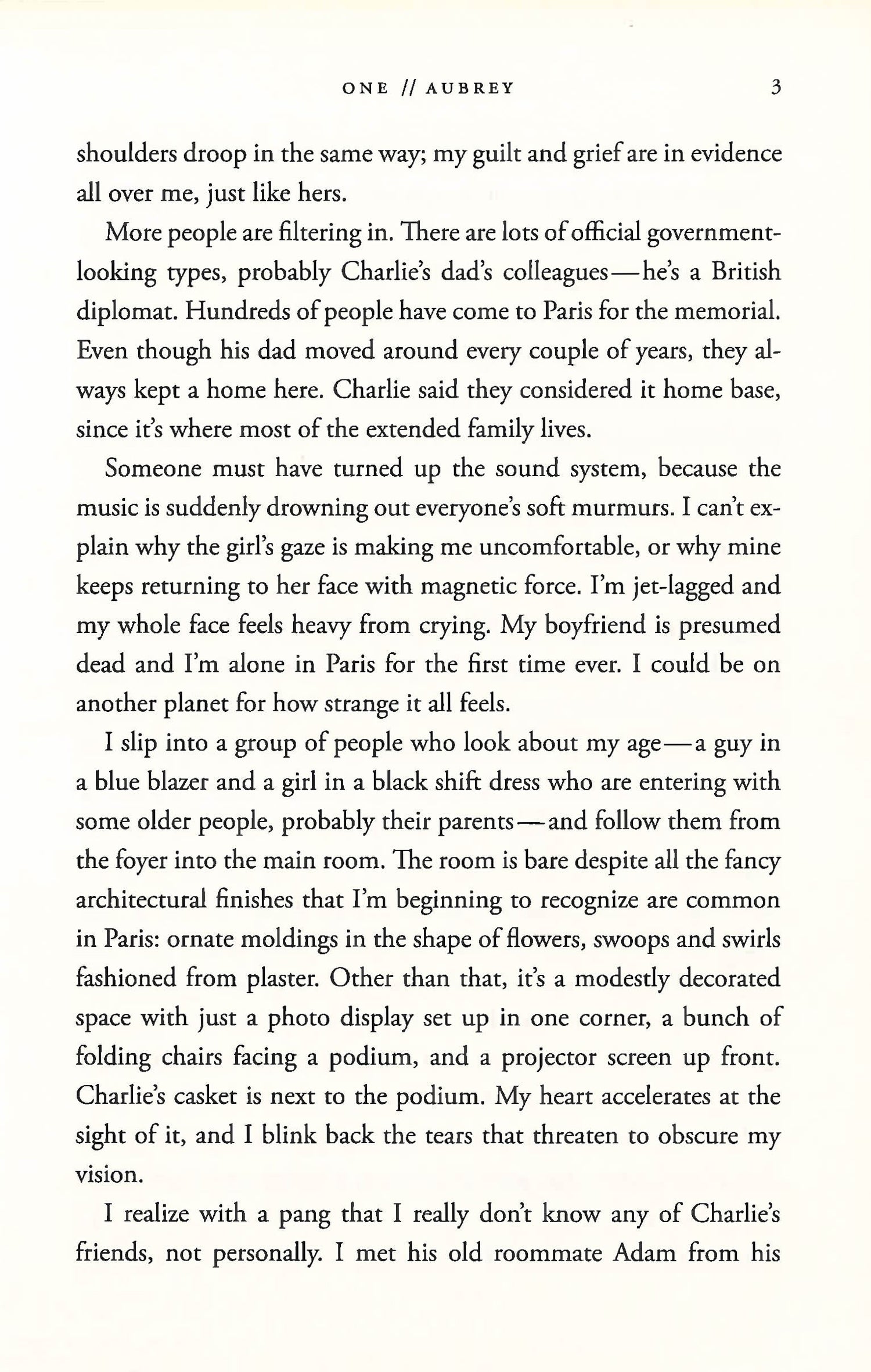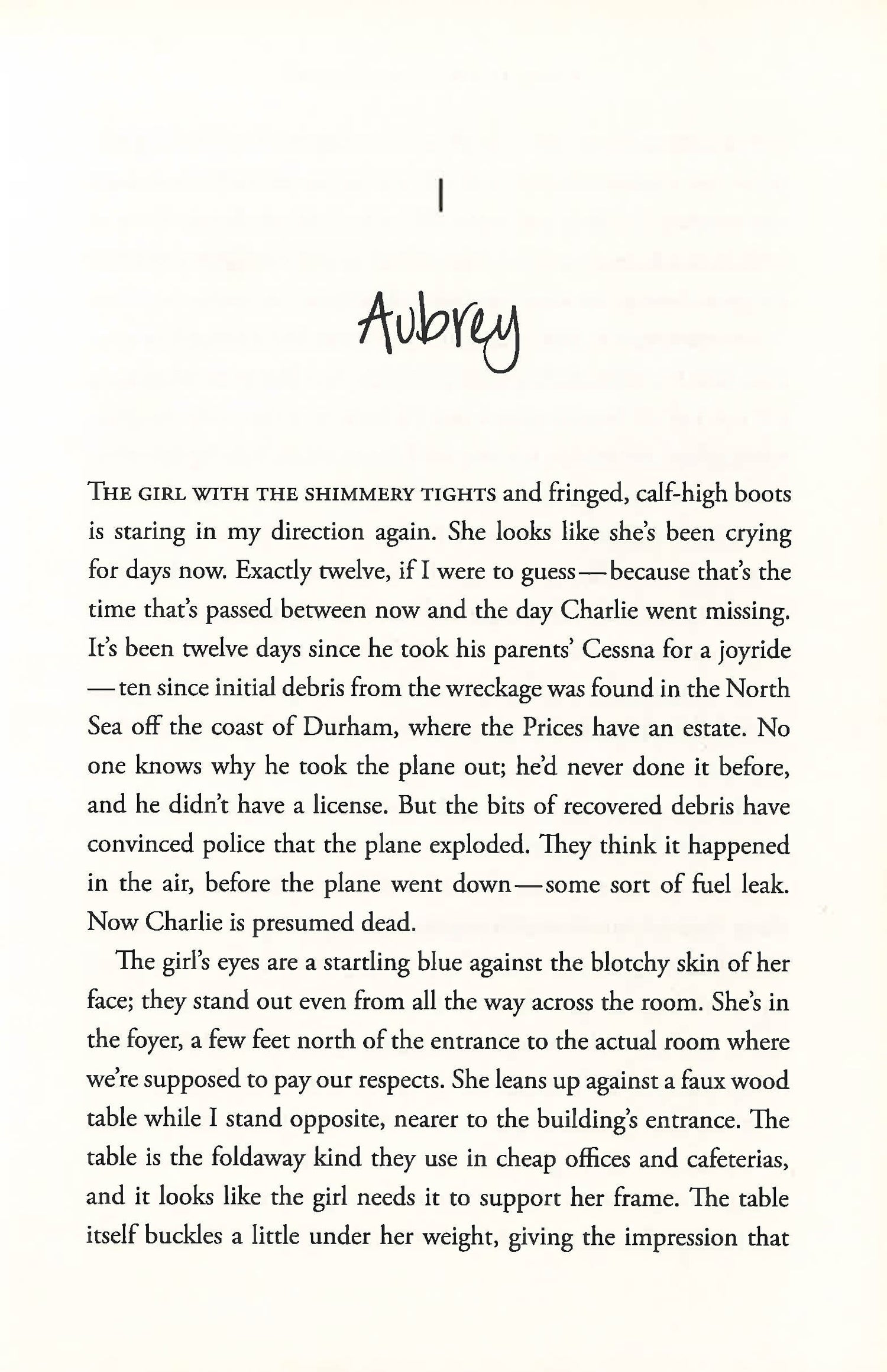 In Paris, family and friends gather to mourn the tragic passing of Charlie Price--young, handsome, charming, a world-traveler--who is presumed dead after an explosion. Authorities find only a bloodied jacket, ID'd as Charlie's. At the funeral, two teens who are perfect strangers, Lena Whitney and Aubrey Boroughs, make another shocking discovery: they have both been dating Charlie, both think Charlie loved them and them alone, and there is a lot they didn't know about their boyfriend. Over the next week, a mind-bending trip unfolds: first in London--then in Mumbai, Kerala, and Bangkok, the girls go in search of Charlie. Is he still alive? What did their love for him even mean? The truth is out there, but soon it becomes clear that the girls are harboring secrets of their own.