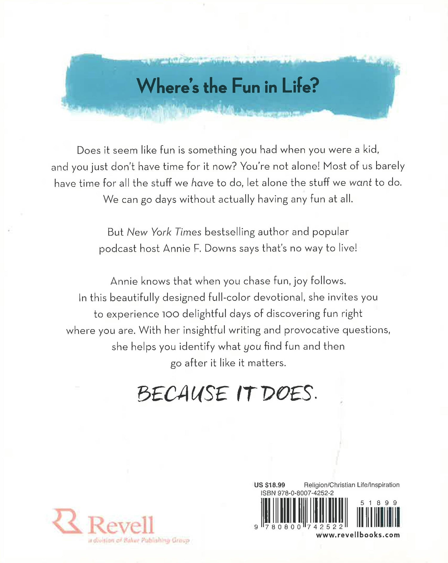 Annie knows that when you chase fun, joy follows. In this beautifully designed full-color devotional, she invites you to experience 100 delightful days of discovering fun right where you are. With her insightful writing and provocative questions, she helps you identify what you find fun and then go after it like it matters.