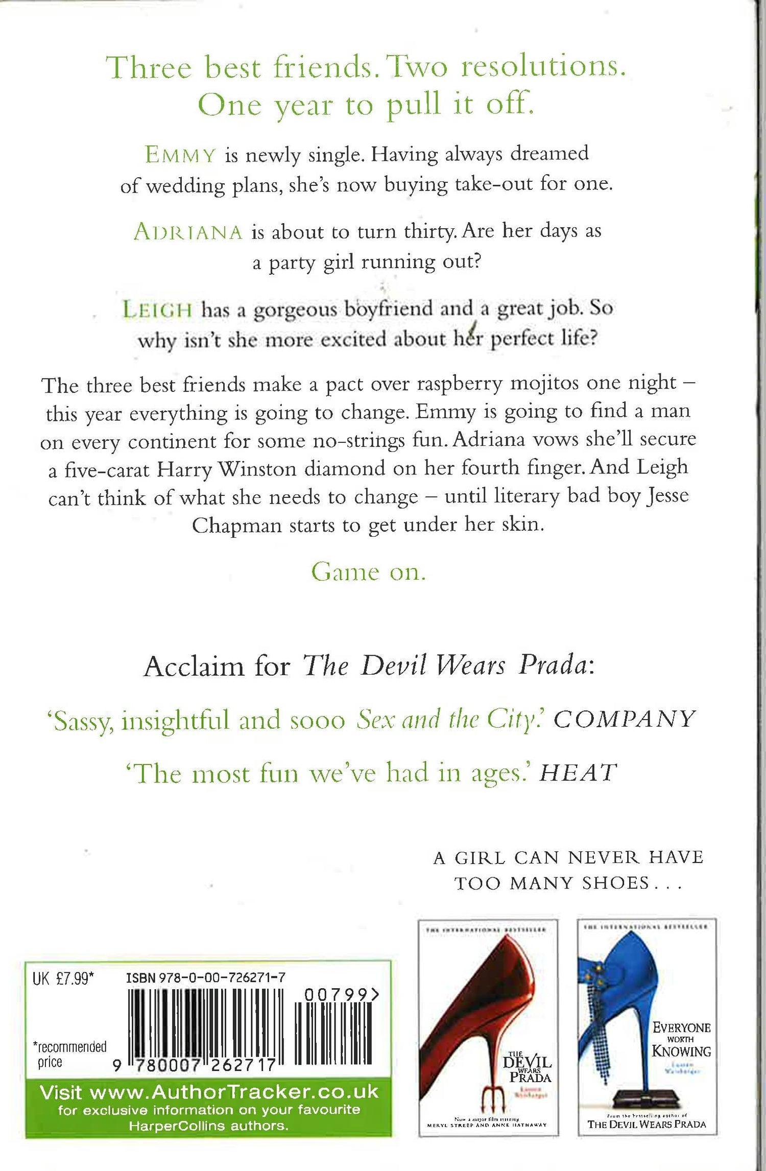 Meet Emmy, Leigh, and Adriana. Best friends since college, each has seen her share of career foils and romantic foibles over the past decade. Now, as they approach thirty, they're looking toward their future...but despite all the success and luxuries they've attained-they're not quite sure they like what they see. When they are each alone for one reason or another on Valentine's Day, the trio makes a pact. Within one year, each woman will change the thing that most challenges her. For Emmy, whose boyfriend of five years just left her for a personal trainer, it will be to find romance-or a fling-in every foreign country she visits. For Leigh, a book editor with a dream boyfriend and dream apartment, no change seems necessary-until she starts to notice a brilliant and brooding man named Jesse. And for commitment-phobic, drop-dead-gorgeous Adriana, her goal is to have an engagement ring and a house in Scarsdale. Each woman starts the first day of the year with the best of intentions-which is exactly why the pact goes immediately, and exceptionally, awry. Book has remainder mark.