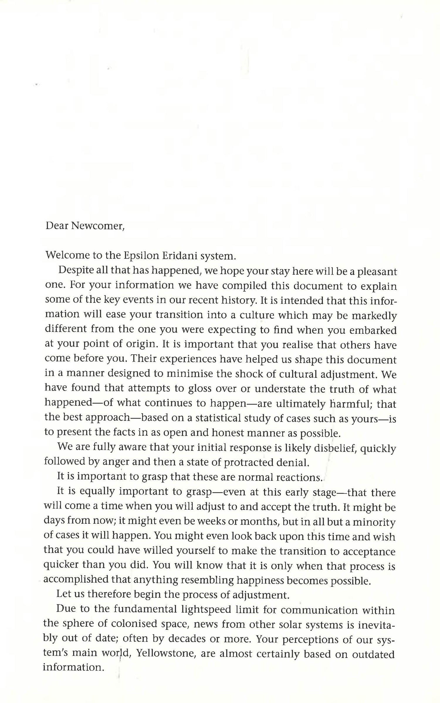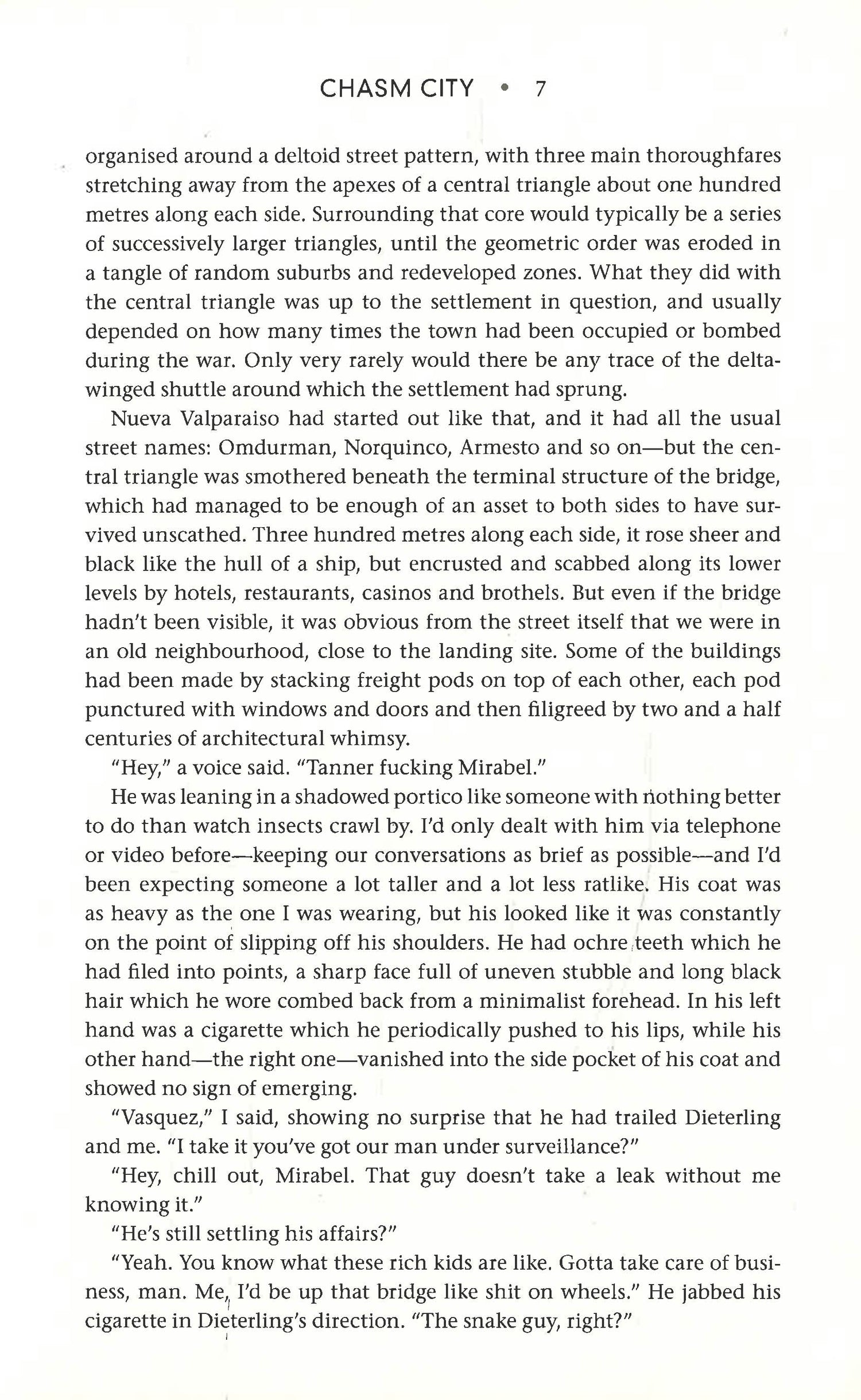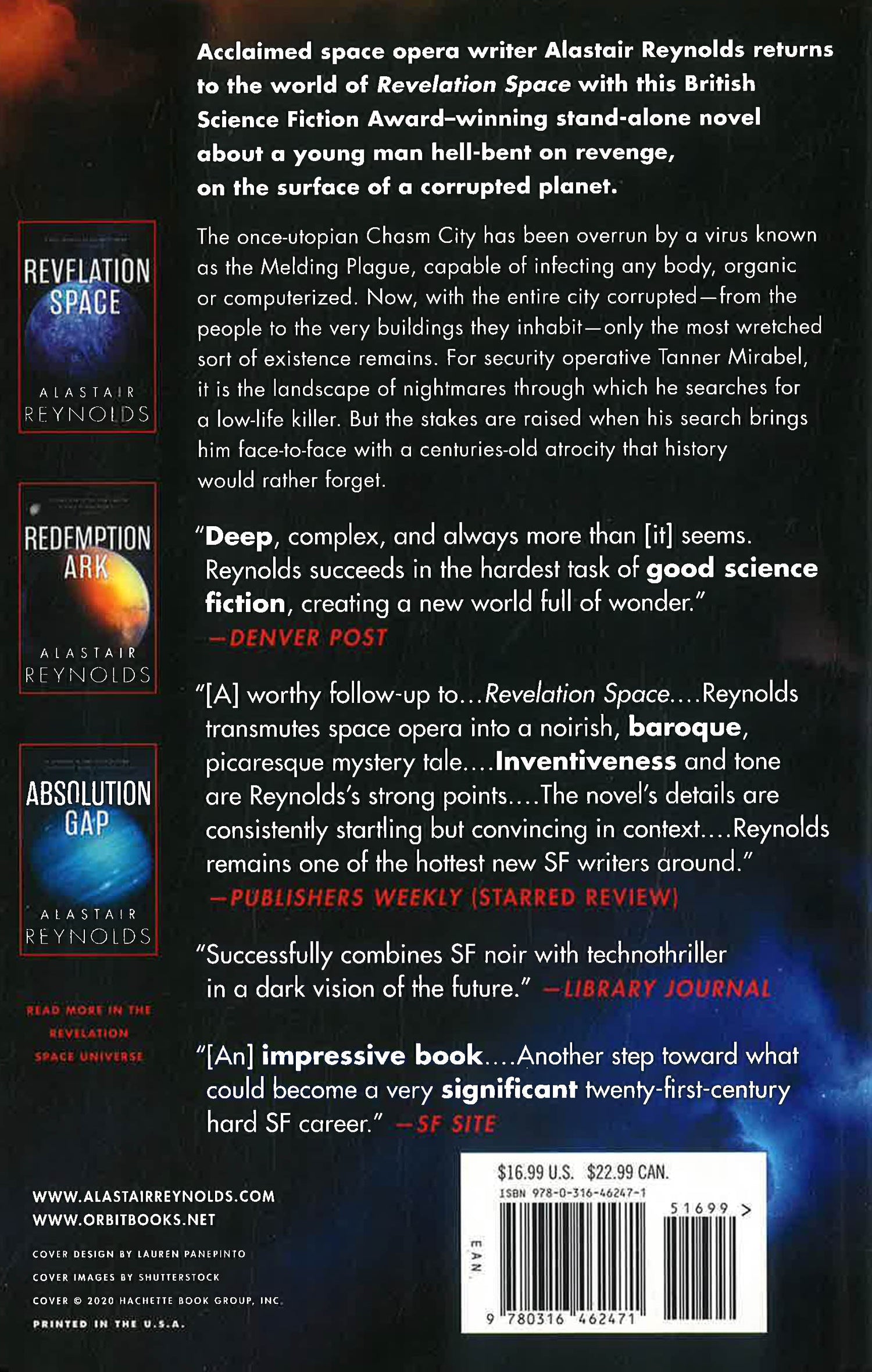 The once-utopian Chasm City -- a domed human settlement on an otherwise inhospitable planet -- has been overrun by a virus known as the Melding Plague, capable of infecting any body, organic or computerized. Now, with the entire city corrupted -- from the people to the very buildings they inhabit -- only the most wretched sort of existence remains. For security operative Tanner Mirabel, it is the landscape of nightmares through which he searches for a lowlife postmortal killer. But the stakes are raised when his search brings him face to face with a centuries-old atrocity that history would rather forget.