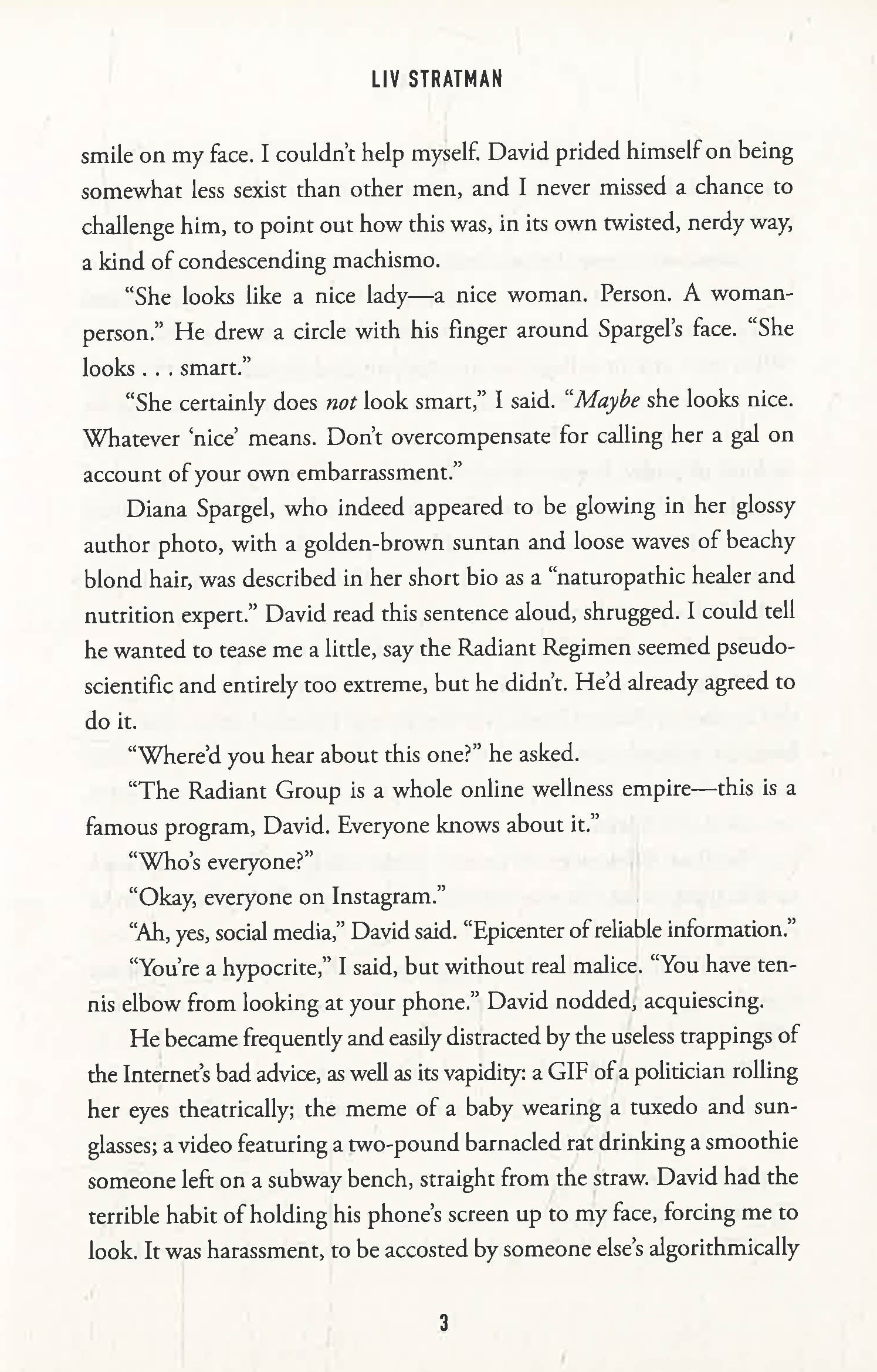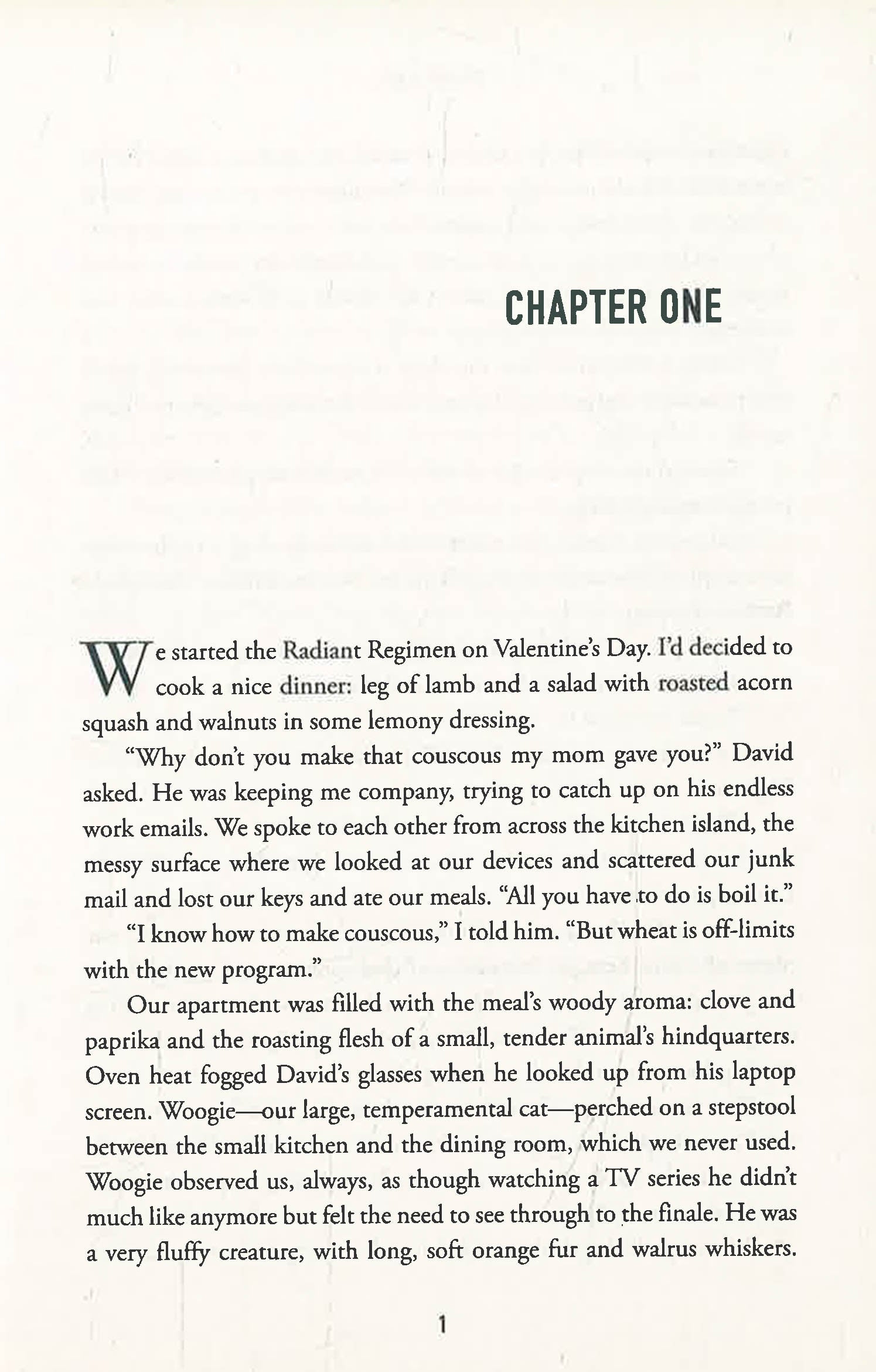 Kit and David were college sweethearts. Now married and in their thirties, they live in Kit’s childhood home in Bay Ridge, Brooklyn. While David has a successful career, jetting off on work trips to exciting destinations, Kit is stuck in a loop. She keeps quitting her job managing her sister’s bakery to seek a more ambitious profession, but fear of failure always brings her back to Sweet Cheeks. Kit finds a fraught solace in cycling through fad diets, which David, in his efforts to be supportive, follows along with her. Their latest program is the Radiant Regimen, an intense cleanse, and Kit is optimistic about embarking on a new chapter of healthy eating and self-control.