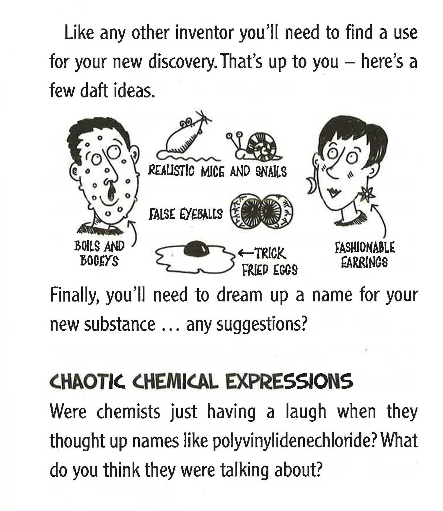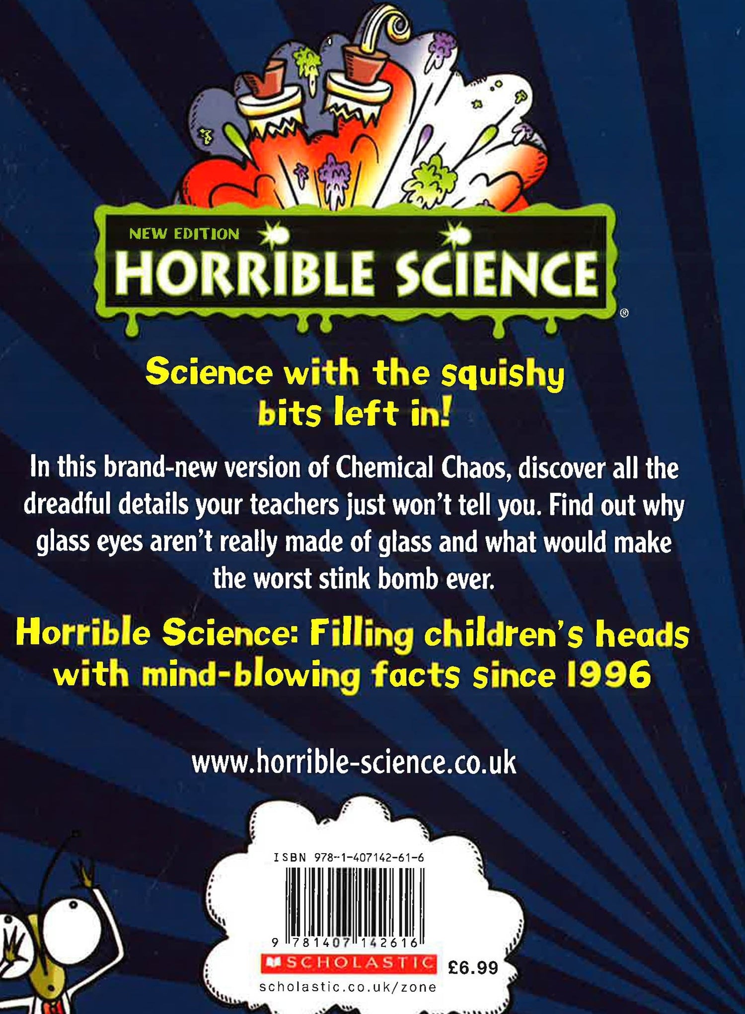 In HORRIBLE SCIENCE: CHEMICAL CHAOS forget the fiendish formulas and take a look at the nasty bits you REALLY want to know about -the bubbling green mixtures, the vile and poisonous potions, the horrible smells, bangs and blasts. Discover how the first chemists - "alchemists" - really searched for the Philosopher's Stone, what suspect substances lurk in your school dinner, the sickening stench of the world's worst stink bomb and which awful acids will eat you alive. Cook up chemical chaos with a gooey book of facts. Brew a potion, wave a test-tube and be blown away by Chemistry! Redesigned in a bold, funky new look for the next generation of HORRIBLE SCIENCE fans.