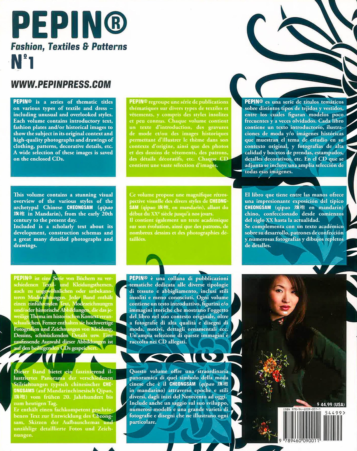 PEPIN is a series of thematic titles on various types of textile and dress - including unusual and overlooked styles. Each volume contains introductory text, fashion plates an/or historical images to show the subject in its original context and high-quality photographs and drawings of clothing, patterns, decorative details, etc. A wide selection of these images is saved on the enclosed CDs.The extremely elegant and feminine Cheongsam is a quintessential Chinese women's dress of the 20th century - in its modern form, a fusion of traditional Chinese costume and western fashion. CHEONGSAM contains a stunning visual overview of the various styles of the archetypal Chinese cheongsam (qipao in Mandarin), from the early 20th century to the present day. Included is a scholarly text about its development, construction schemas and a great many detailed photographs and drawings.