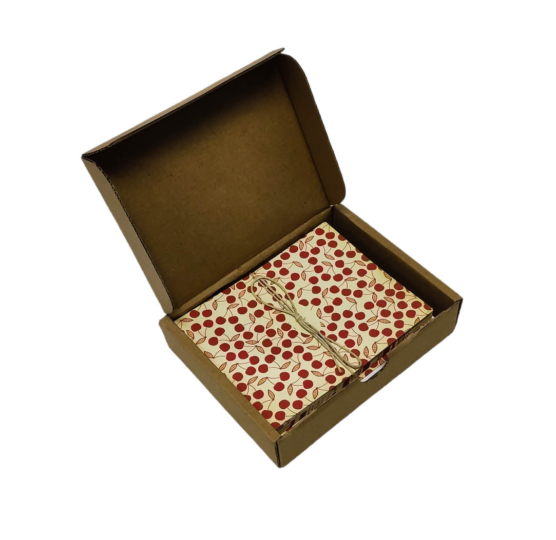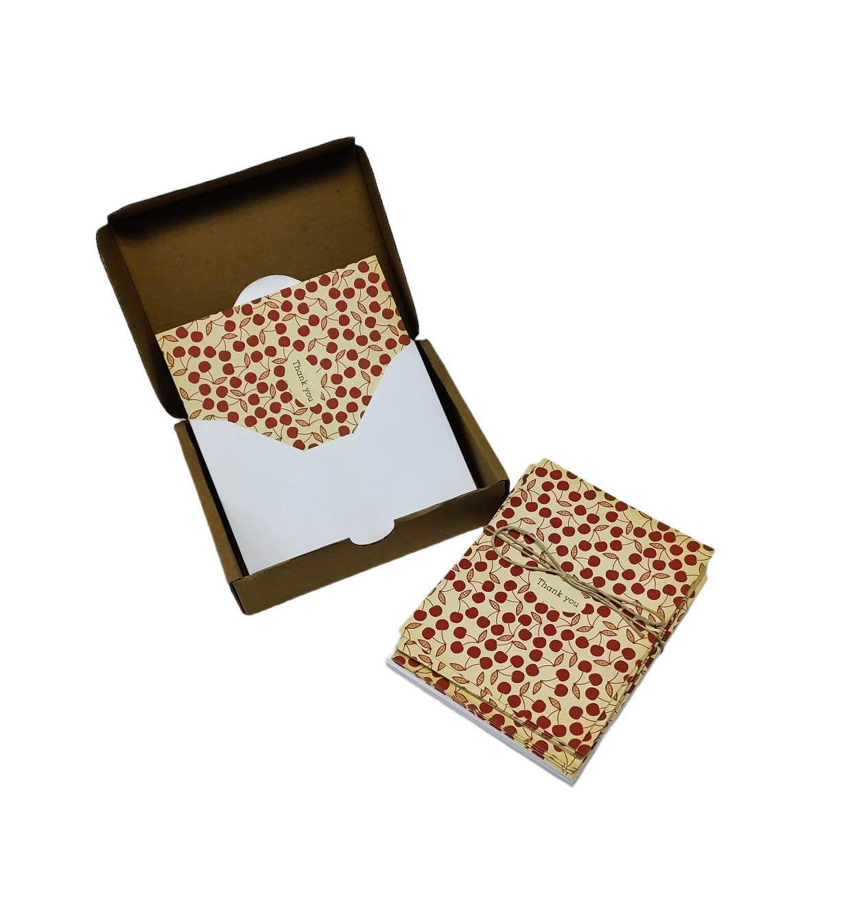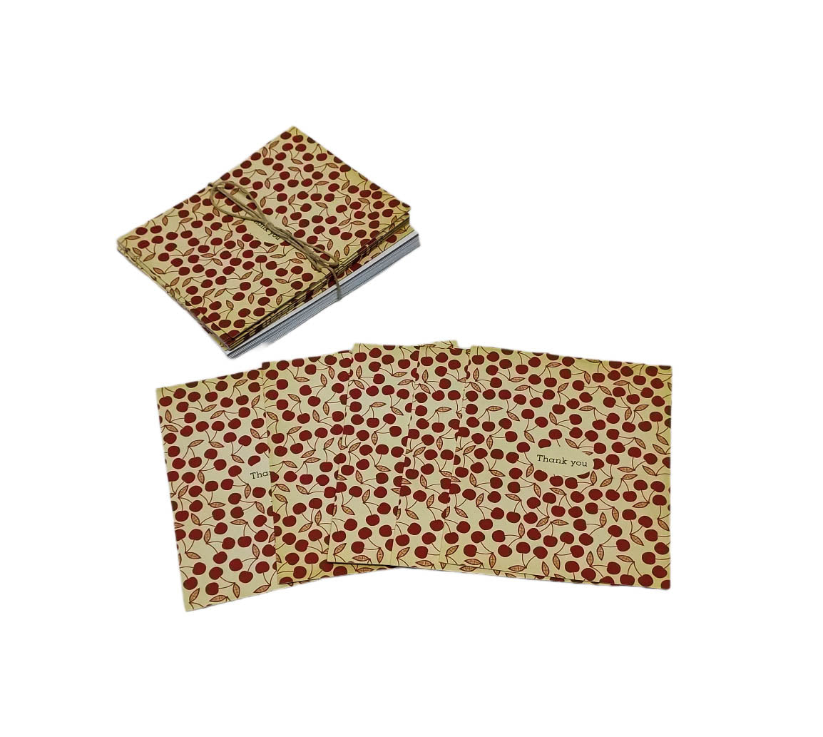 16 "Thank You" notecards & 16 envelopes. Cards, envelopes and packaging made with recycled materials. Packaged in a flip-top box made from corrugated cardboard. Printed with soy-based inks on luxurious uncoated paper stock Bundled together with a decorative twine tie.